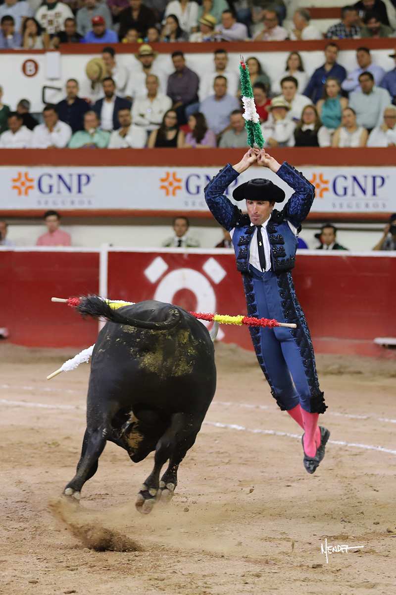 Pero vino el séptimo, llamado “Claridoso”, de la divisa de Tequisquiapan, al que Emilio veroniqueó enclasado, lo llevó al caballo por chicuelinas caminándole y quitó por chicuelinas intercalando una tafallera. Con la muleta, comenzó de rodillas dando derechazos de calidad y, de pie, remató con el ayudado por bajo y el de pecho. Pulsando el engaño con la mano diestra, se dio gusto en dos series haciendo el toreo templado, tirando del toro y mandando. Luego, se deshizo del ayudado para ligar derechazos y naturales de brillante trazo, adornando con molinetes y los de pecho. Al natural se mantuvo en ese lucido nivel, corriendo la mano con aroma. De nuevo, con la mano diestra volvió a hacer el toreo lento, aderezando todo con otro molinete, el de pecho y el de trinchera. Terminó de estocada aguantando para que le fueran concedidas las orejas y, por ello, al final, ser paseado y sacado en hombros por la Puerta Grande de “San Marcos”.