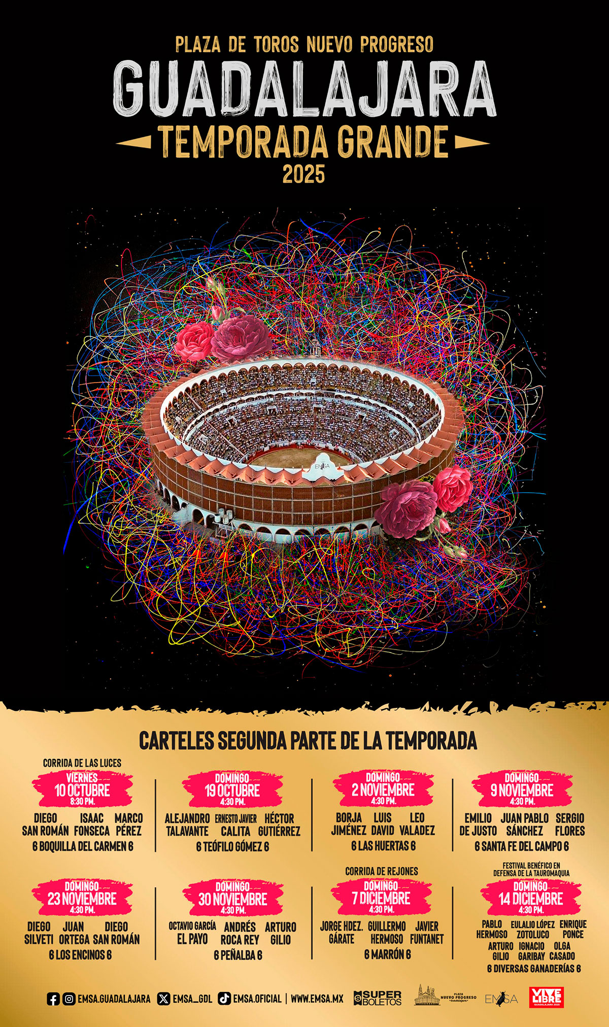 La empresa “Espectáculos Monterrey” (EMSA), por medio de la coordinación operativa del coso Monumental “Nuevo Progreso” de Guadalajara, Jalisco, anuncia los carteles para la que será la II parte de la Temporada Grande 2025, del viernes 10 de octubre al domingo 14 de diciembre.