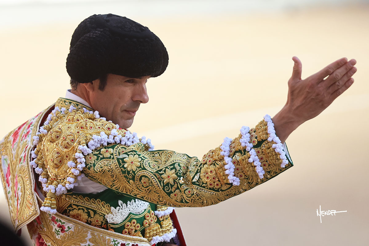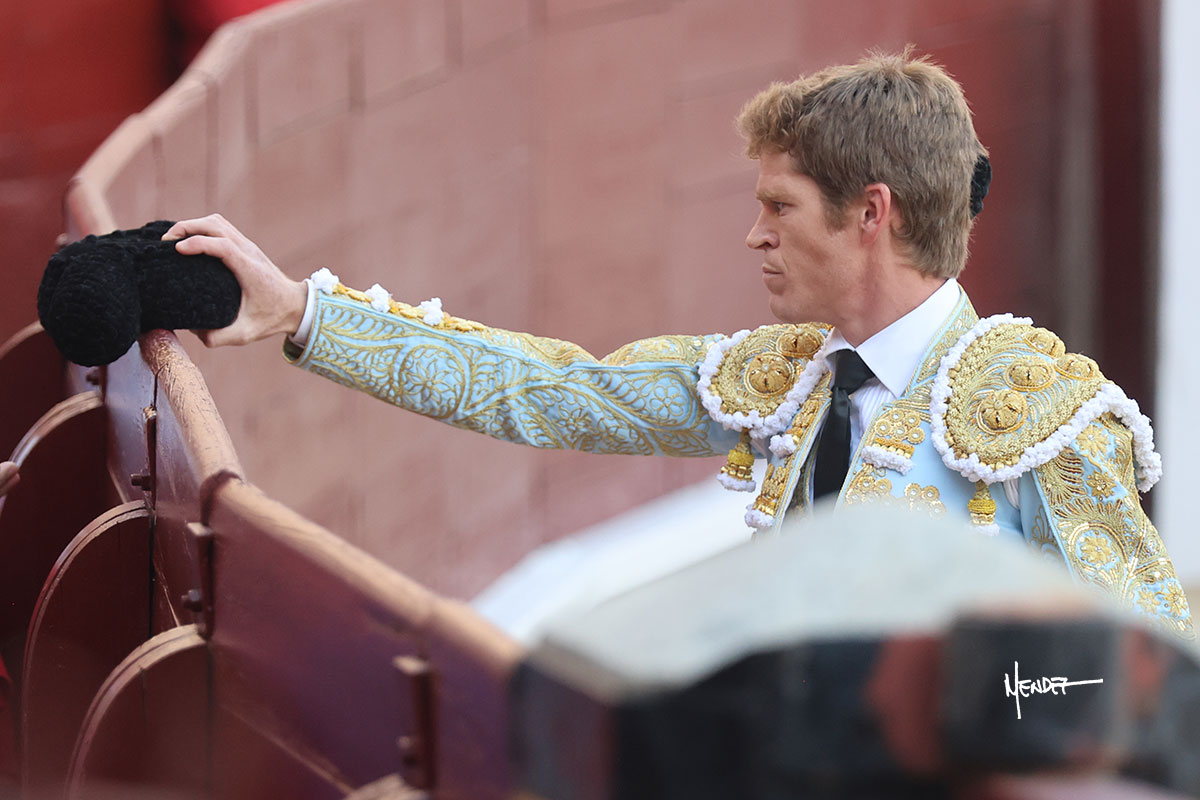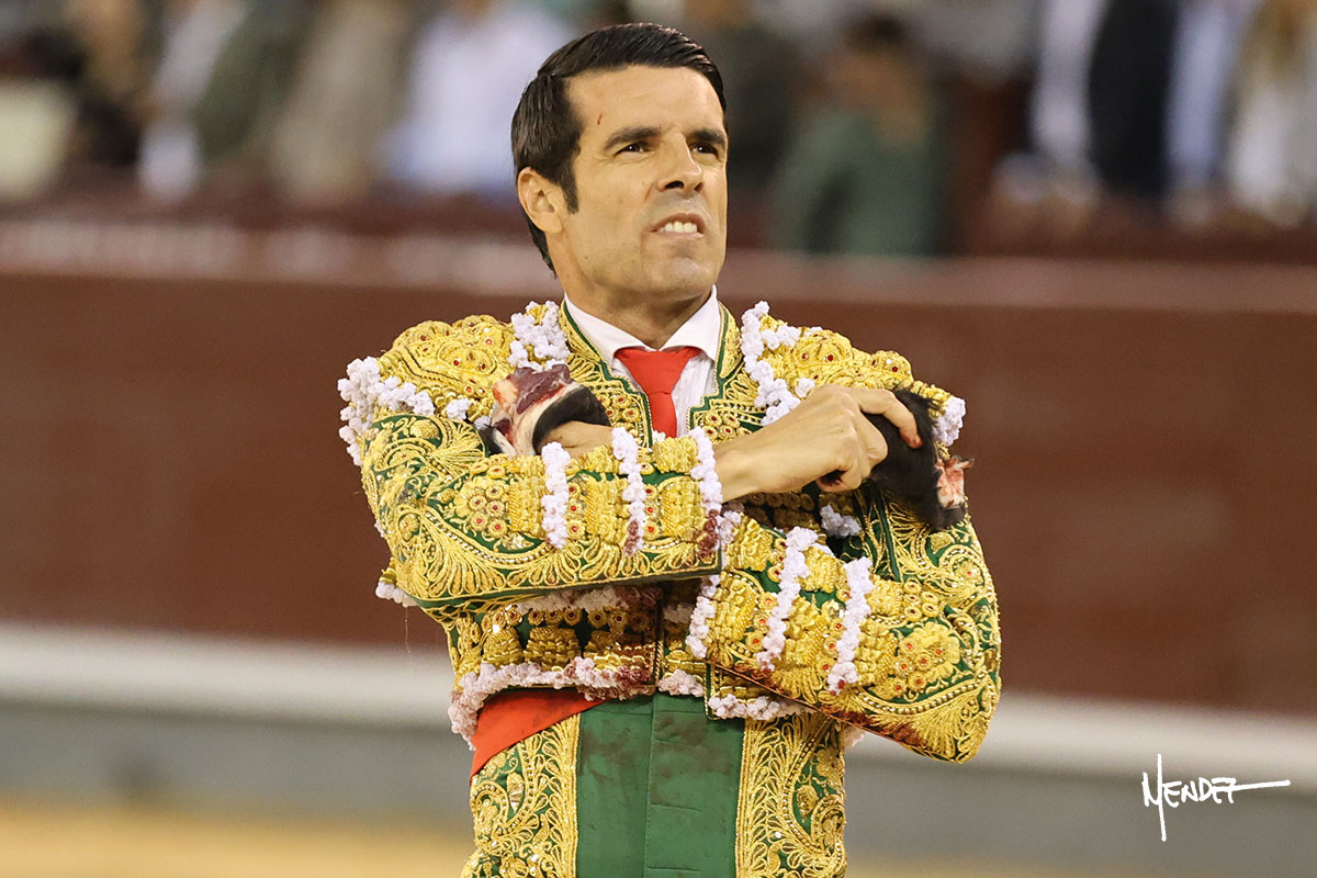 Salió Emilio de Justo para recibir al segundo de su lote y sexto de la tarde. Lo recibió de rodillas, al hilo de las tablas, para después estirarse con el a base de verónicas bien realizadas. Se alcanzó la faena de muleta y el diestro brindó al público desde los medios. Se dispuso a torear al natural para comenzar su labor, envolviéndoselo con ritmo y calado. Se la dejó puesta abajo y sobre el pitón derecho tiró de la embestida, creando una tanda que levantó al respetable. Dosificó y dio tiempo y sitio a su oponente, que se entregó con prontitud y obediencia, siguiendo el engaño por abajo, aunque con algún que otro derrote. Se lo pasó muy cerca y llegó con mucha fuerza. Cambió al pitón izquierdo, toreando a base de profundidad y clase, cautivando. La faena estaba hecha y él lo sabía, metió el acero y cortó las dos orejas.