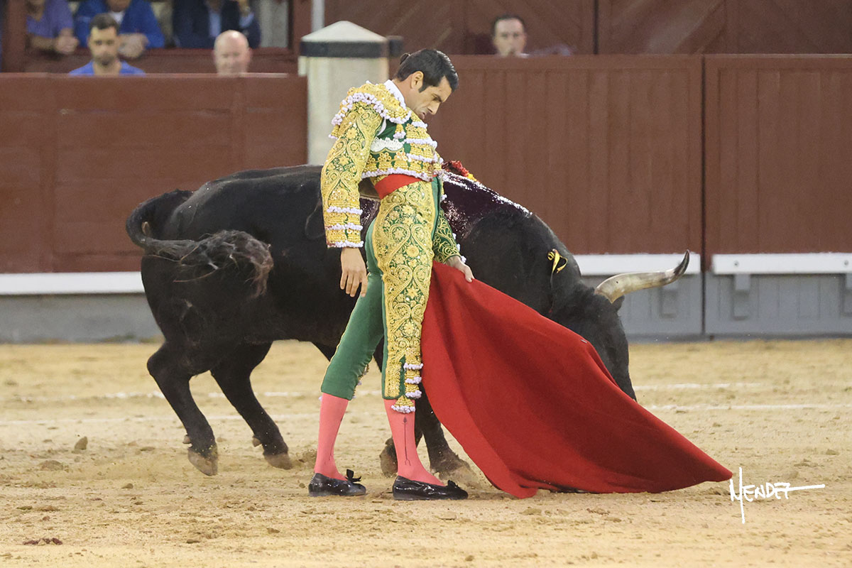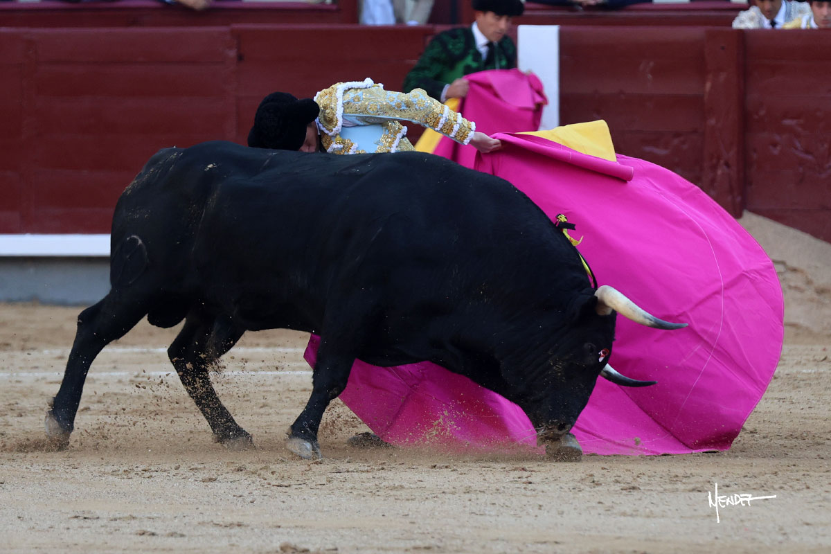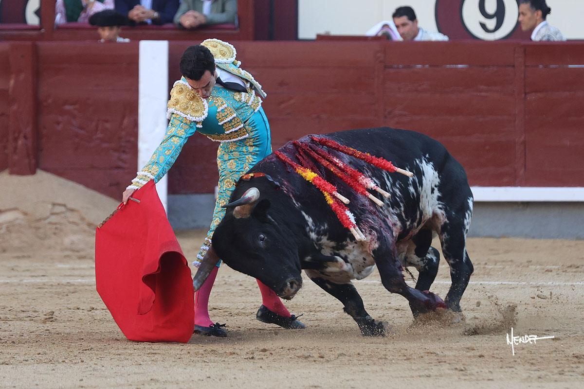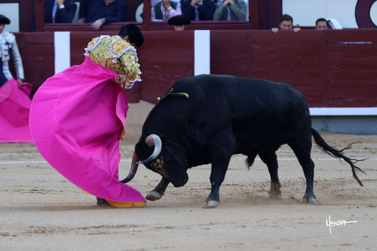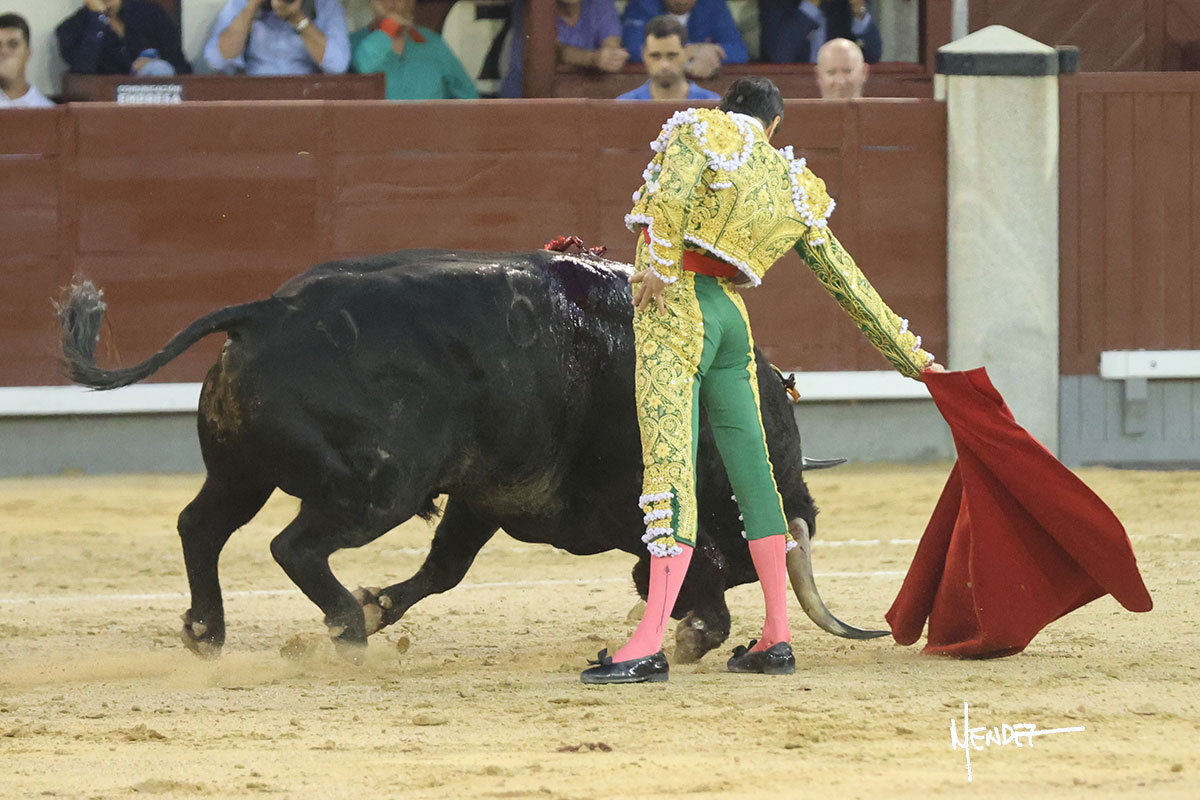 Salió suelto el quinto, al que llegó Borja Jiménez sin poder estirarse con el. Lo recibió en la muleta bajo los terrenos del siete, tanteándolo por ambos pitones, bajándole la mano. Se lo llevó más allá del tercio y siguió sobre el derecho, envolviéndoselo en una tanda aplaudida en los tendidos. Le dio tiempo y sitio para continuar por el derecho, tocando y llevando, pasando a un toro que humillaba y seguía el engaño. Supo dosificar muy bien el sevillano, desarrollando tandas cortas, pero bien llevadas. Cambió al natural, logrando algunos pases largos y profundos, aunque no suficientes para redondear su labor. Sin llevarlo más allá del tercio, siguió con un toreo a pies juntos y aunque el toro pasaba, sus embestidas no tenían el suficiente calado. Culminó metido entre pitones, poniendo todo, estando por encima de su oponente.