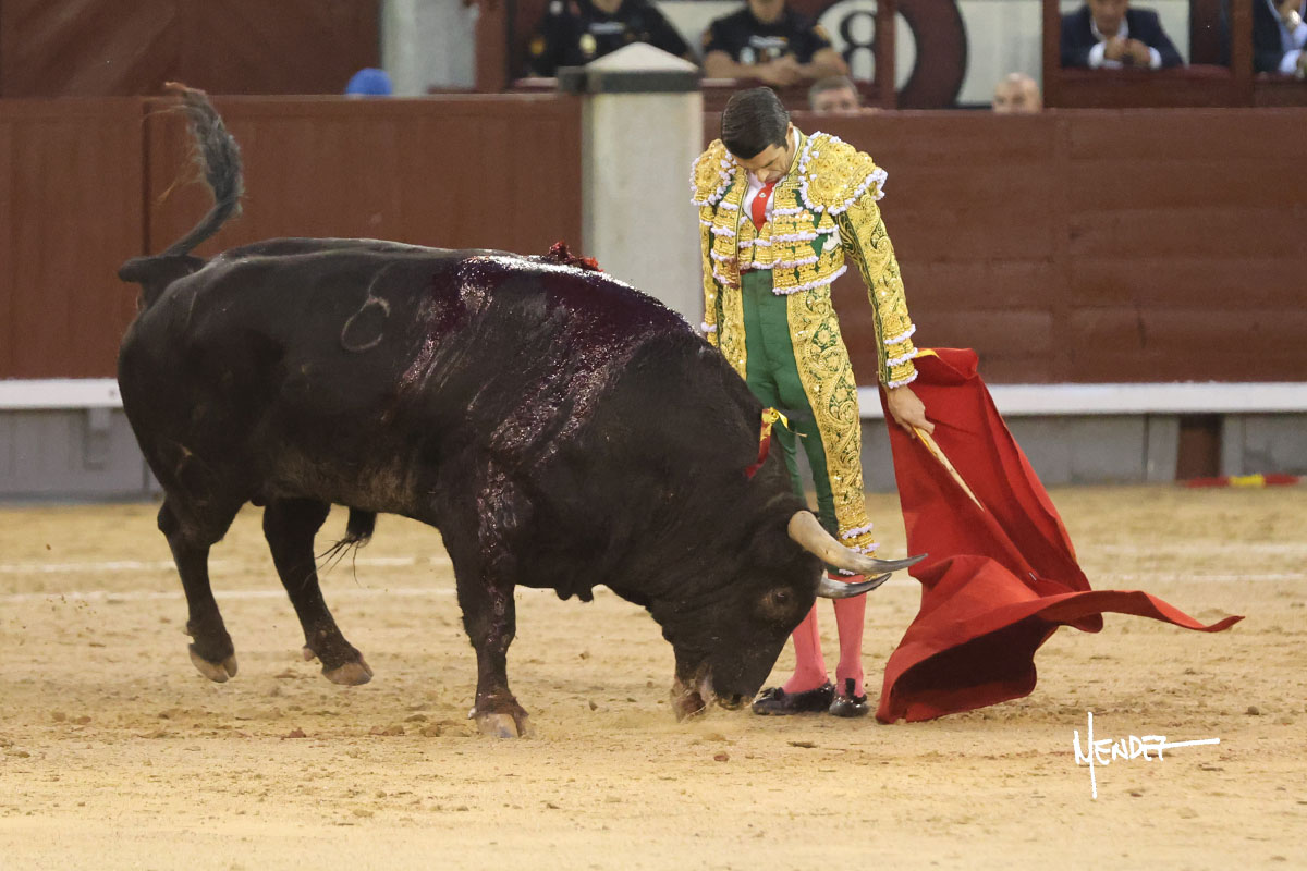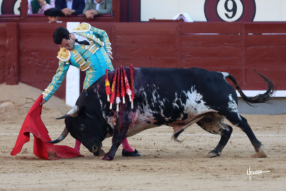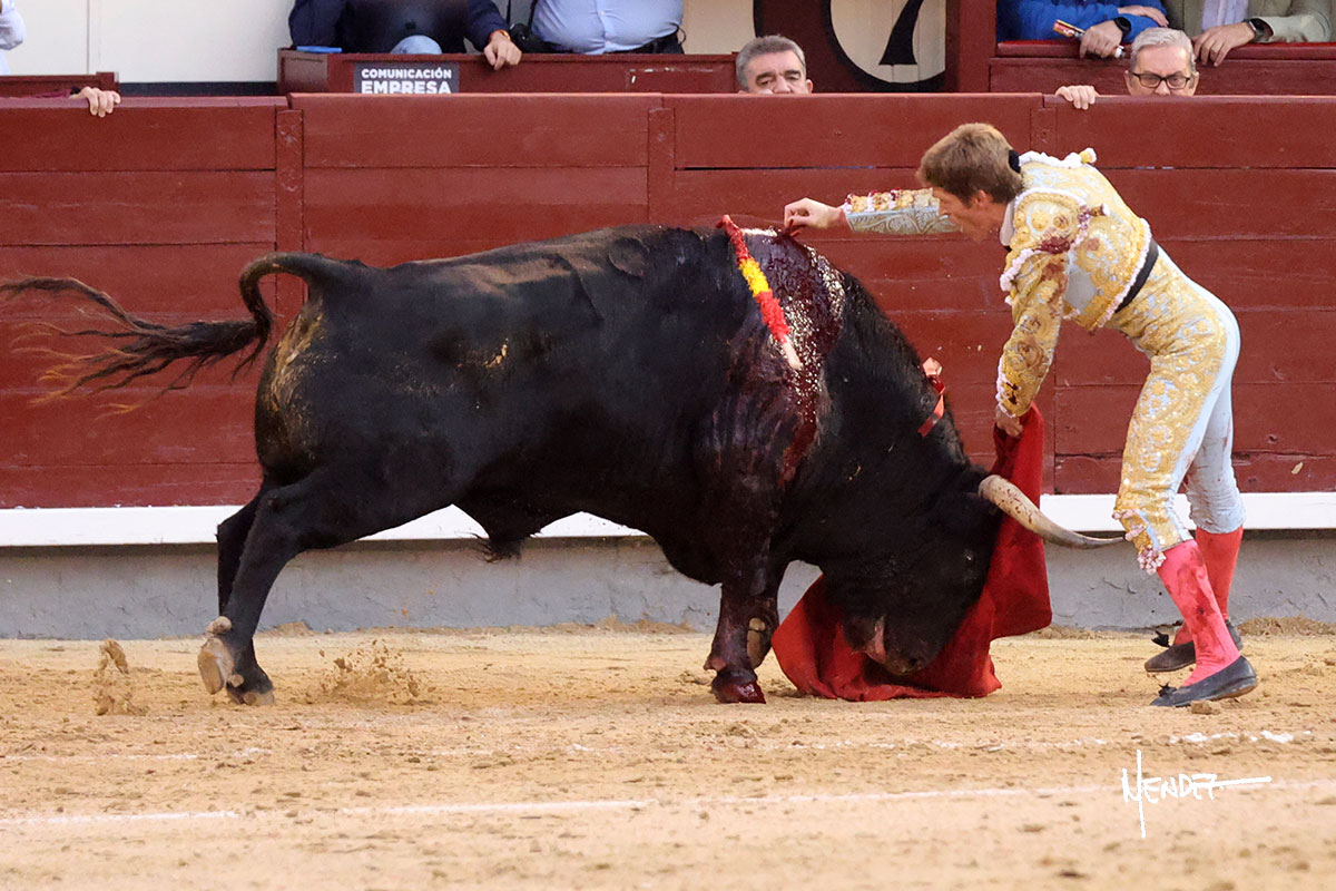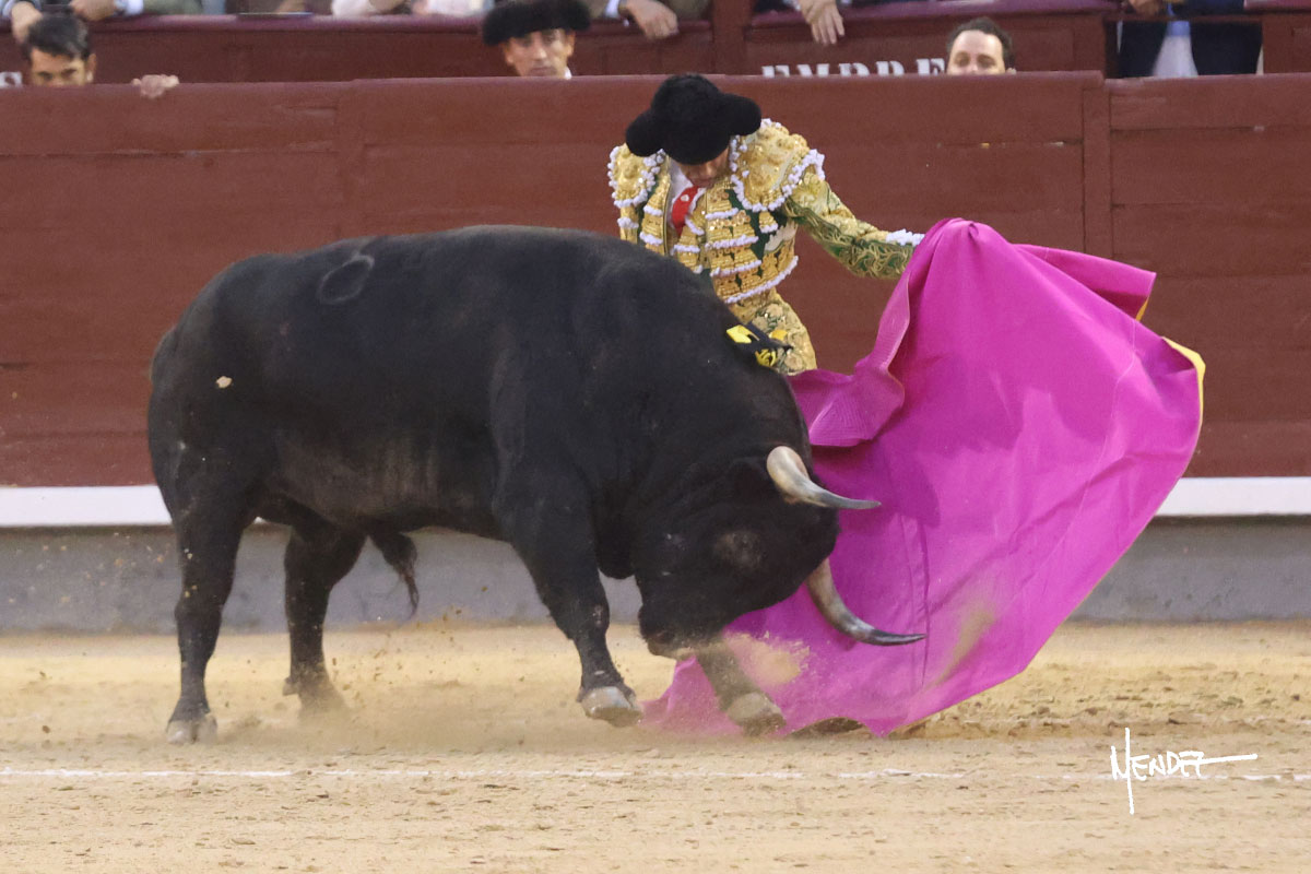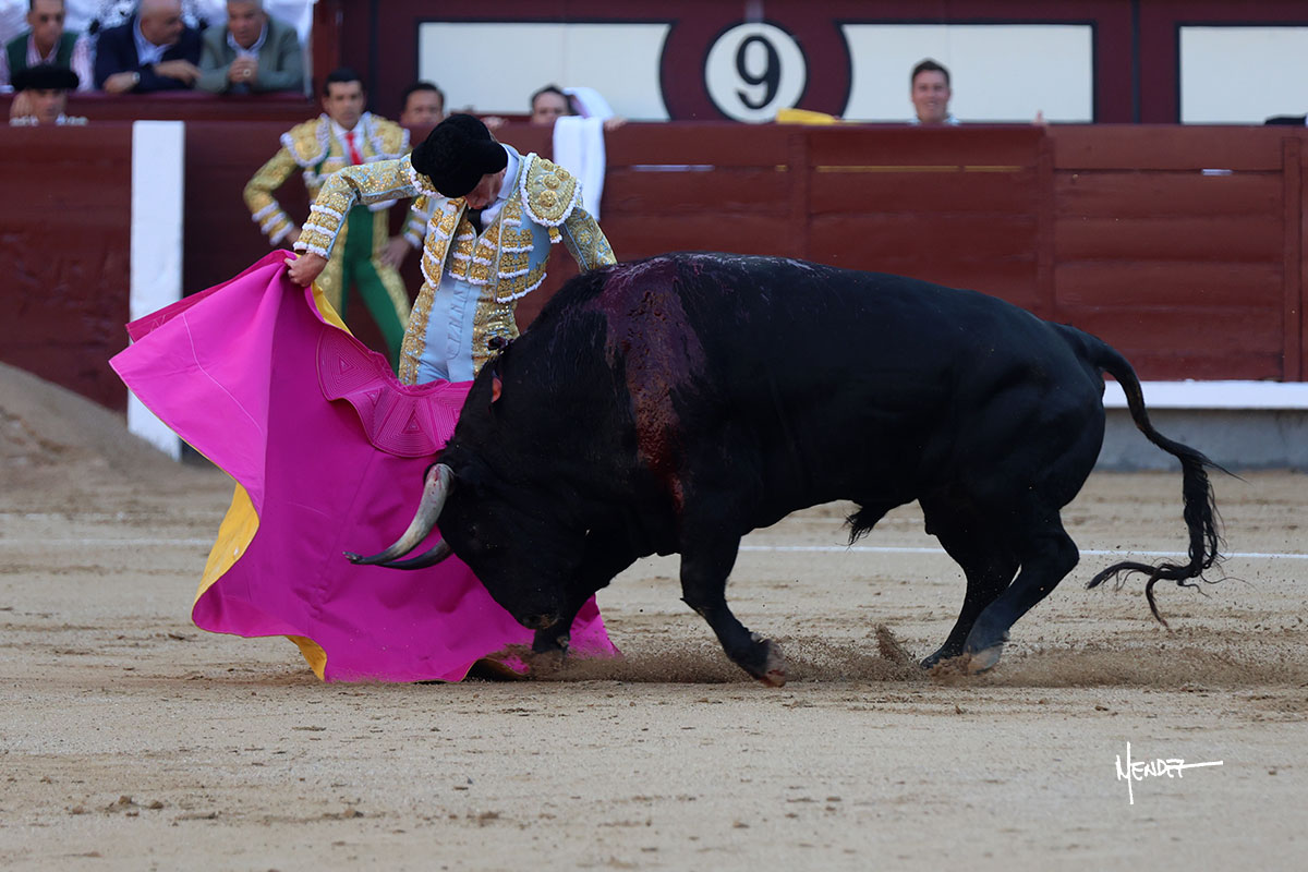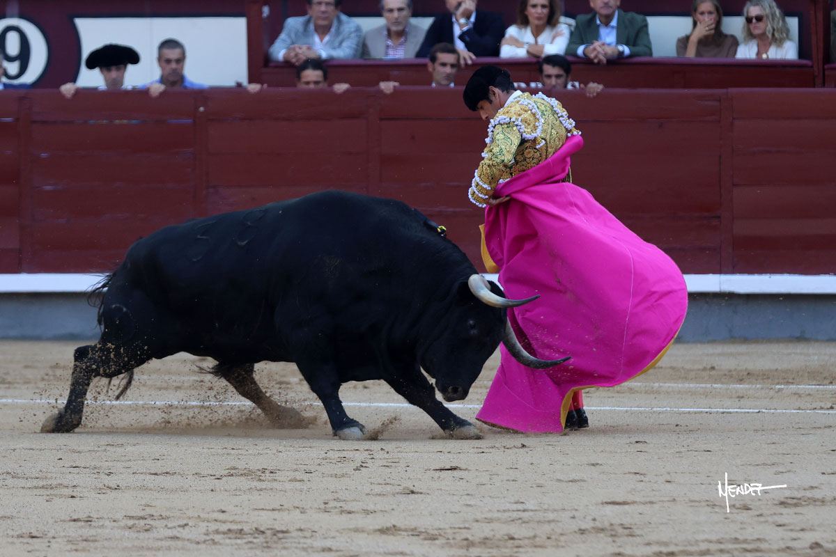 Salió suelto el quinto, al que llegó Borja Jiménez sin poder estirarse con el. Lo recibió en la muleta bajo los terrenos del siete, tanteándolo por ambos pitones, bajándole la mano. Se lo llevó más allá del tercio y siguió sobre el derecho, envolviéndoselo en una tanda aplaudida en los tendidos. Le dio tiempo y sitio para continuar por el derecho, tocando y llevando, pasando a un toro que humillaba y seguía el engaño. Supo dosificar muy bien el sevillano, desarrollando tandas cortas, pero bien llevadas. Cambió al natural, logrando algunos pases largos y profundos, aunque no suficientes para redondear su labor. Sin llevarlo más allá del tercio, siguió con un toreo a pies juntos y aunque el toro pasaba, sus embestidas no tenían el suficiente calado. Culminó metido entre pitones, poniendo todo, estando por encima de su oponente.