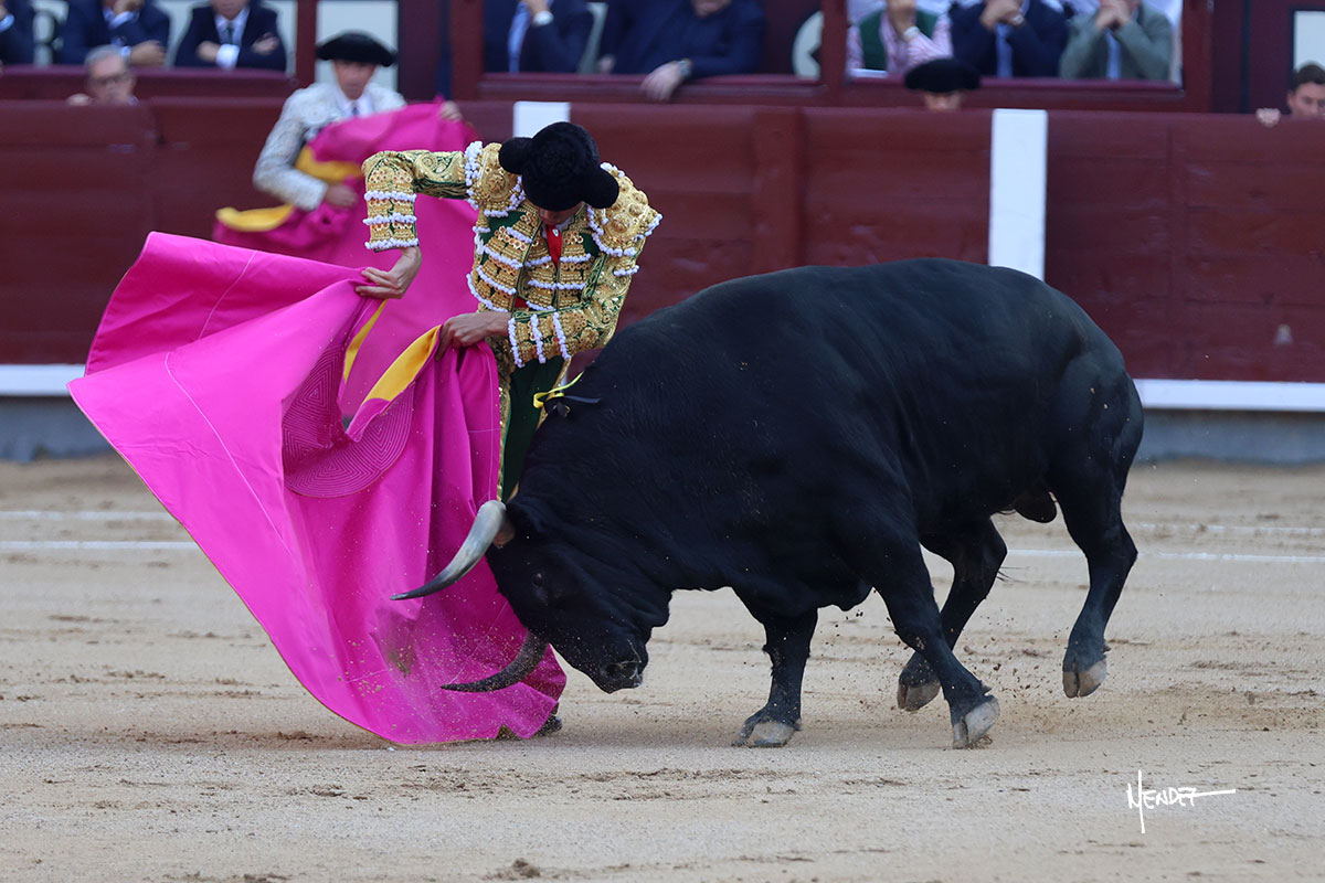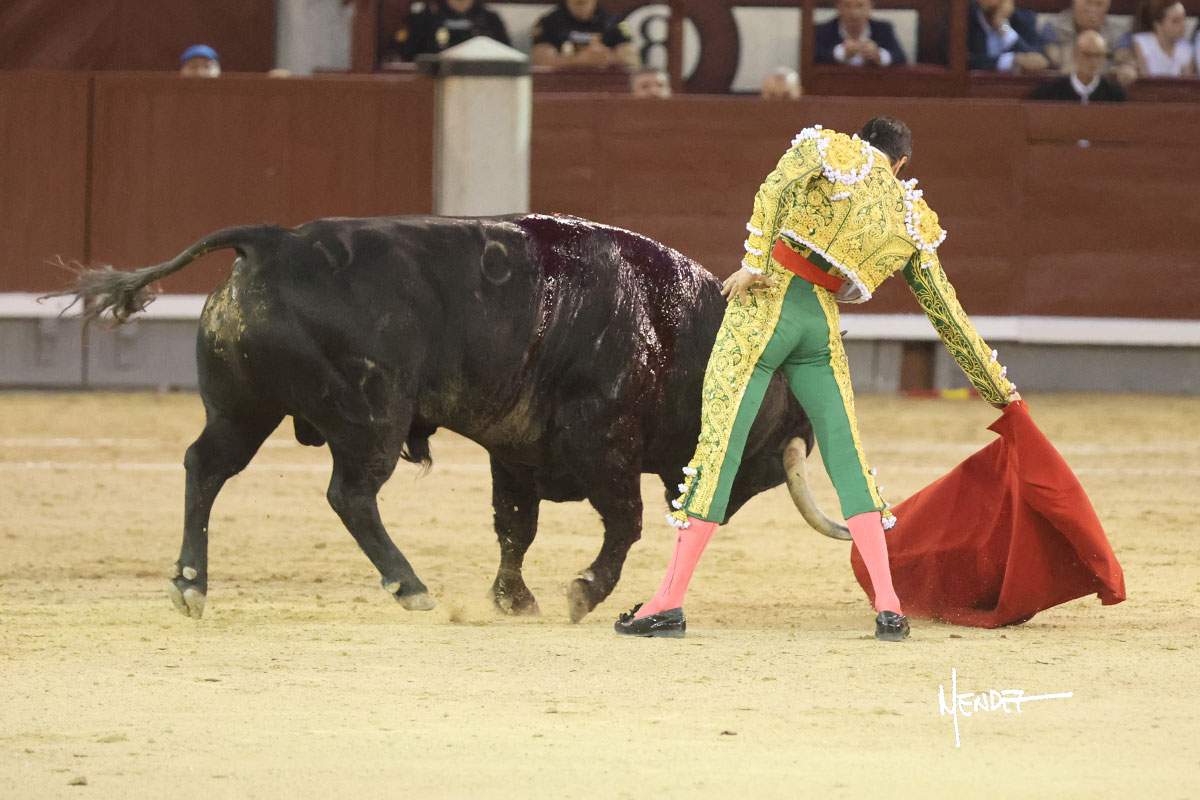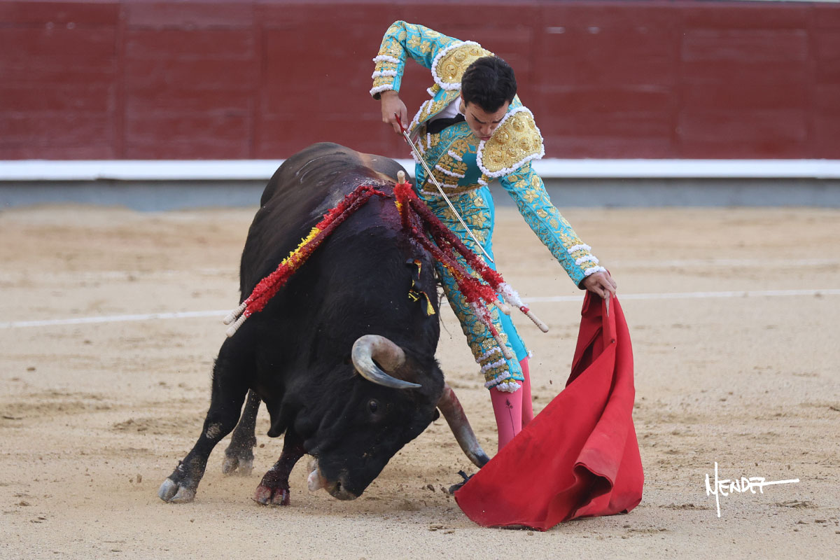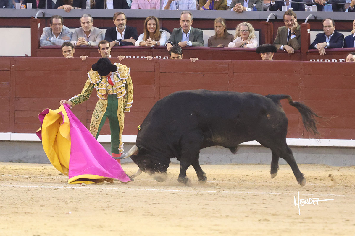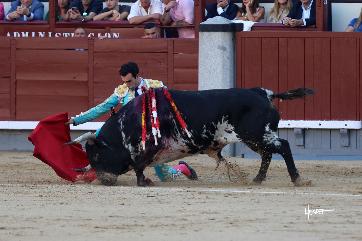Salió suelto el quinto, al que llegó Borja Jiménez sin poder estirarse con el. Lo recibió en la muleta bajo los terrenos del siete, tanteándolo por ambos pitones, bajándole la mano. Se lo llevó más allá del tercio y siguió sobre el derecho, envolviéndoselo en una tanda aplaudida en los tendidos. Le dio tiempo y sitio para continuar por el derecho, tocando y llevando, pasando a un toro que humillaba y seguía el engaño. Supo dosificar muy bien el sevillano, desarrollando tandas cortas, pero bien llevadas. Cambió al natural, logrando algunos pases largos y profundos, aunque no suficientes para redondear su labor. Sin llevarlo más allá del tercio, siguió con un toreo a pies juntos y aunque el toro pasaba, sus embestidas no tenían el suficiente calado. Culminó metido entre pitones, poniendo todo, estando por encima de su oponente.