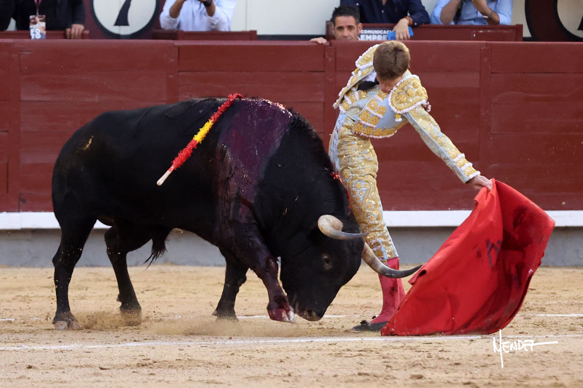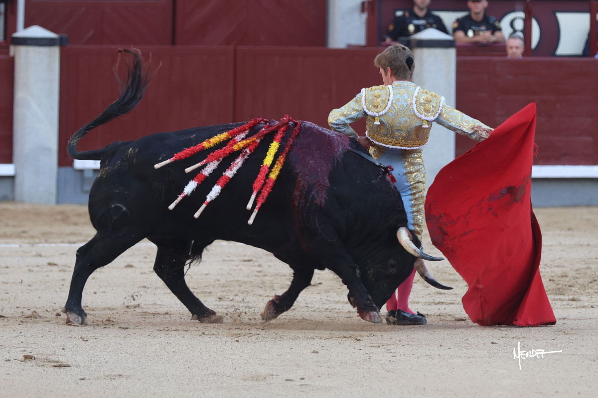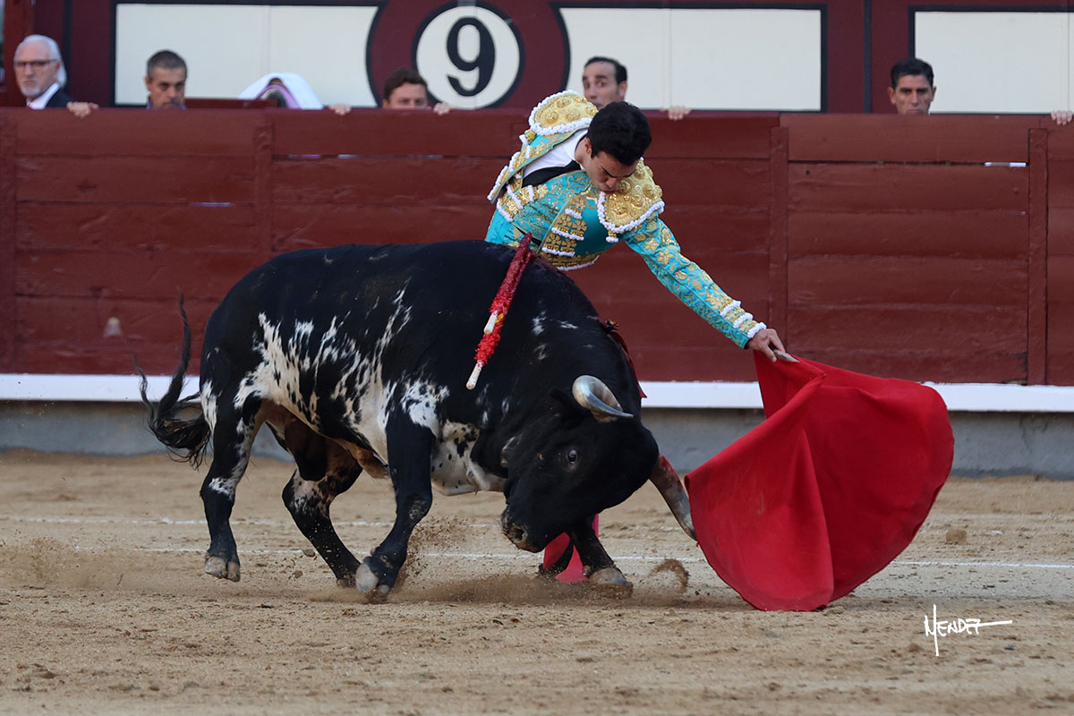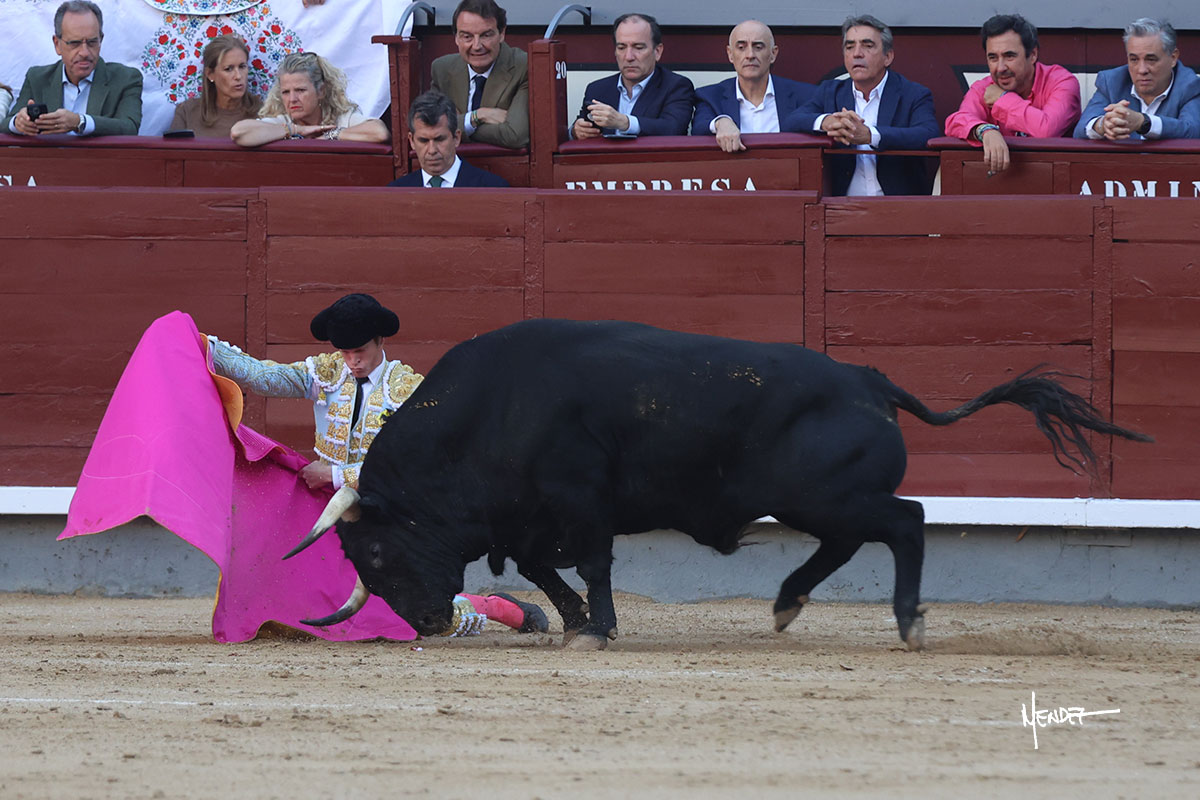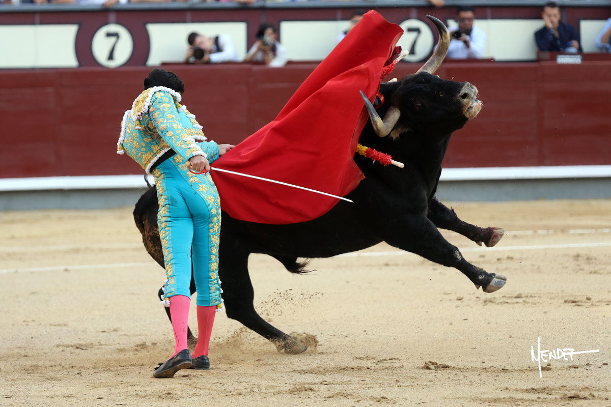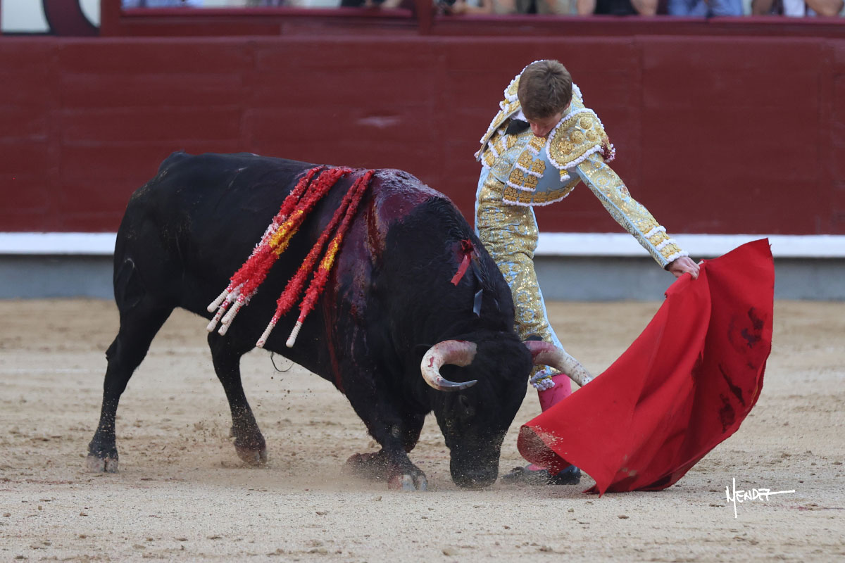 Salió suelto el quinto, al que llegó Borja Jiménez sin poder estirarse con el. Lo recibió en la muleta bajo los terrenos del siete, tanteándolo por ambos pitones, bajándole la mano. Se lo llevó más allá del tercio y siguió sobre el derecho, envolviéndoselo en una tanda aplaudida en los tendidos. Le dio tiempo y sitio para continuar por el derecho, tocando y llevando, pasando a un toro que humillaba y seguía el engaño. Supo dosificar muy bien el sevillano, desarrollando tandas cortas, pero bien llevadas. Cambió al natural, logrando algunos pases largos y profundos, aunque no suficientes para redondear su labor. Sin llevarlo más allá del tercio, siguió con un toreo a pies juntos y aunque el toro pasaba, sus embestidas no tenían el suficiente calado. Culminó metido entre pitones, poniendo todo, estando por encima de su oponente.