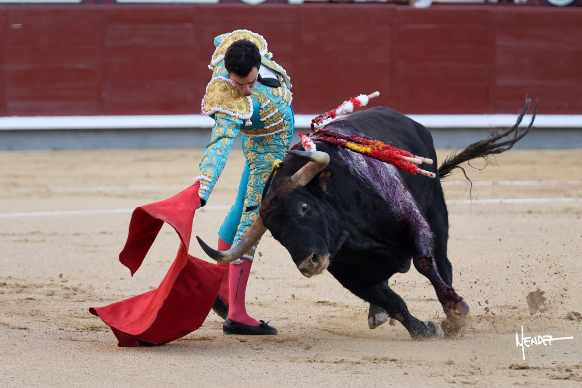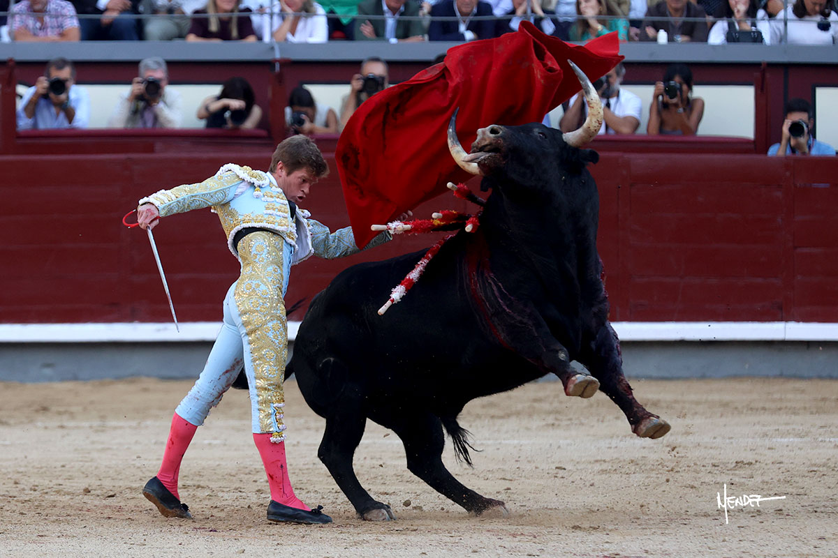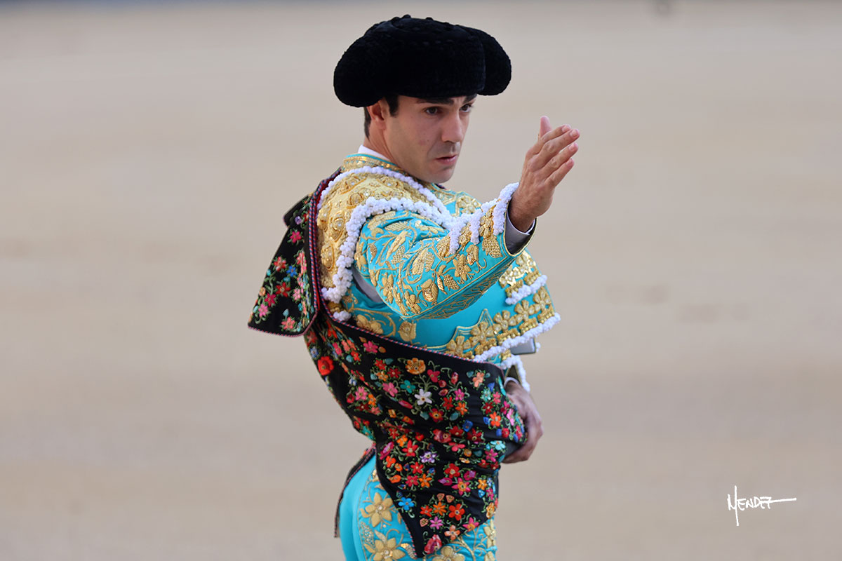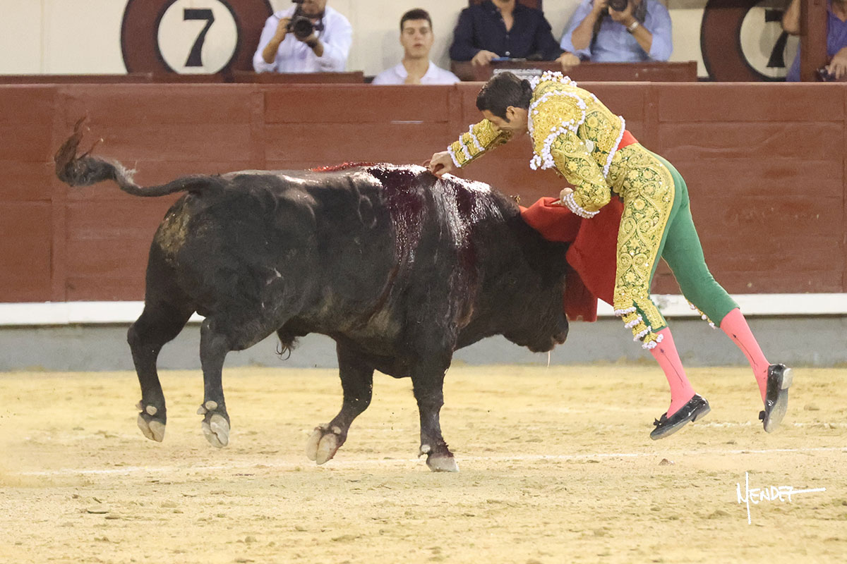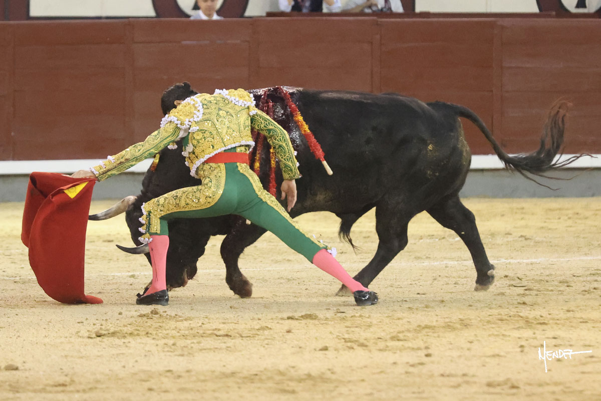 Salió suelto el quinto, al que llegó Borja Jiménez sin poder estirarse con el. Lo recibió en la muleta bajo los terrenos del siete, tanteándolo por ambos pitones, bajándole la mano. Se lo llevó más allá del tercio y siguió sobre el derecho, envolviéndoselo en una tanda aplaudida en los tendidos. Le dio tiempo y sitio para continuar por el derecho, tocando y llevando, pasando a un toro que humillaba y seguía el engaño. Supo dosificar muy bien el sevillano, desarrollando tandas cortas, pero bien llevadas. Cambió al natural, logrando algunos pases largos y profundos, aunque no suficientes para redondear su labor. Sin llevarlo más allá del tercio, siguió con un toreo a pies juntos y aunque el toro pasaba, sus embestidas no tenían el suficiente calado. Culminó metido entre pitones, poniendo todo, estando por encima de su oponente.