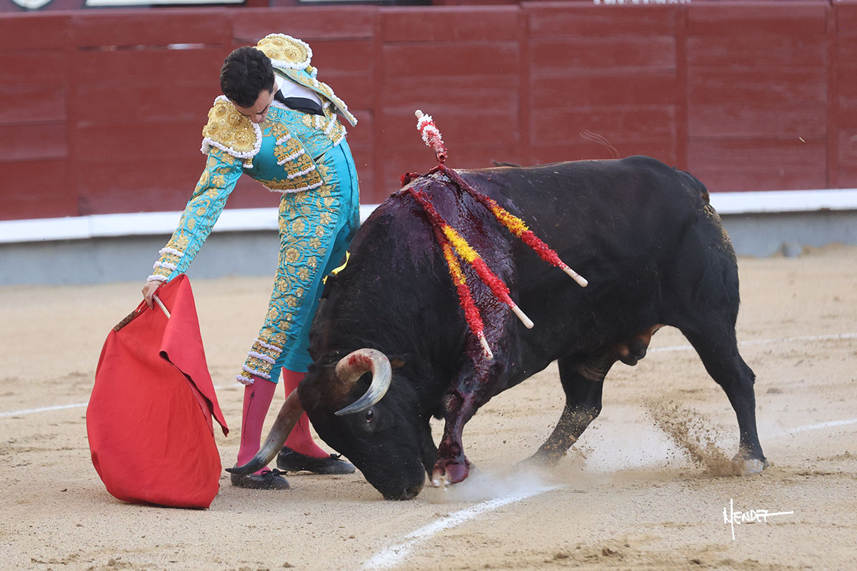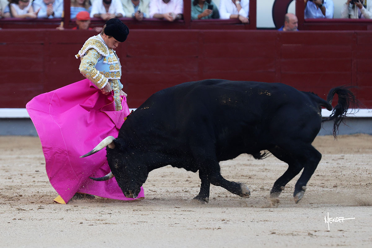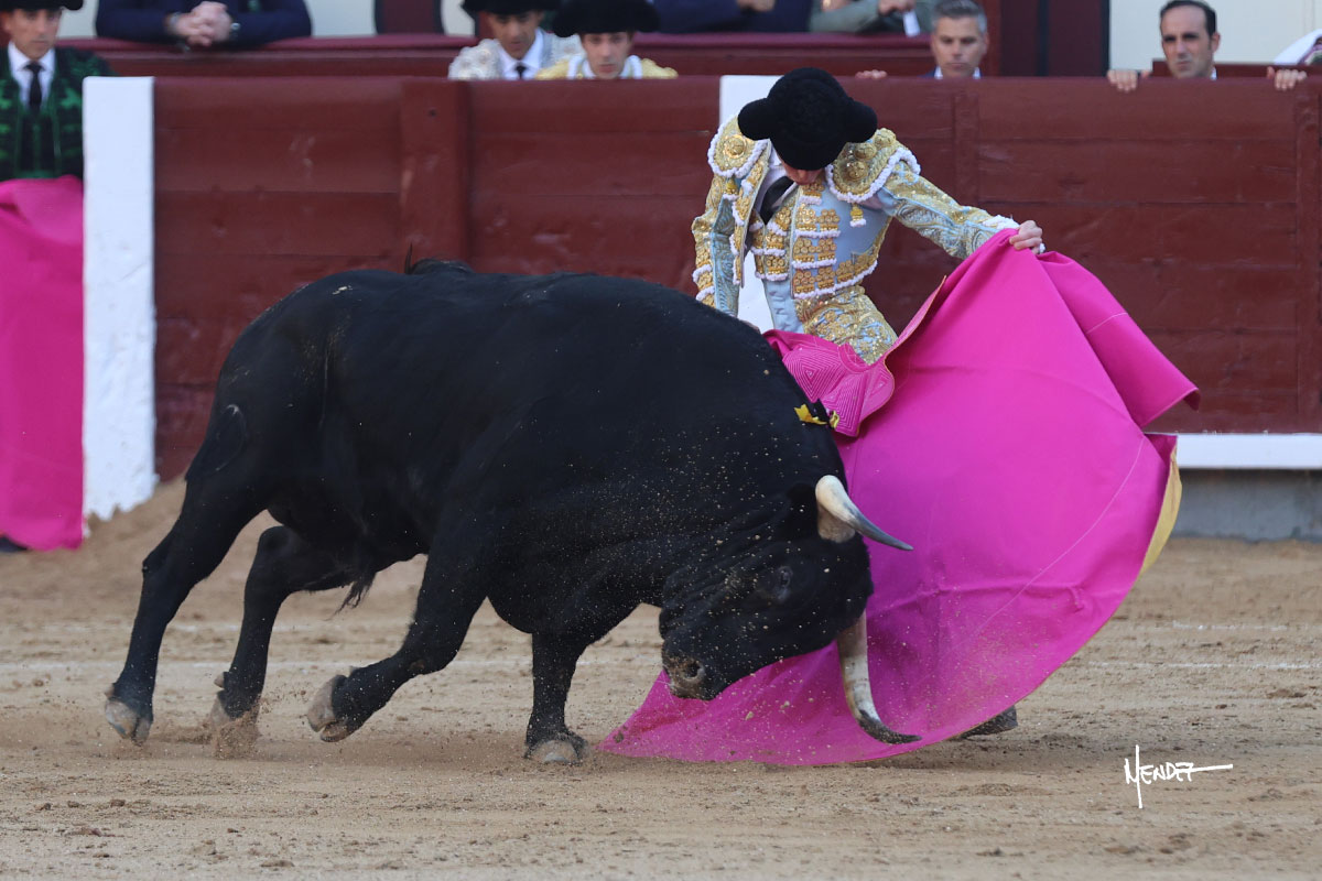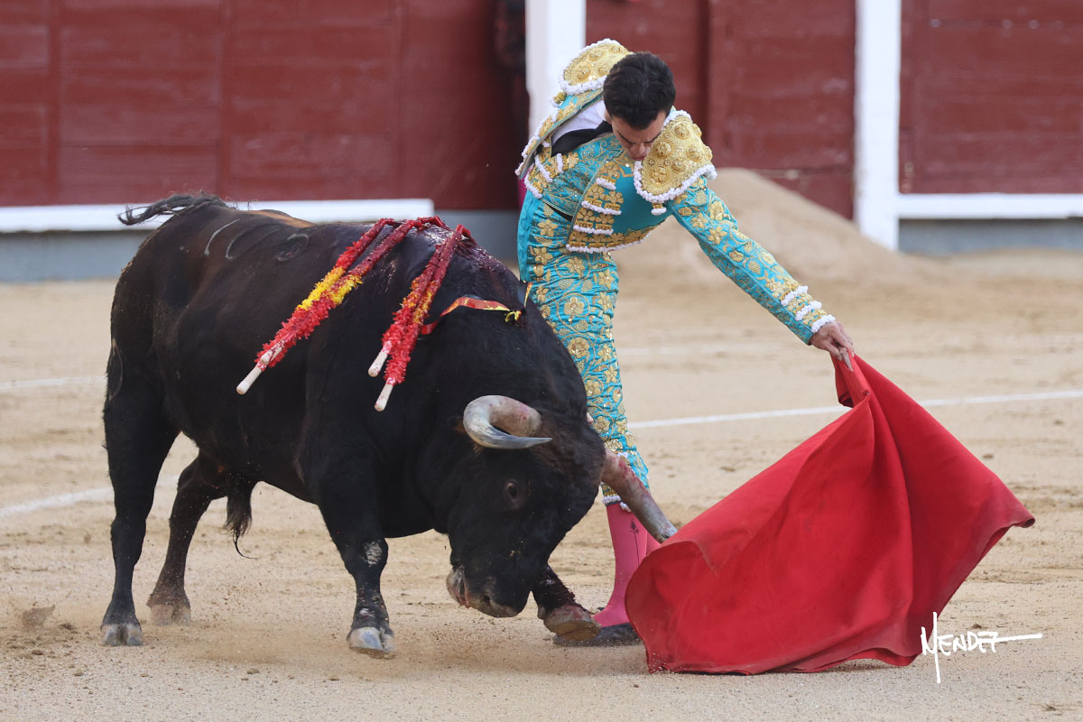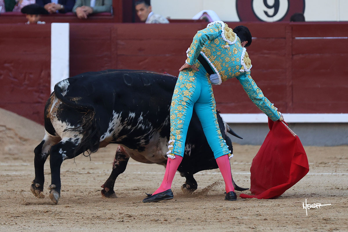 Tomás Rufo saludó al segundo de la tarde, al que llevó y bregó con alguna que otra pincelada. Salió a los medios para brindar al público y después comenzar su labor con la muleta rodilla en tierra, pasándolo por ambos pitones. Siguió doblándose con el para llevarlo. Le dio tiempo y sitio para después citarlo en la larga distancia y aprovechar la inercia. Se la dejó puesta yel animal siguió el engaño con cierto ritmo, bajando la cara. Humillaba y había celo y transmisión en su embestida, solo tuvo que dejársela puesta. Cambió al natural, pero sin la misma armonía y ligazón, punteaba la tela en los primero pases. Poco a poco, bajándole la mano y llevándolo con los vuelos encontró el acople y pulcritud. Supo encontrar el calado en la división de opiniones. Insistió al natural, tocando y deslizando. Alargó la faena, ahora retomando las series sobre el derecho, bajándole la mano y siempre dejándosela en la cara. Mató con acierto.