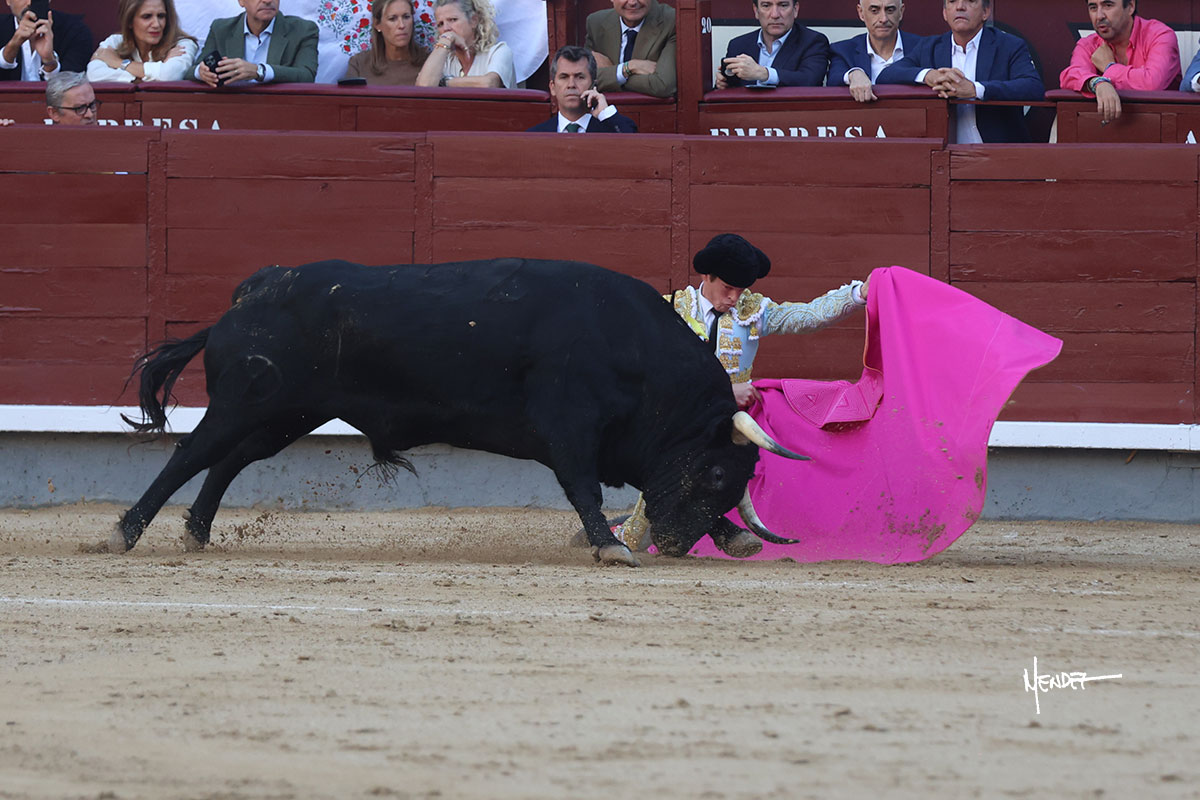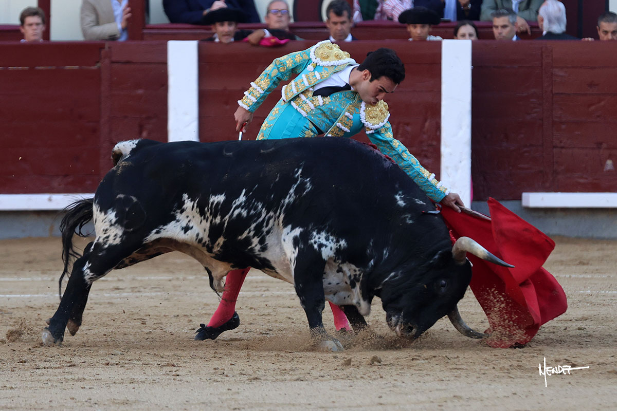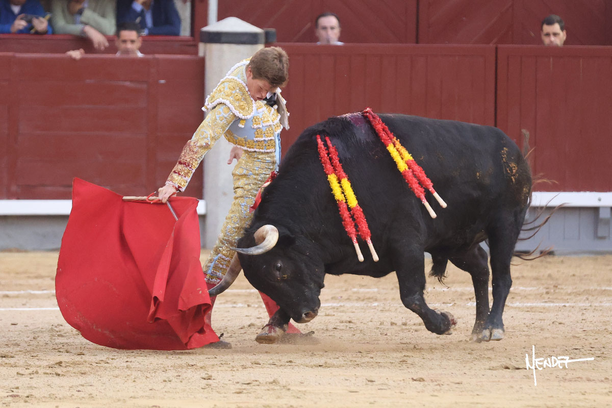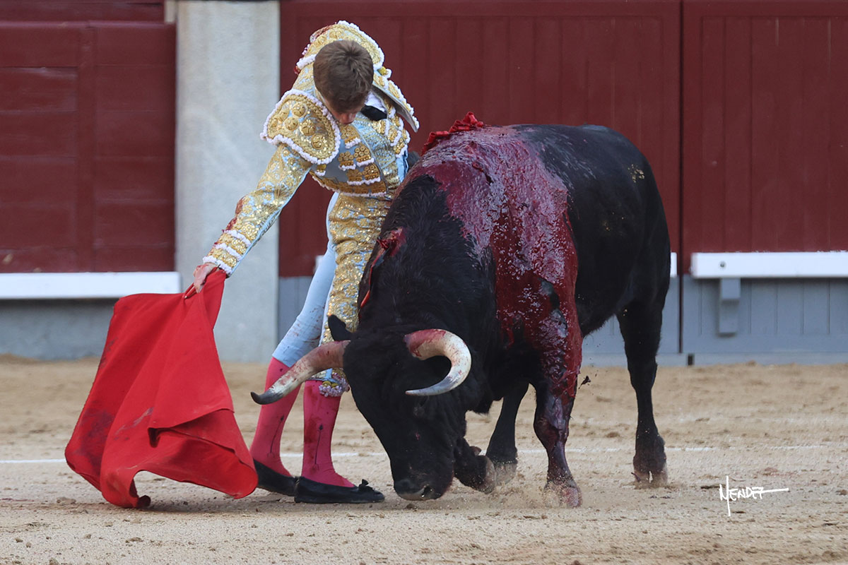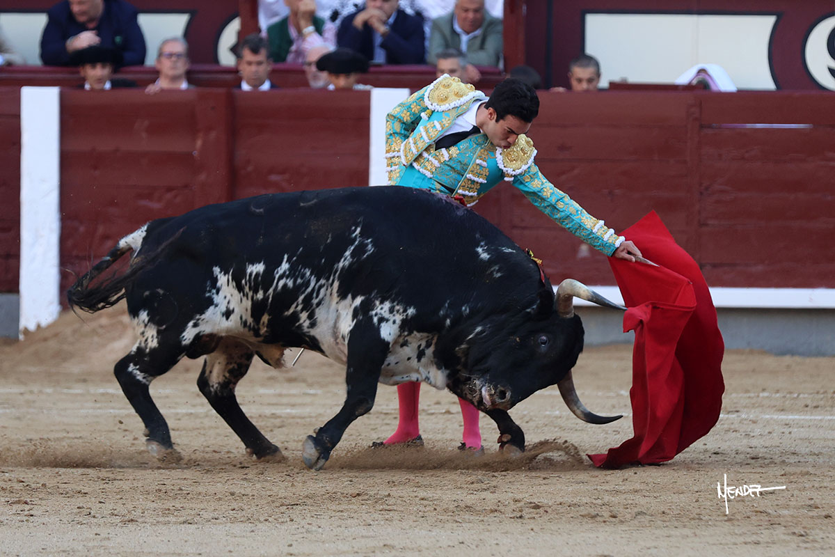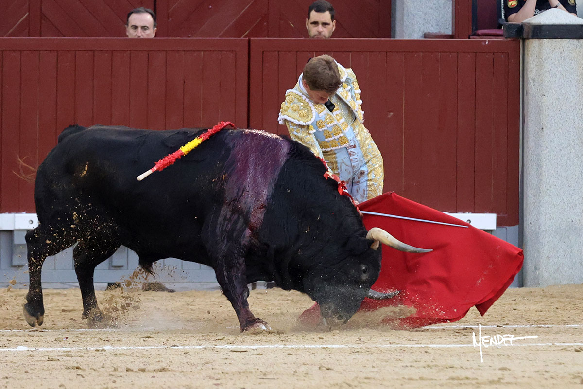 Tomás Rufo saludó al segundo de la tarde, al que llevó y bregó con alguna que otra pincelada. Salió a los medios para brindar al público y después comenzar su labor con la muleta rodilla en tierra, pasándolo por ambos pitones. Siguió doblándose con el para llevarlo. Le dio tiempo y sitio para después citarlo en la larga distancia y aprovechar la inercia. Se la dejó puesta yel animal siguió el engaño con cierto ritmo, bajando la cara. Humillaba y había celo y transmisión en su embestida, solo tuvo que dejársela puesta. Cambió al natural, pero sin la misma armonía y ligazón, punteaba la tela en los primero pases. Poco a poco, bajándole la mano y llevándolo con los vuelos encontró el acople y pulcritud. Supo encontrar el calado en la división de opiniones. Insistió al natural, tocando y deslizando. Alargó la faena, ahora retomando las series sobre el derecho, bajándole la mano y siempre dejándosela en la cara. Mató con acierto.