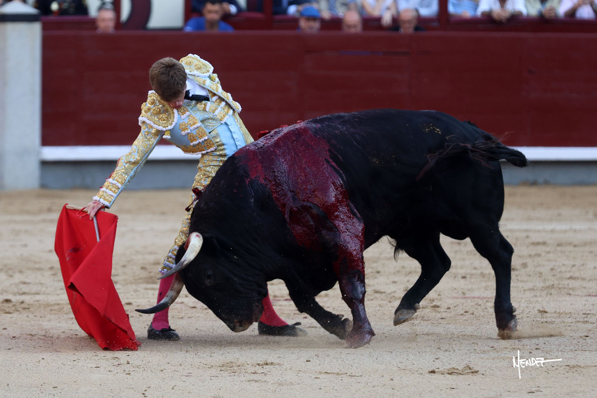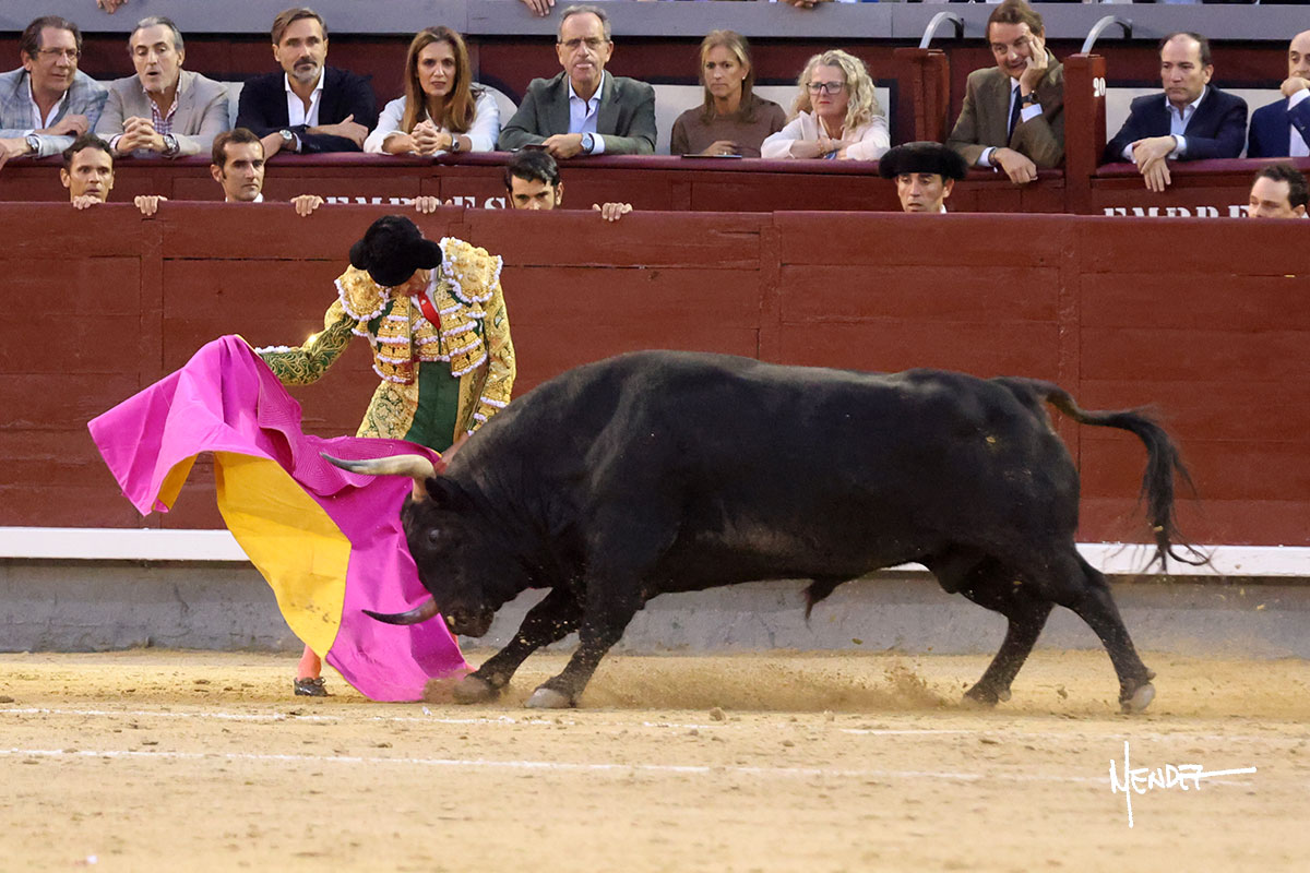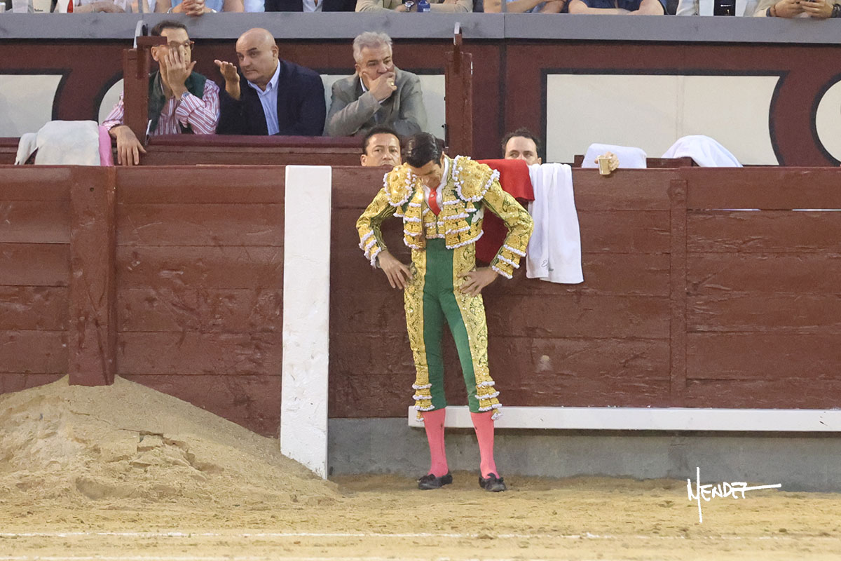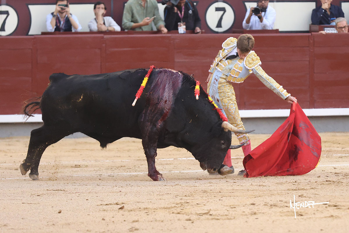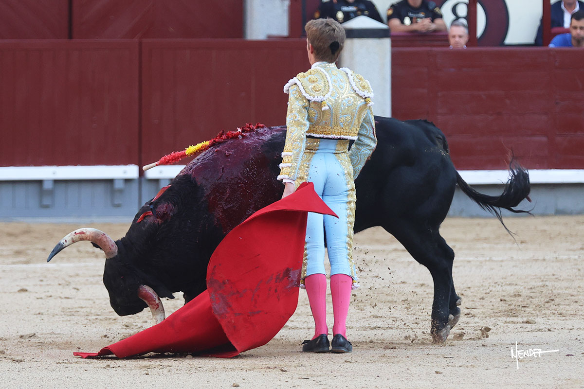 Tomás Rufo saludó al segundo de la tarde, al que llevó y bregó con alguna que otra pincelada. Salió a los medios para brindar al público y después comenzar su labor con la muleta rodilla en tierra, pasándolo por ambos pitones. Siguió doblándose con el para llevarlo. Le dio tiempo y sitio para después citarlo en la larga distancia y aprovechar la inercia. Se la dejó puesta yel animal siguió el engaño con cierto ritmo, bajando la cara. Humillaba y había celo y transmisión en su embestida, solo tuvo que dejársela puesta. Cambió al natural, pero sin la misma armonía y ligazón, punteaba la tela en los primero pases. Poco a poco, bajándole la mano y llevándolo con los vuelos encontró el acople y pulcritud. Supo encontrar el calado en la división de opiniones. Insistió al natural, tocando y deslizando. Alargó la faena, ahora retomando las series sobre el derecho, bajándole la mano y siempre dejándosela en la cara. Mató con acierto.