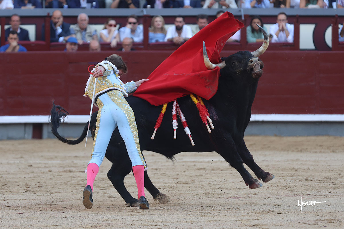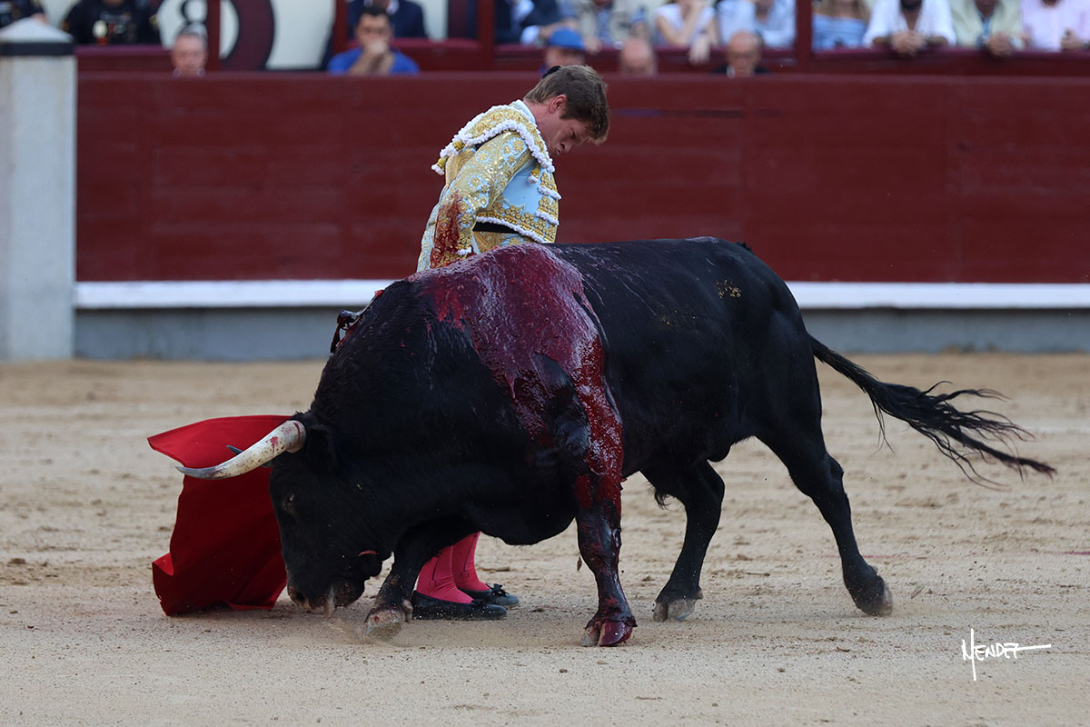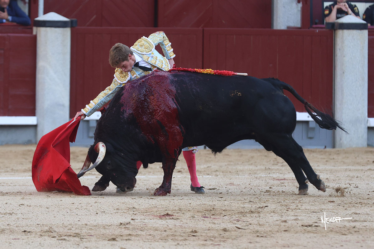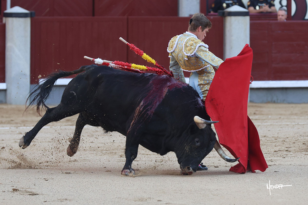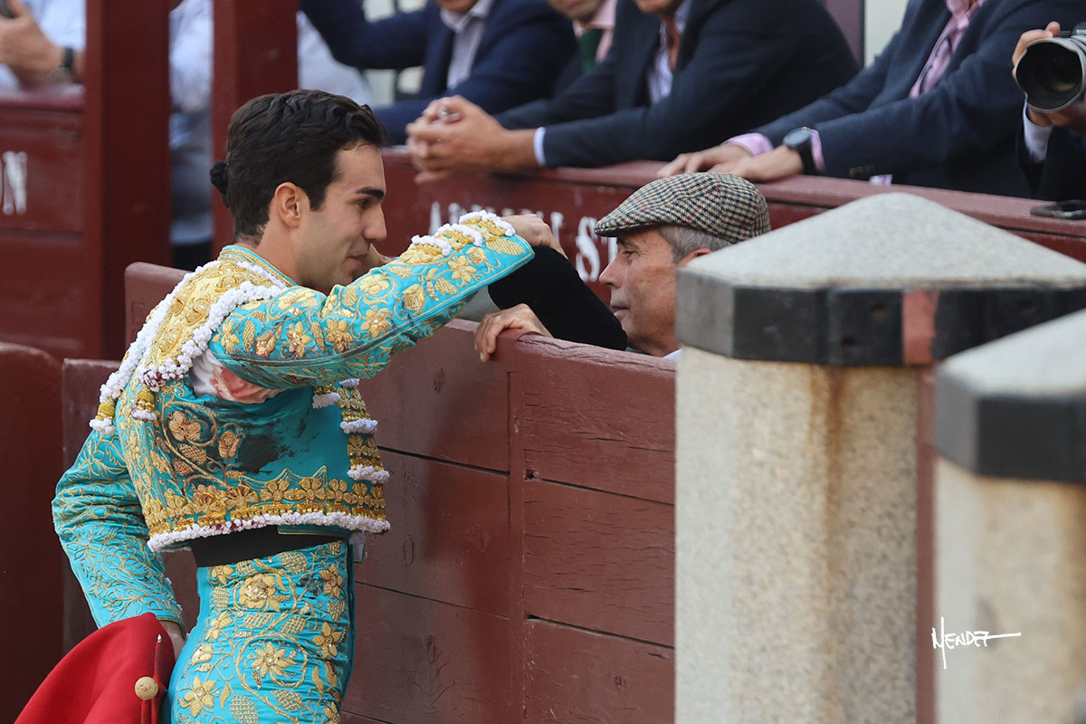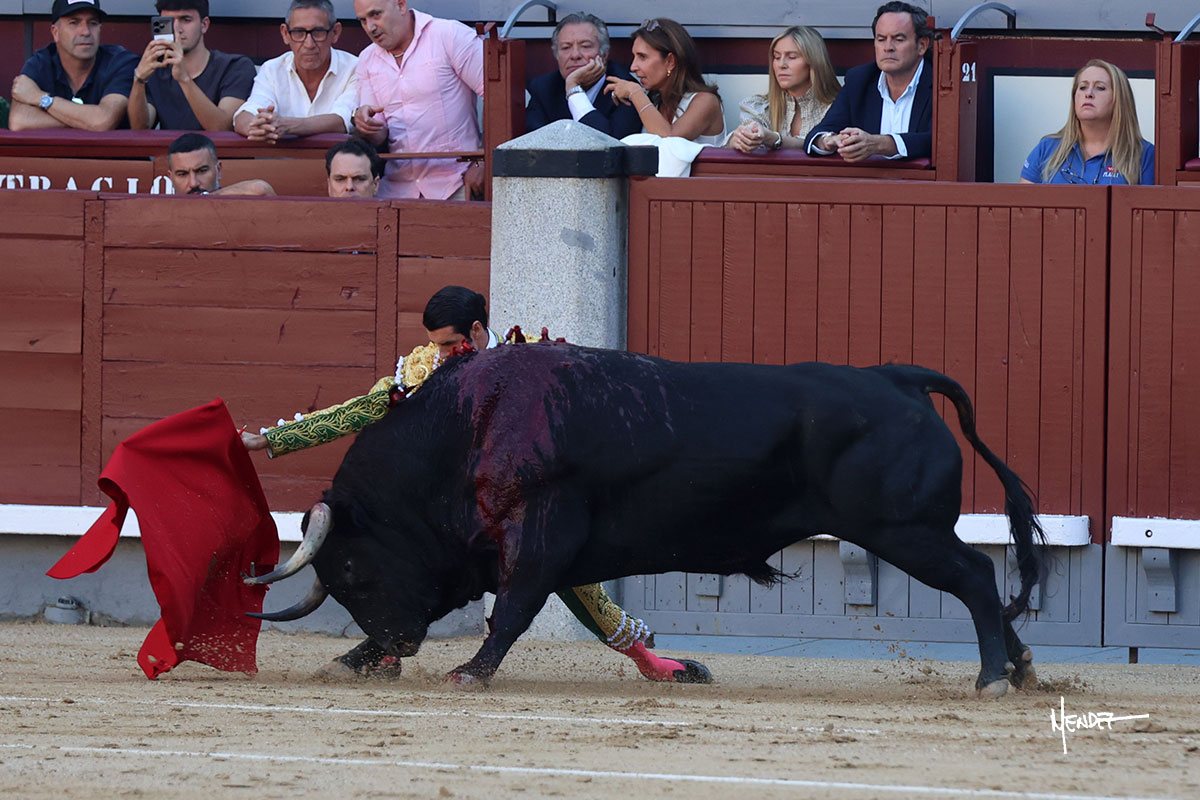 Tomás Rufo saludó al segundo de la tarde, al que llevó y bregó con alguna que otra pincelada. Salió a los medios para brindar al público y después comenzar su labor con la muleta rodilla en tierra, pasándolo por ambos pitones. Siguió doblándose con el para llevarlo. Le dio tiempo y sitio para después citarlo en la larga distancia y aprovechar la inercia. Se la dejó puesta yel animal siguió el engaño con cierto ritmo, bajando la cara. Humillaba y había celo y transmisión en su embestida, solo tuvo que dejársela puesta. Cambió al natural, pero sin la misma armonía y ligazón, punteaba la tela en los primero pases. Poco a poco, bajándole la mano y llevándolo con los vuelos encontró el acople y pulcritud. Supo encontrar el calado en la división de opiniones. Insistió al natural, tocando y deslizando. Alargó la faena, ahora retomando las series sobre el derecho, bajándole la mano y siempre dejándosela en la cara. Mató con acierto.
