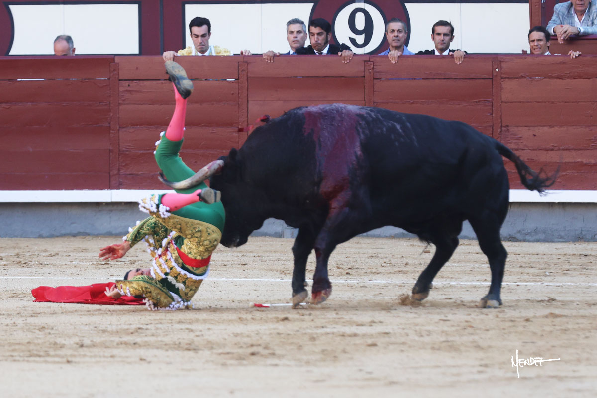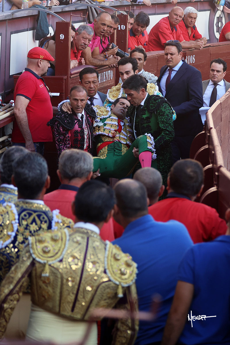 Emilio de Justo se lució y estiró con el primero de la tarde, un toro al que fue ganando terreno mientras se lucía con el por chicuelinas. Tras su paso por el caballo, se lució Borja en su quite. Se alcanzó la faena de muleta y el extremeño comenzó genuflexo, pasándolo por ambos pitones, sacándolo del tercio. Se disponía a comenzar con la primera tanda, pero se le vino por dentro y lo prendió bruscamente, quedando inmóvil. Fue trasladado a la enfermería y continuó Borja Jiménez ante el primero, al que pasaportó.