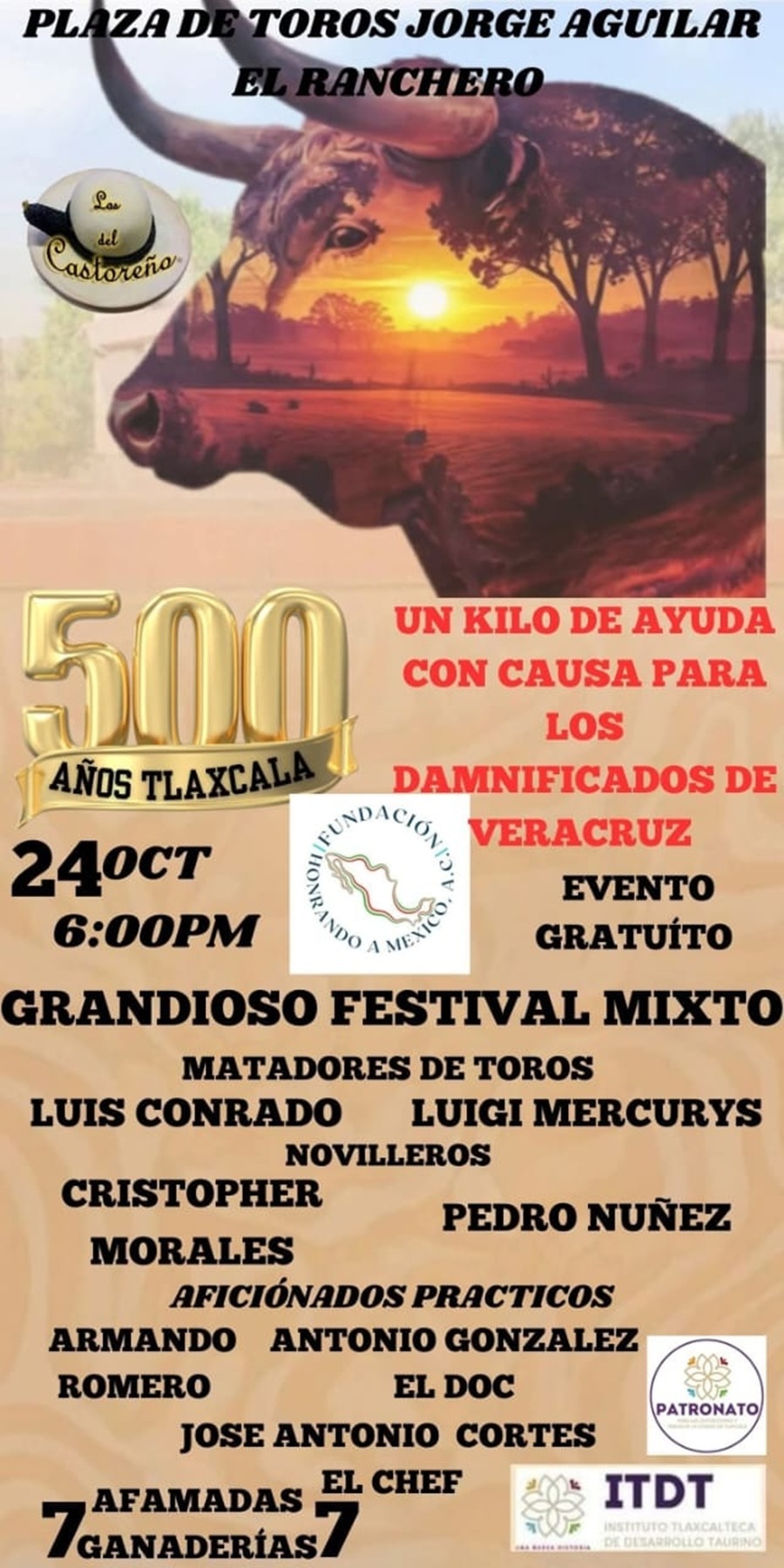 A través del grupo “Taurotlax” y Guillermo Veloz, se informa que el reciente jueves 16 de octubre, en la capital del estado de Tlaxcala, los integrantes de la empresa “Los del Castoreño” y de la Fundación “Honrando México”, dieron a conocer que el festival taurino anunciado para el próximo viernes 24 de este mes, a partir de las 18:00 horas, en el coso “Jorge ‘Ranchero’ Aguilar” y, que marca el inicio de la actividad taurina dentro de la tradicional Feria de Todos los Santos Tlaxcala 2025, será con causa, pues, se montará para apoyar a los damnificados por lluvias y cuestiones climatológicas en el estado de Veracruz.