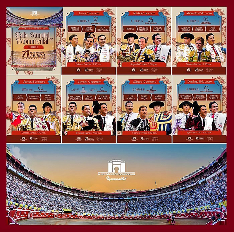 La empresa Cormanizales saca pecho y presenta una rematada Feria Taurina en la que estarán presentes los mejores toreros del escalafón a nivel mundial. El serial se desarrollará entre el lunes 5 y el domingo 11 de enero y contará con cinco corridas de toros, una mixta y un destacado festival, con un elenco de toreros formado por César Rincón, que reaparece tras su impecable e inolvidable triunfo en el festival del 12 de octubre en Madrid, al que le siguen y completan la lista Alejandro Talavante, Andrés Roca Rey, Luis Bolívar, Sebastián Castella, Daniel Luque, Antonio Ferrera, Román, Juan de Castilla, Borja Jiménez, David de Miranda, José Arcila, Marco Pérez, que debutará como matador de toros en Cali, Manuel Libardo y los novilleros Olga Casado y Felipe Miguel Negret.