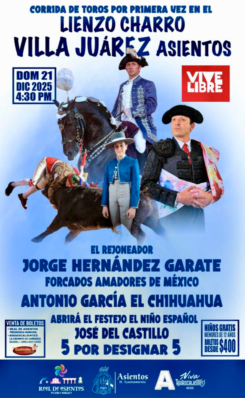 Se informa que, el próximo domingo 21 de diciembre de 2025, en el coso charro taurino de Villa Juárez, centro económico y comercial más importante del municipio de Real de Asientos, “Pueblo Mágico” desde 2006, situado a 35 kilómetros de la capital del estado de Aguascalientes, se llevará a cabo por primera vez un festejo taurino.