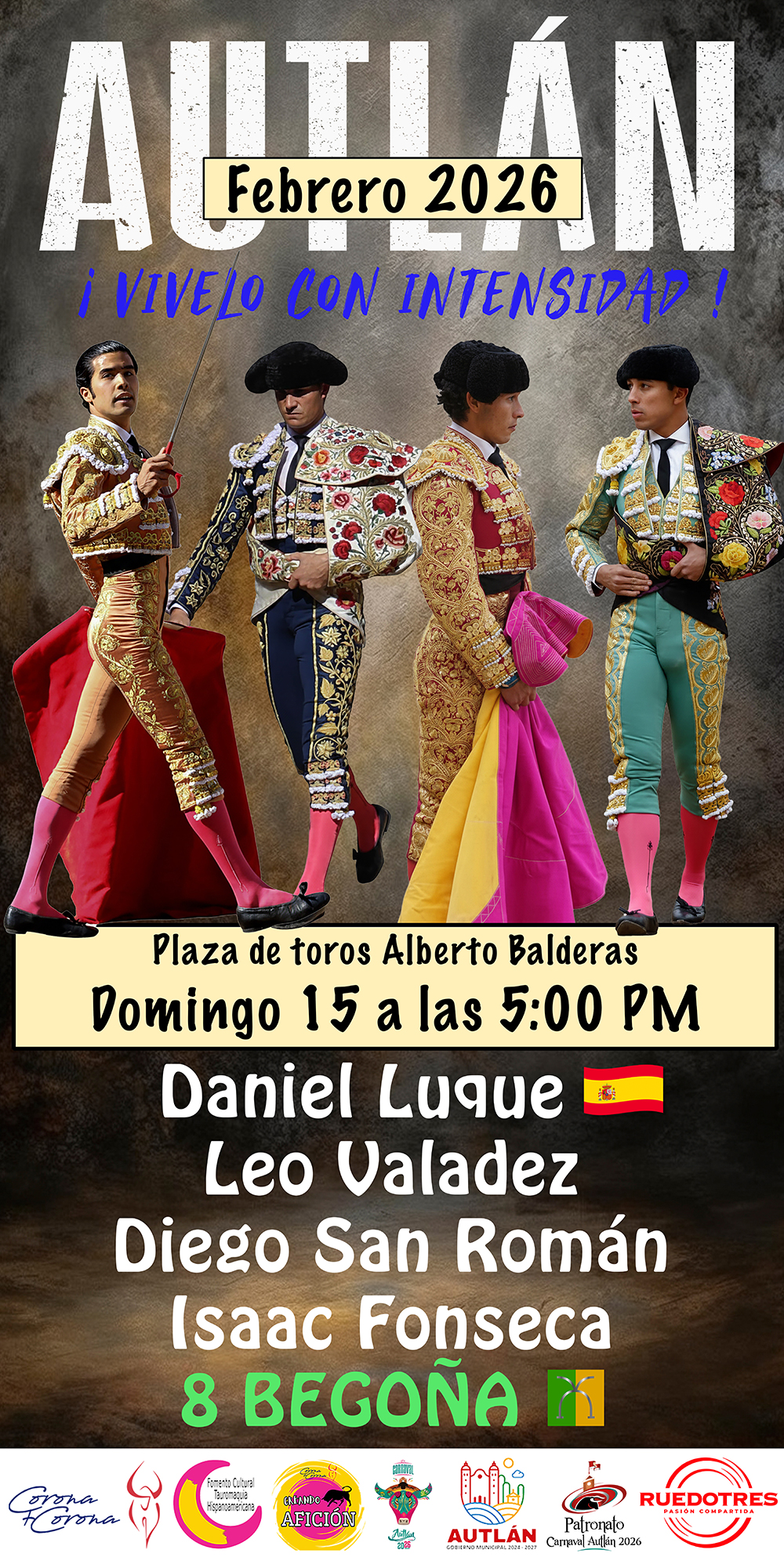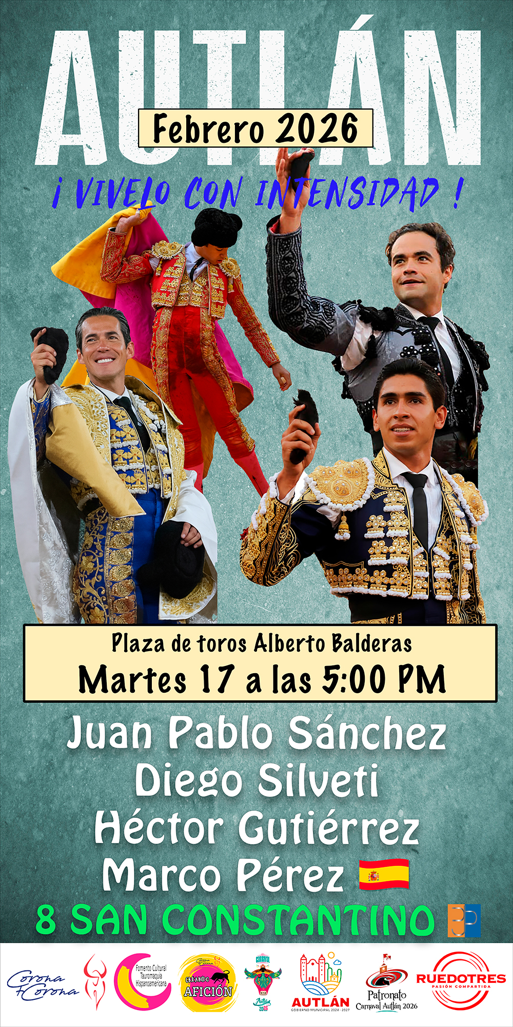 Amarrarse los machos y sudar la ropa son condiciones indispensables para vivir el toreo con intensidad. La empresa taurina Corona + Corona, del ganadero Juan Pablo Corona, el gobierno municipal de Autlán, y el Patronato Organizador del Carnaval presentaron los carteles que dan forma al tradicional serial taurino de la joya jalisciense del mapa taurino mexicano.
