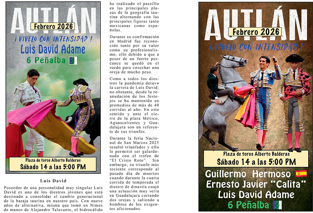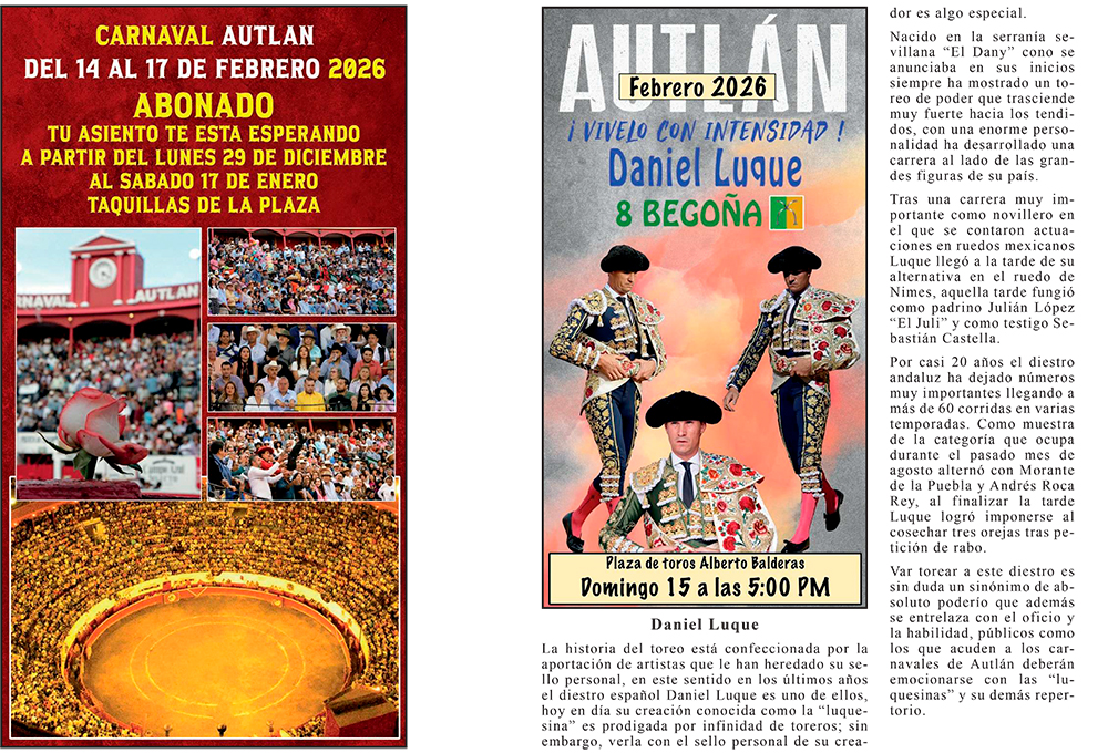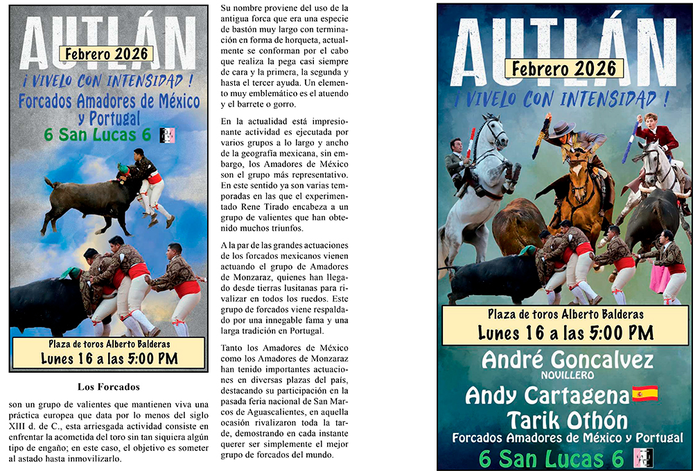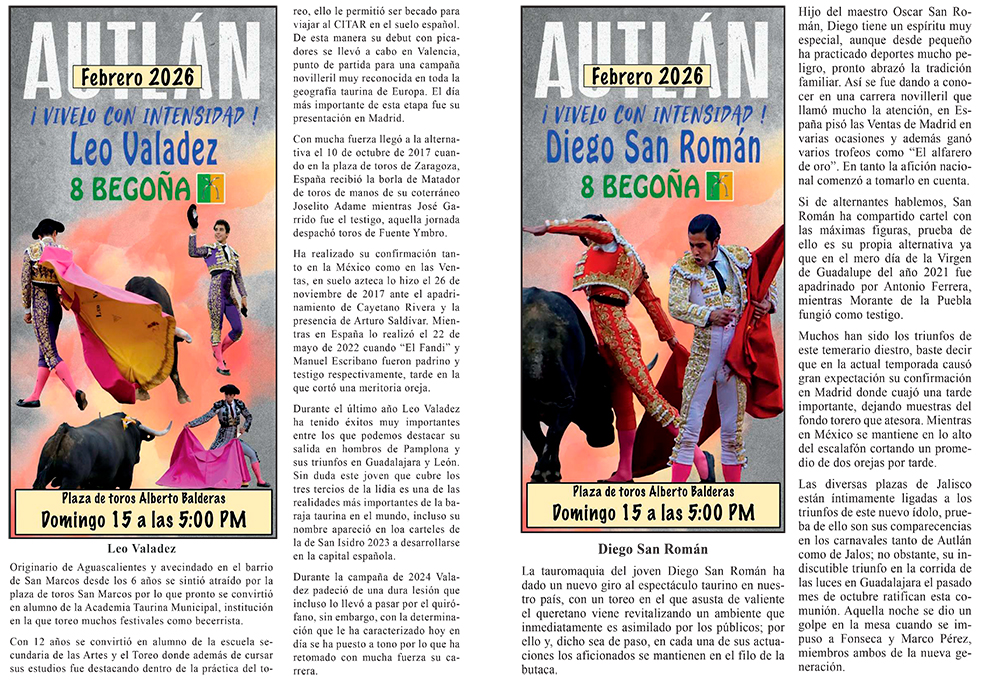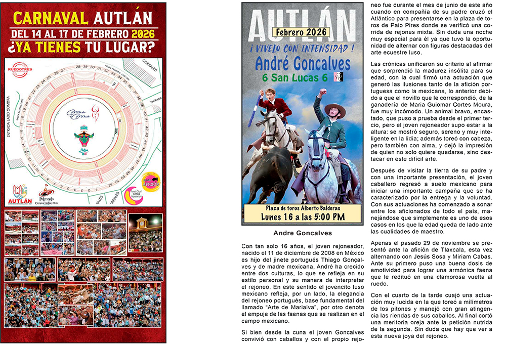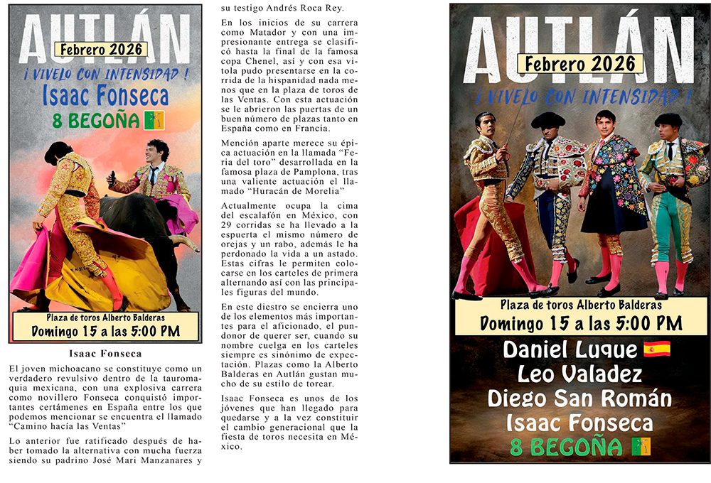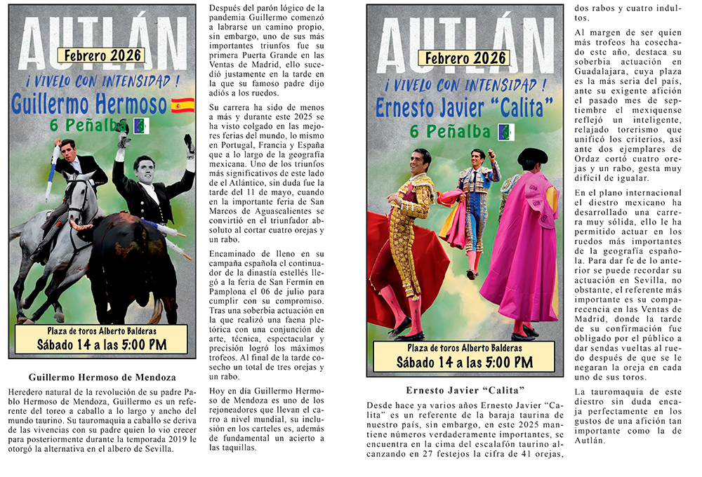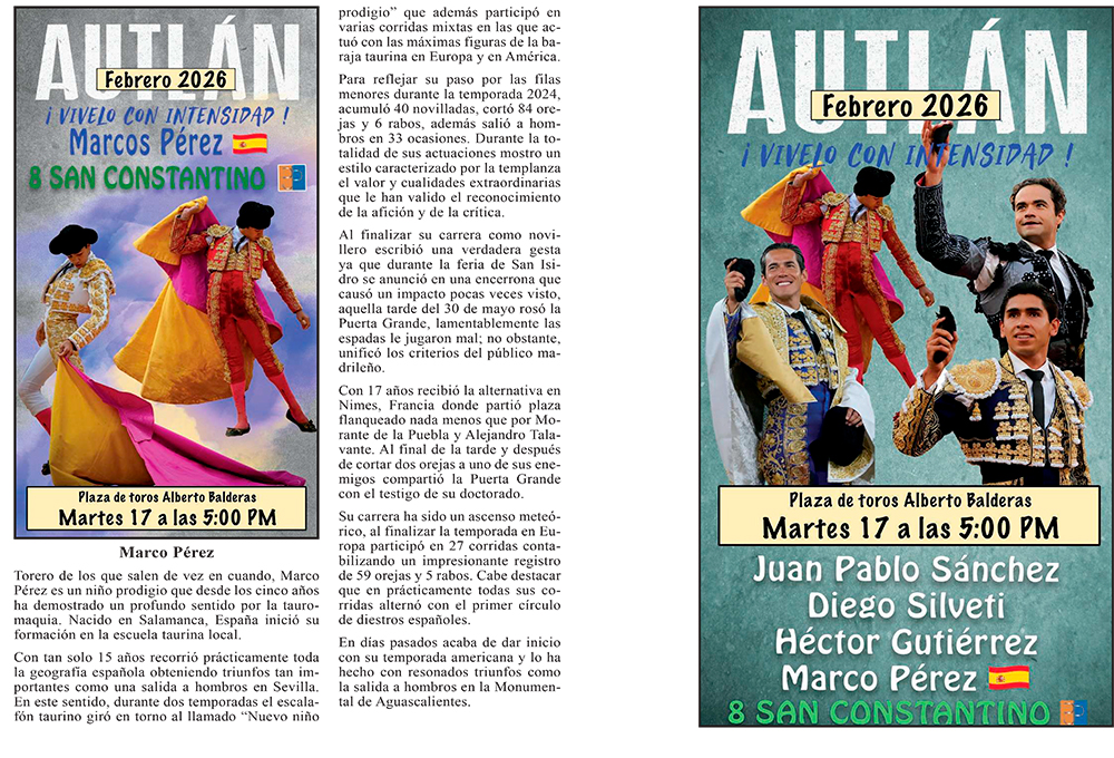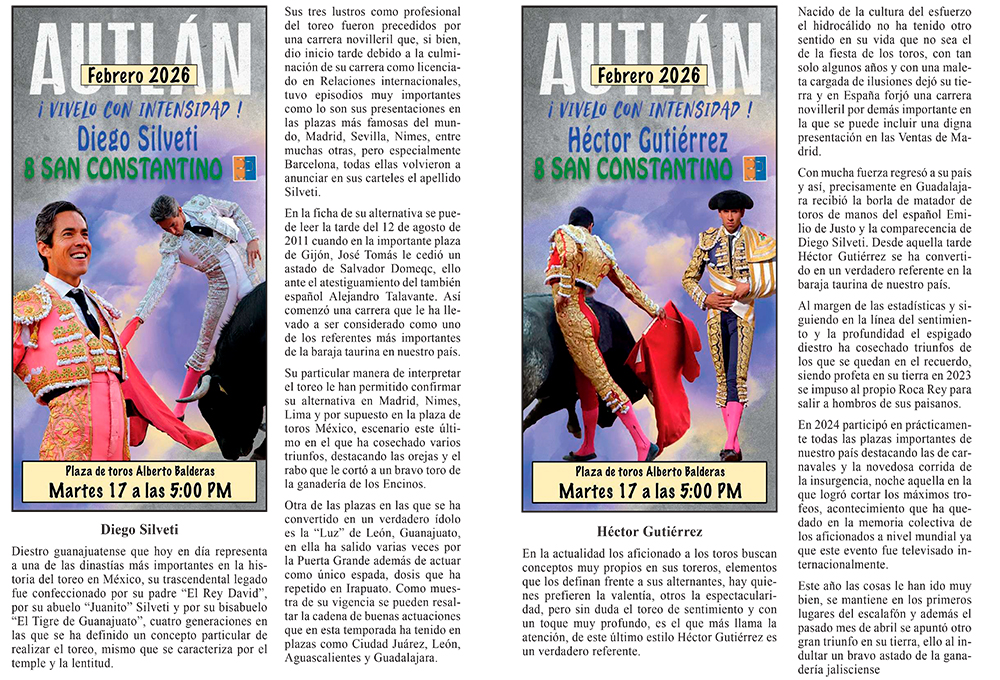 La empresa C + C Toros presenta la información del Elenco de lo que serán las corridas formales del Carnaval más importante de México, AUTLÁN 2026 ¡VIVELO CON INTENSIDAD!, cada Torero, Rejoneador y Forcados les acompaña una semblanza de su trayectoria para estar más enterados de la importancia que tienen.