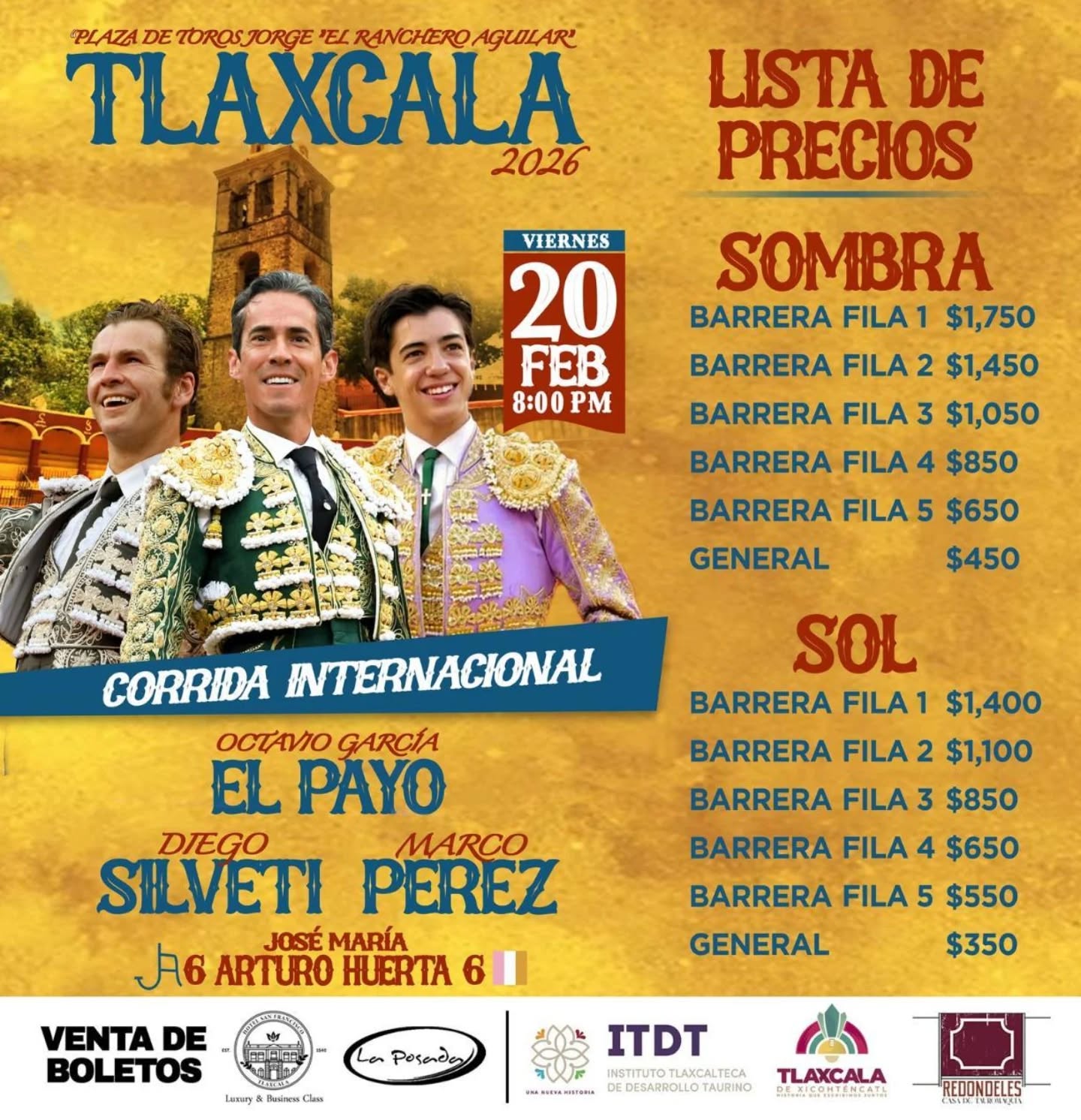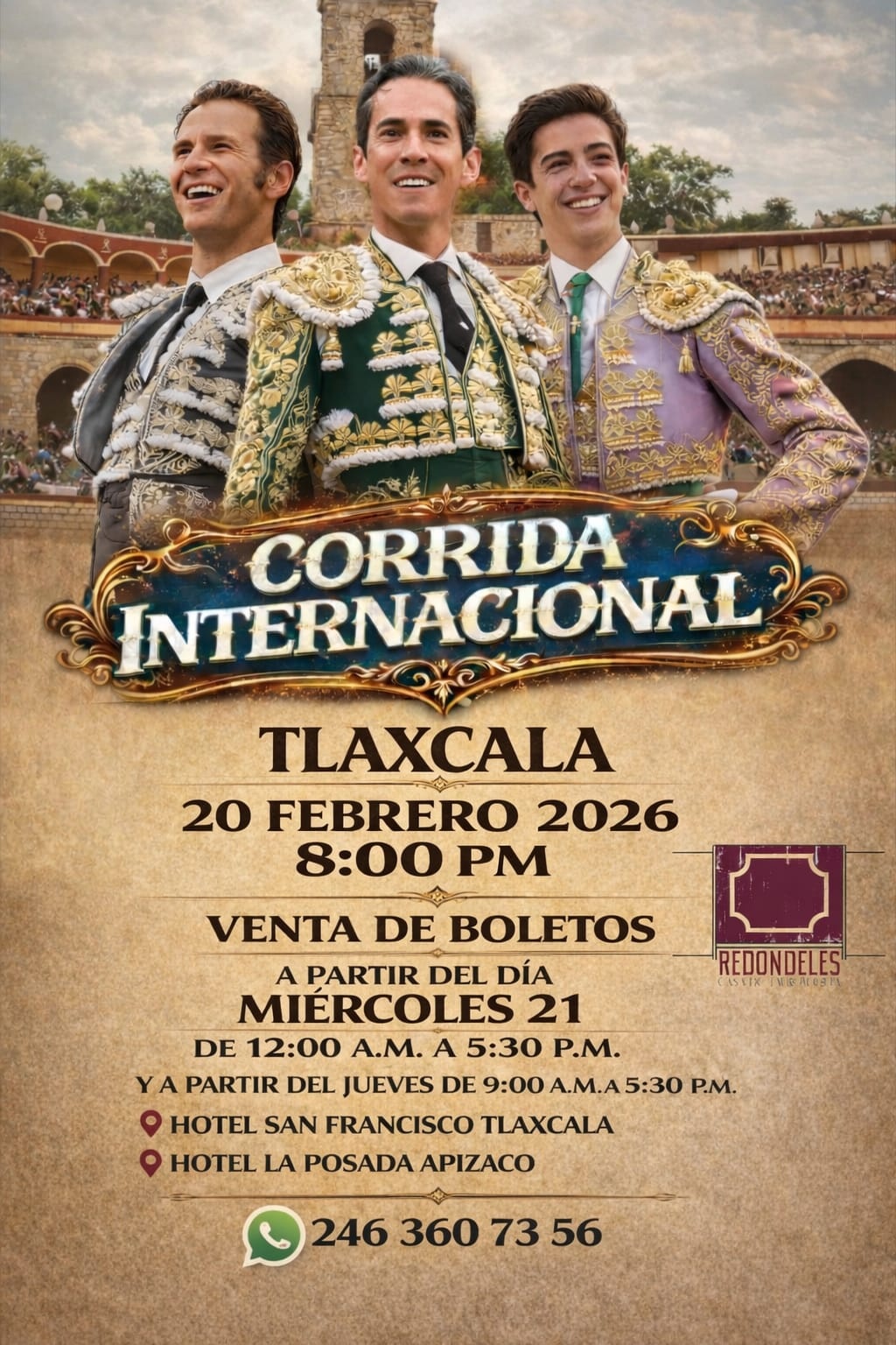 La Empresa «Redondeles» anunció el inicio de la venta de boletos para la Corrida Internacional que se celebrará el viernes 20 de febrero de 2026 a las 8:00 de la noche en la Plaza de Toros Jorge “El Ranchero” Aguilar, en la capital tlaxcalteca. La empresa informó que los boletos estarán disponibles a partir de este miércoles 21 de enero, en un horario de 12:00 a 17:30 horas y a partir del jueves 22 de enero, la venta se extenderá en horario continuo de 9:00 de la mañana a 17:30 horas.