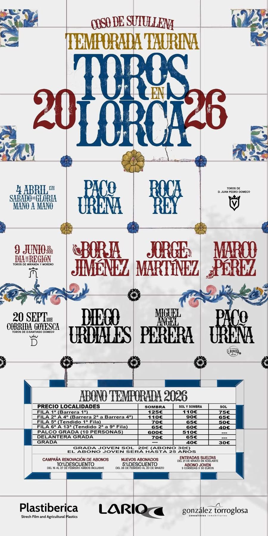 Lorca vivirá tres acontecimientos de primer nivel a lo largo de la temporada 2026. Tres carteles de relumbrón, organizados por el Ayuntamiento de la localidad que preside su Alcalde, Fulgencio Gil. Roca Rey, Paco Ureña, Borja Jiménez, Miguel Ángel Perera, Marco Pérez o Diego Urdiales son los ejes de un año donde hará su presentación en Sutullena, el murciano Jorge Martínez.
