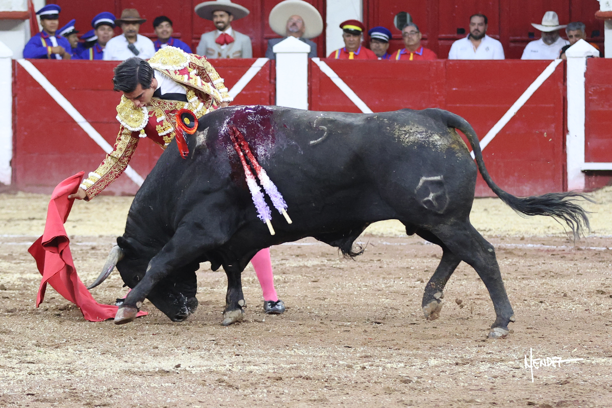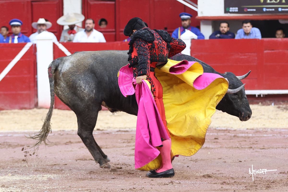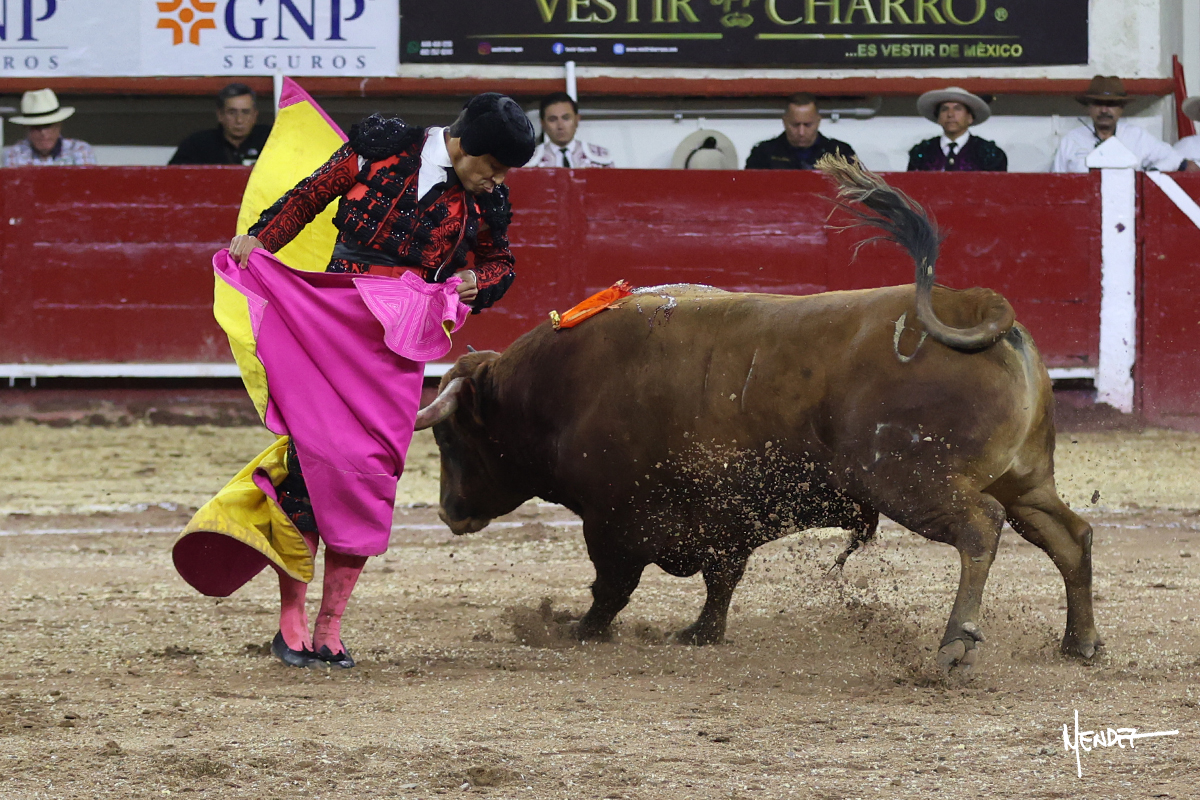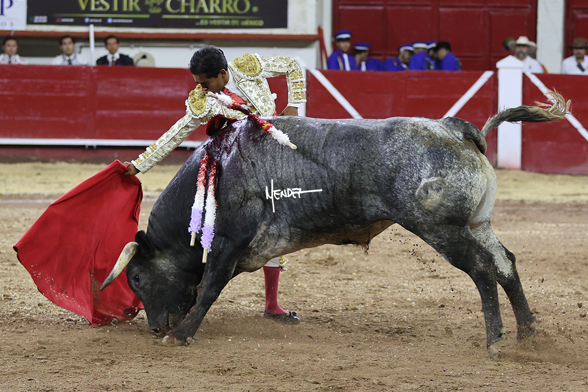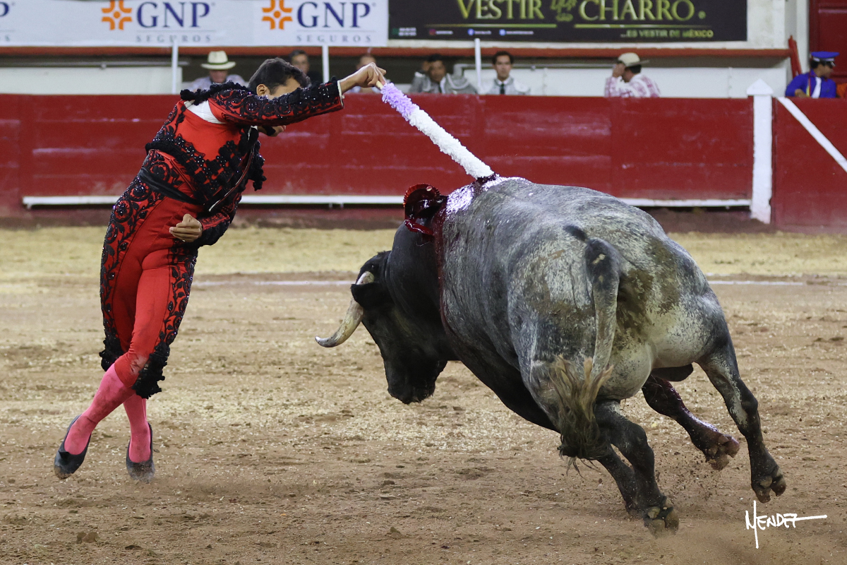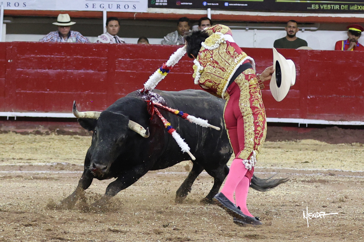 Leo Valadez se fue a los medios para recibir con una larga cambiada de rodillas al primero de la tarde, sin embargo, el animal se estrelló contra el burladero y solo pudieron apuntillarlo. En su lugar, salió “Fundador” un toro de Marco Garfias al que también saludó desde los medios con una larga cambiada. Le arrebató el capote de las manos, pero volvió a repetir su saludo junto a las tablas. Después de su quite por chicuelinas, Leo invitó a sus compañeros de terna a poner las banderillas, completando un tercio variado y lleno de emoción que gustó en los tendidos. Brindó al público y comenzó su faena de rodillas en el tercio, pasándolo por ambos pitones para después ganarle terreno poco a poco. Se definió por el pitón derecho de un toro bronco que soltaba la cara a su salida y se descomponía con facilidad. Cambió al pitón izquierdo para mostrarlo al natural y le avisó, pero aún así Leo decidió continuar y pisar terrenos comprometidos. Lo mantuvo en los medios, con voz firme y fijadora, llevándolo a media altura. Culminó al natural ya en el tercio para pasarlo uno a uno, completando así una labor exigente y muy compleja. Con unas bernadinas dio paso a la suerte suprema con una estocada completa, pero con la que tardó en doblar.