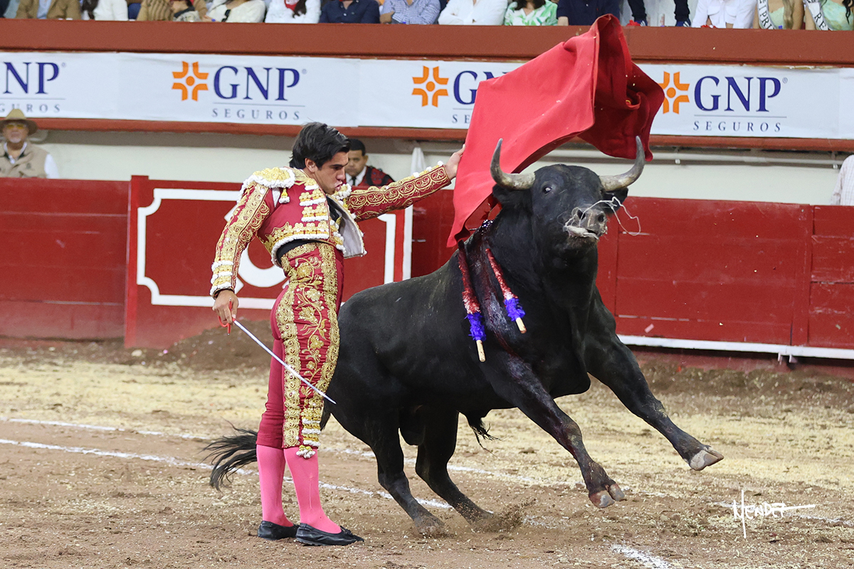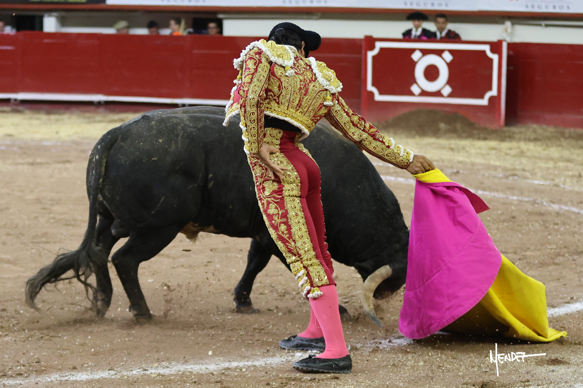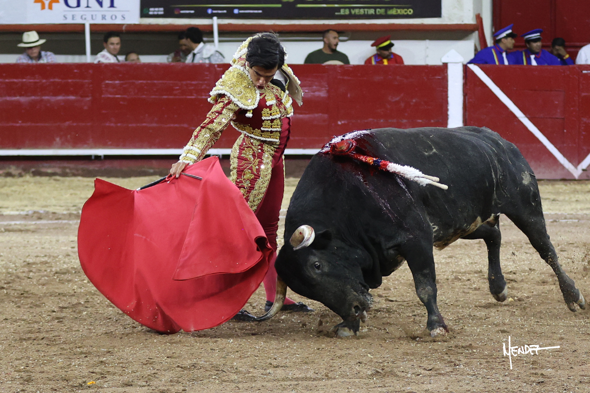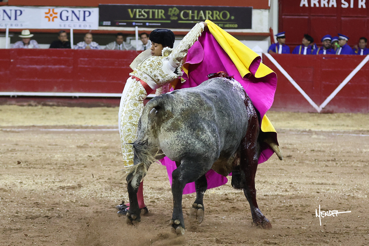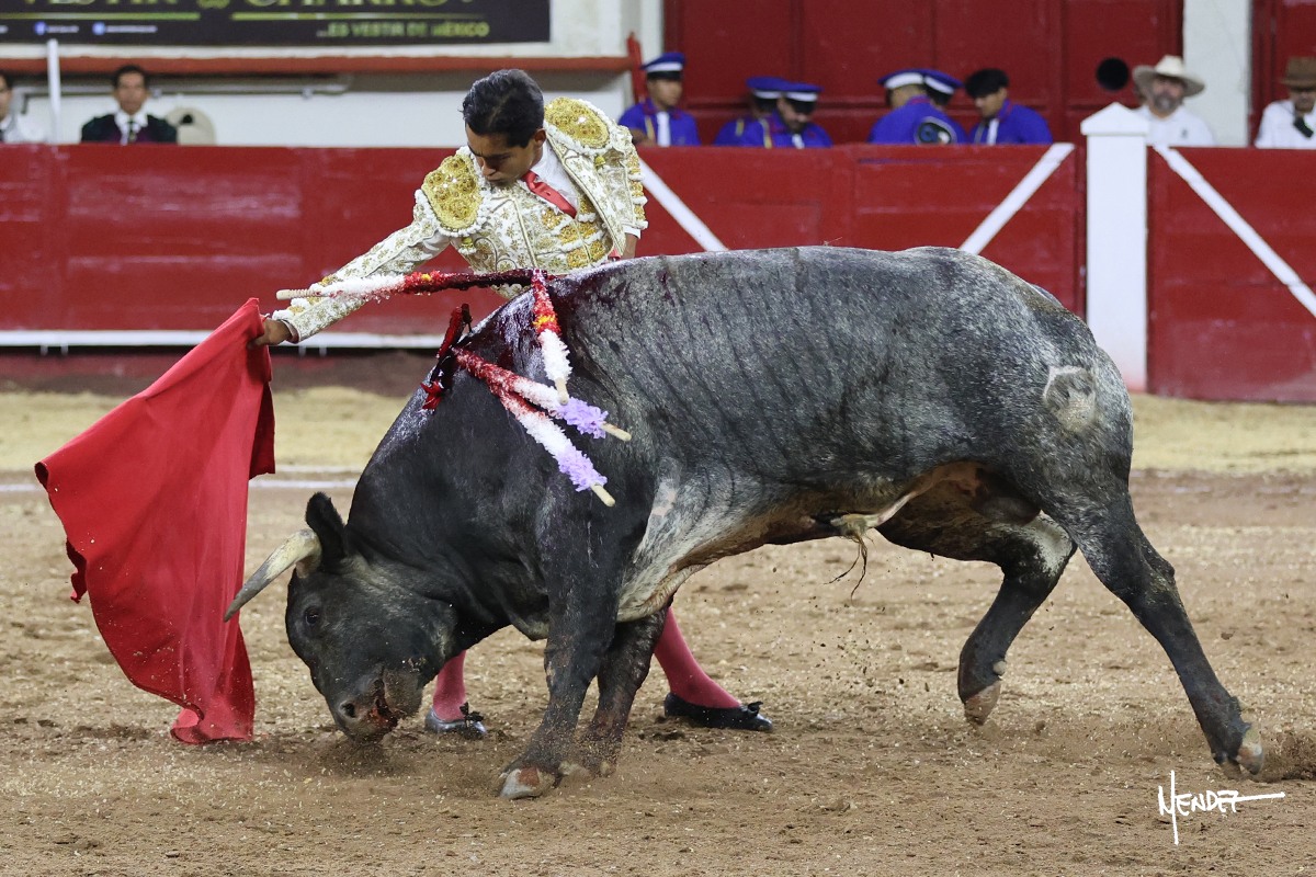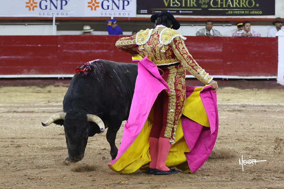 Leo Valadez se fue a los medios para recibir con una larga cambiada de rodillas al primero de la tarde, sin embargo, el animal se estrelló contra el burladero y solo pudieron apuntillarlo. En su lugar, salió “Fundador” un toro de Marco Garfias al que también saludó desde los medios con una larga cambiada. Le arrebató el capote de las manos, pero volvió a repetir su saludo junto a las tablas. Después de su quite por chicuelinas, Leo invitó a sus compañeros de terna a poner las banderillas, completando un tercio variado y lleno de emoción que gustó en los tendidos. Brindó al público y comenzó su faena de rodillas en el tercio, pasándolo por ambos pitones para después ganarle terreno poco a poco. Se definió por el pitón derecho de un toro bronco que soltaba la cara a su salida y se descomponía con facilidad. Cambió al pitón izquierdo para mostrarlo al natural y le avisó, pero aún así Leo decidió continuar y pisar terrenos comprometidos. Lo mantuvo en los medios, con voz firme y fijadora, llevándolo a media altura. Culminó al natural ya en el tercio para pasarlo uno a uno, completando así una labor exigente y muy compleja. Con unas bernadinas dio paso a la suerte suprema con una estocada completa, pero con la que tardó en doblar.