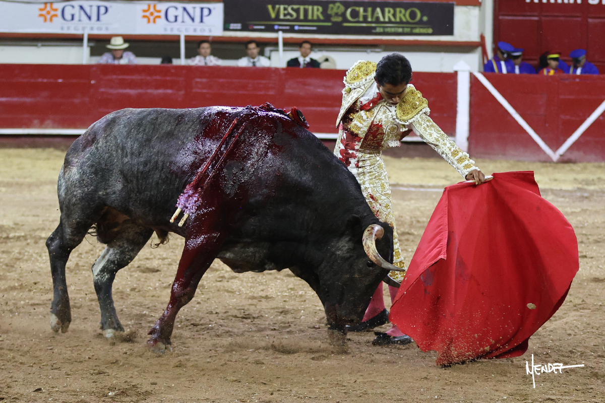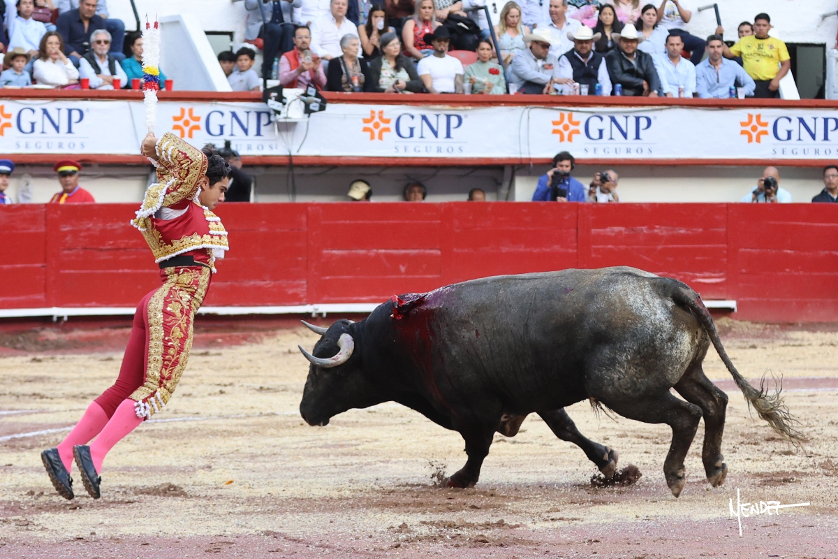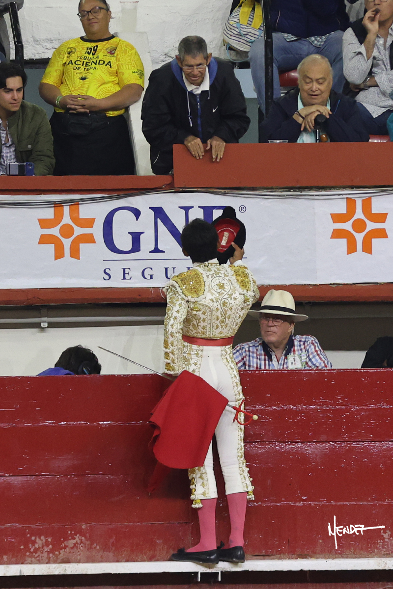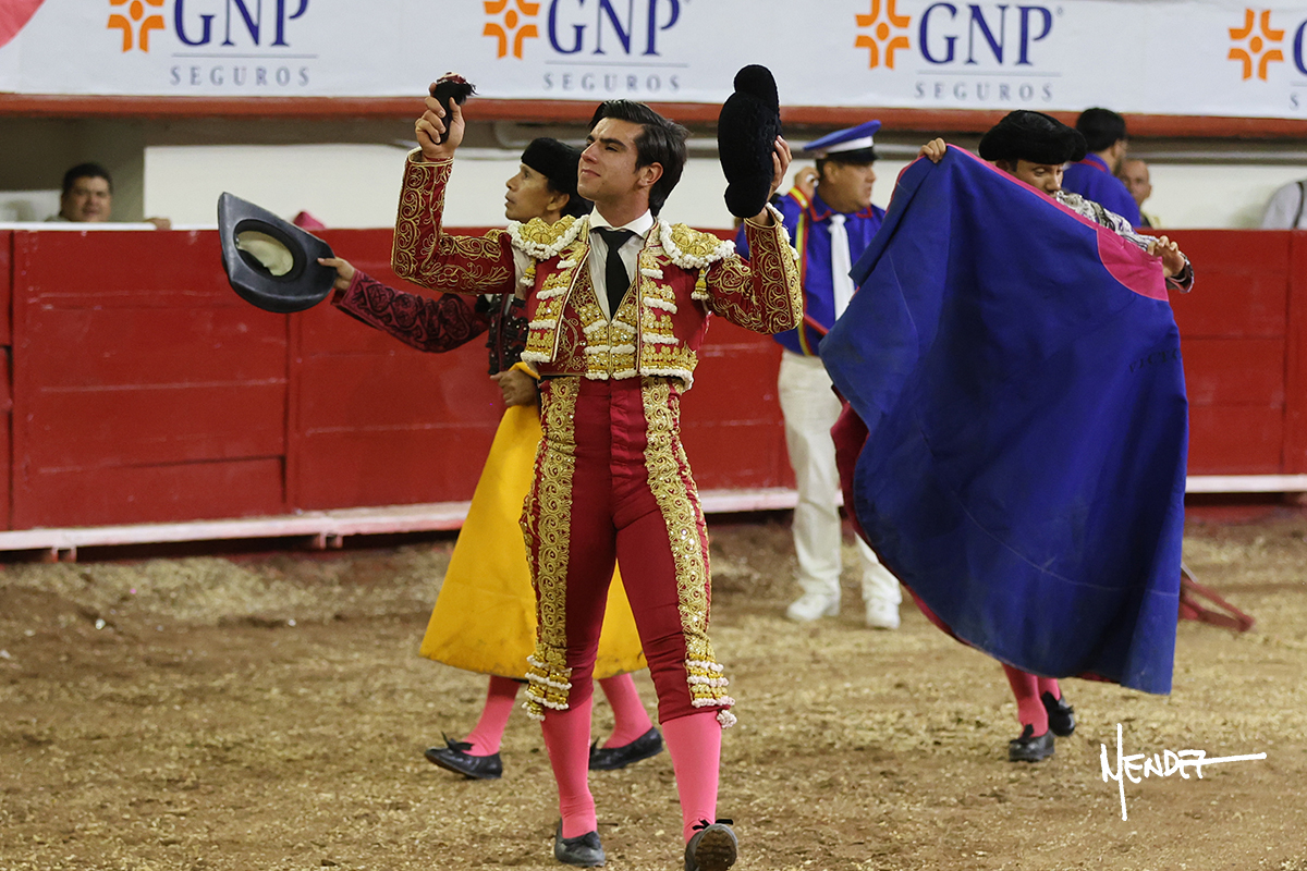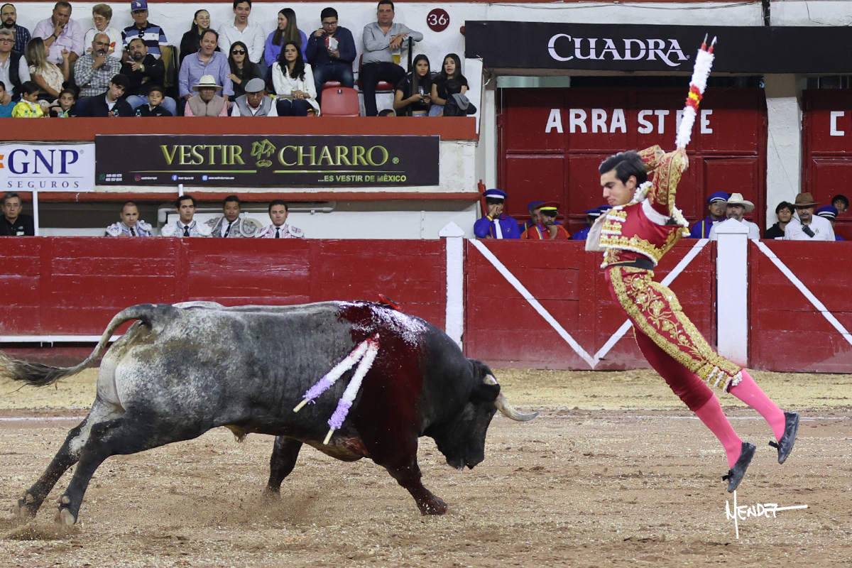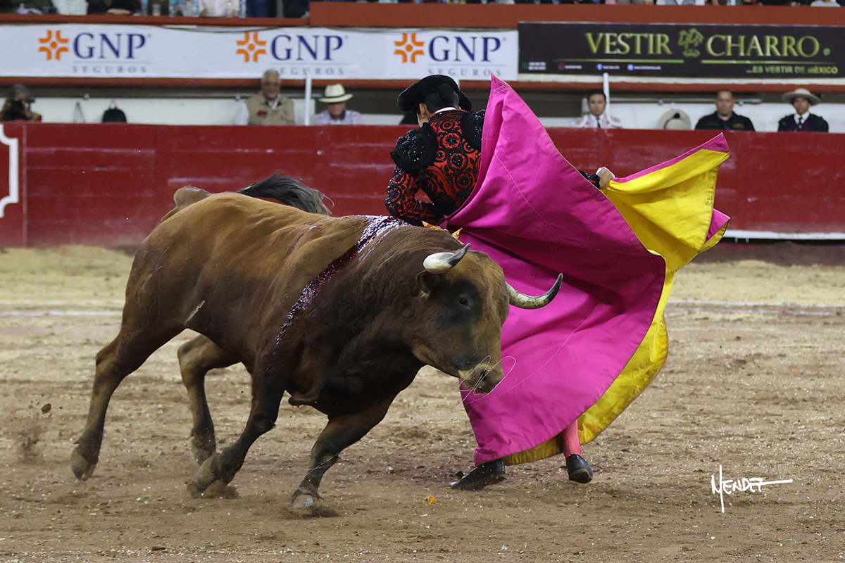 Leo Valadez se fue a los medios para recibir con una larga cambiada de rodillas al primero de la tarde, sin embargo, el animal se estrelló contra el burladero y solo pudieron apuntillarlo. En su lugar, salió “Fundador” un toro de Marco Garfias al que también saludó desde los medios con una larga cambiada. Le arrebató el capote de las manos, pero volvió a repetir su saludo junto a las tablas. Después de su quite por chicuelinas, Leo invitó a sus compañeros de terna a poner las banderillas, completando un tercio variado y lleno de emoción que gustó en los tendidos. Brindó al público y comenzó su faena de rodillas en el tercio, pasándolo por ambos pitones para después ganarle terreno poco a poco. Se definió por el pitón derecho de un toro bronco que soltaba la cara a su salida y se descomponía con facilidad. Cambió al pitón izquierdo para mostrarlo al natural y le avisó, pero aún así Leo decidió continuar y pisar terrenos comprometidos. Lo mantuvo en los medios, con voz firme y fijadora, llevándolo a media altura. Culminó al natural ya en el tercio para pasarlo uno a uno, completando así una labor exigente y muy compleja. Con unas bernadinas dio paso a la suerte suprema con una estocada completa, pero con la que tardó en doblar.