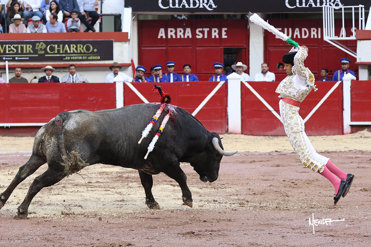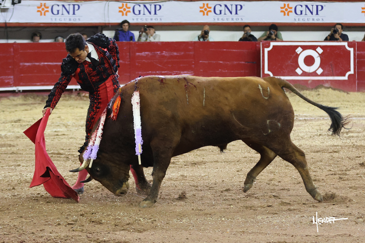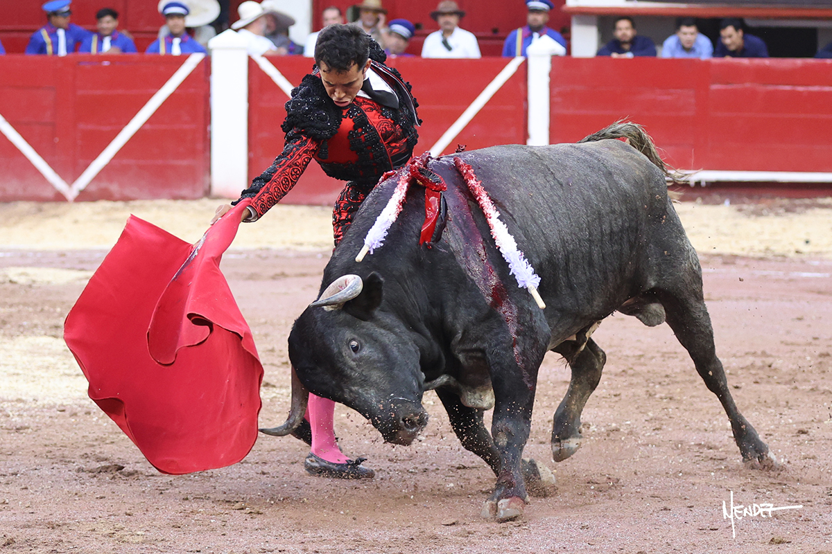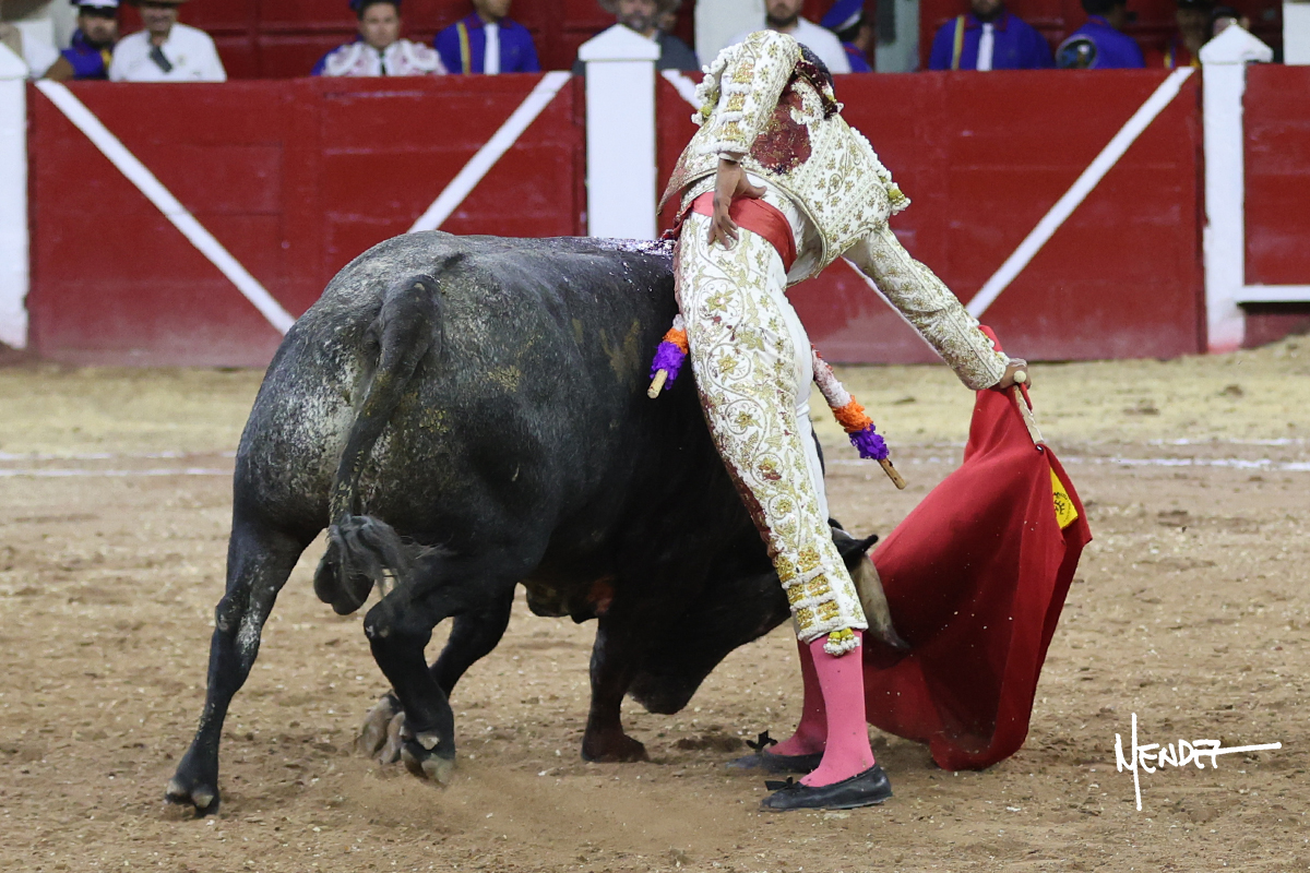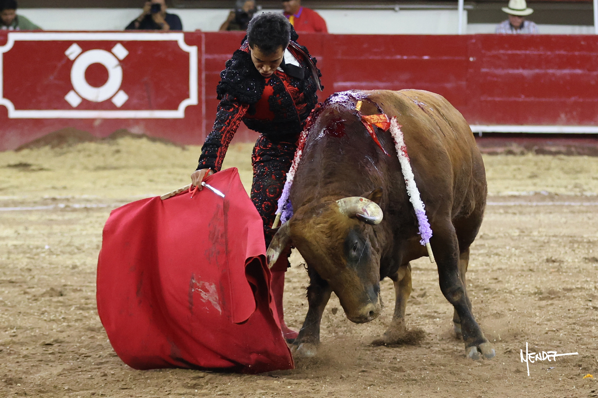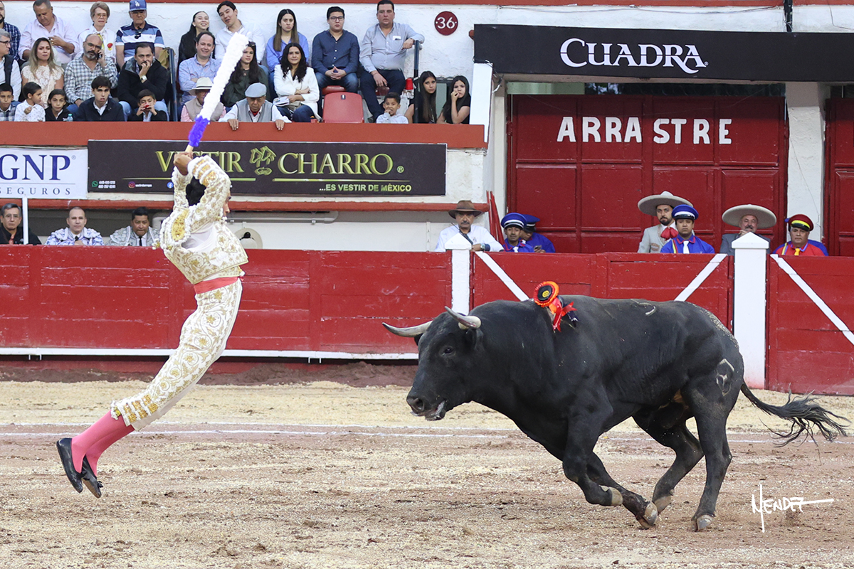 Leo Valadez se fue a los medios para recibir con una larga cambiada de rodillas al primero de la tarde, sin embargo, el animal se estrelló contra el burladero y solo pudieron apuntillarlo. En su lugar, salió “Fundador” un toro de Marco Garfias al que también saludó desde los medios con una larga cambiada. Le arrebató el capote de las manos, pero volvió a repetir su saludo junto a las tablas. Después de su quite por chicuelinas, Leo invitó a sus compañeros de terna a poner las banderillas, completando un tercio variado y lleno de emoción que gustó en los tendidos. Brindó al público y comenzó su faena de rodillas en el tercio, pasándolo por ambos pitones para después ganarle terreno poco a poco. Se definió por el pitón derecho de un toro bronco que soltaba la cara a su salida y se descomponía con facilidad. Cambió al pitón izquierdo para mostrarlo al natural y le avisó, pero aún así Leo decidió continuar y pisar terrenos comprometidos. Lo mantuvo en los medios, con voz firme y fijadora, llevándolo a media altura. Culminó al natural ya en el tercio para pasarlo uno a uno, completando así una labor exigente y muy compleja. Con unas bernadinas dio paso a la suerte suprema con una estocada completa, pero con la que tardó en doblar.
