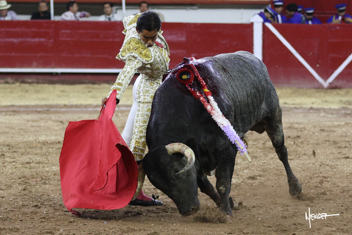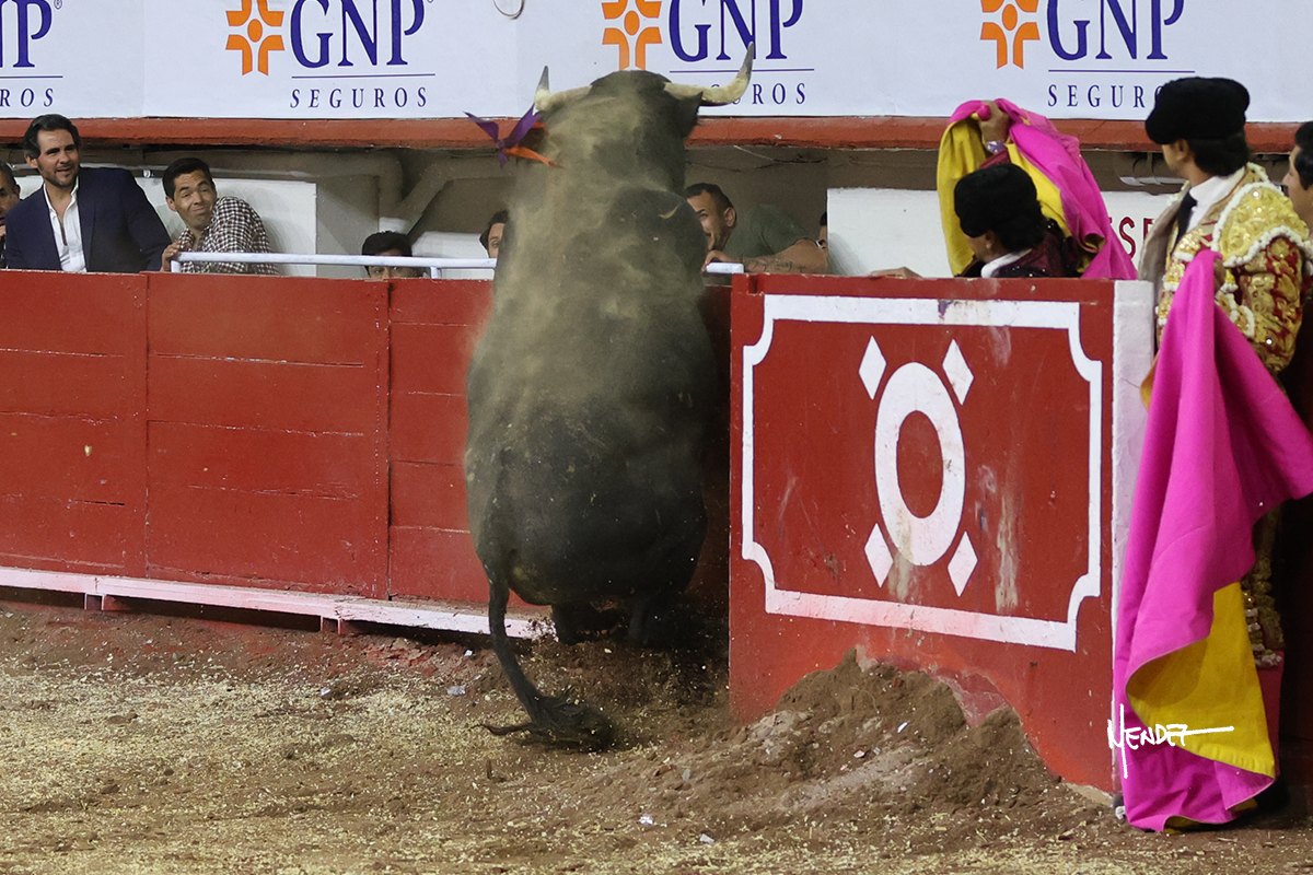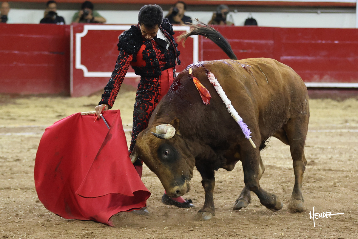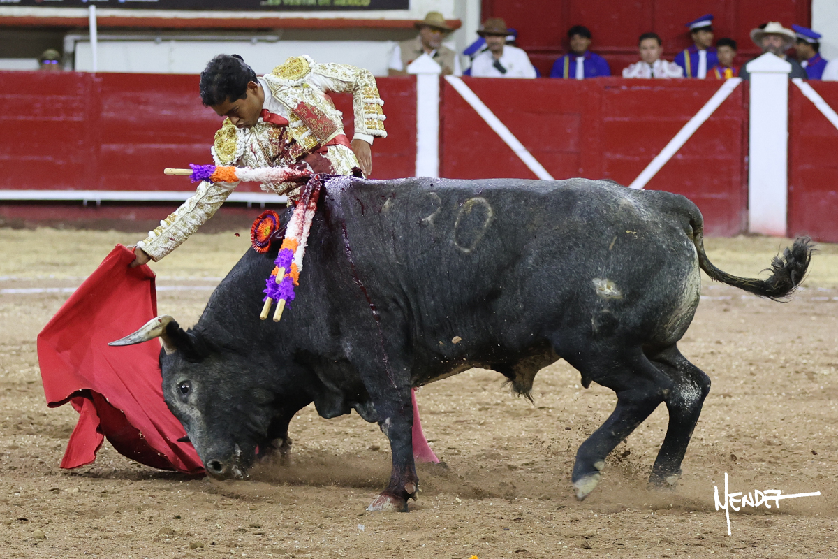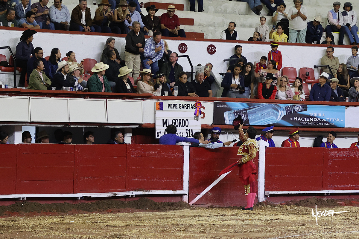 Leo Valadez se fue a los medios para recibir con una larga cambiada de rodillas al primero de la tarde, sin embargo, el animal se estrelló contra el burladero y solo pudieron apuntillarlo. En su lugar, salió “Fundador” un toro de Marco Garfias al que también saludó desde los medios con una larga cambiada. Le arrebató el capote de las manos, pero volvió a repetir su saludo junto a las tablas. Después de su quite por chicuelinas, Leo invitó a sus compañeros de terna a poner las banderillas, completando un tercio variado y lleno de emoción que gustó en los tendidos. Brindó al público y comenzó su faena de rodillas en el tercio, pasándolo por ambos pitones para después ganarle terreno poco a poco. Se definió por el pitón derecho de un toro bronco que soltaba la cara a su salida y se descomponía con facilidad. Cambió al pitón izquierdo para mostrarlo al natural y le avisó, pero aún así Leo decidió continuar y pisar terrenos comprometidos. Lo mantuvo en los medios, con voz firme y fijadora, llevándolo a media altura. Culminó al natural ya en el tercio para pasarlo uno a uno, completando así una labor exigente y muy compleja. Con unas bernadinas dio paso a la suerte suprema con una estocada completa, pero con la que tardó en doblar.