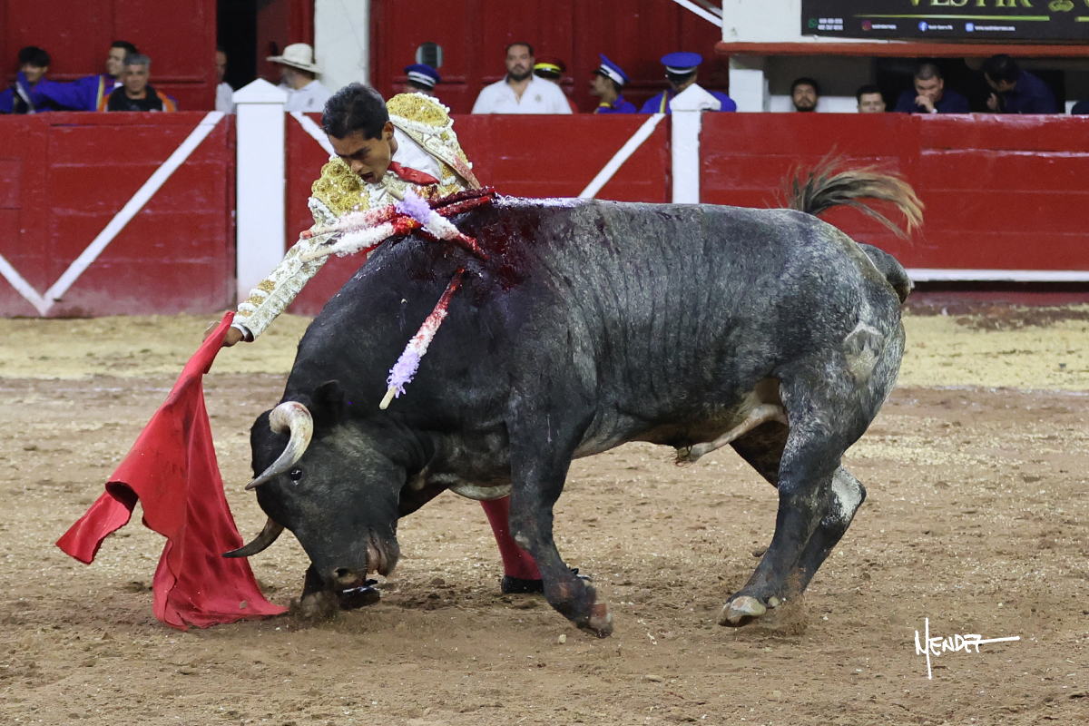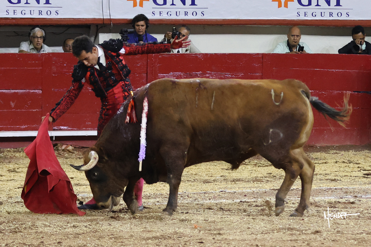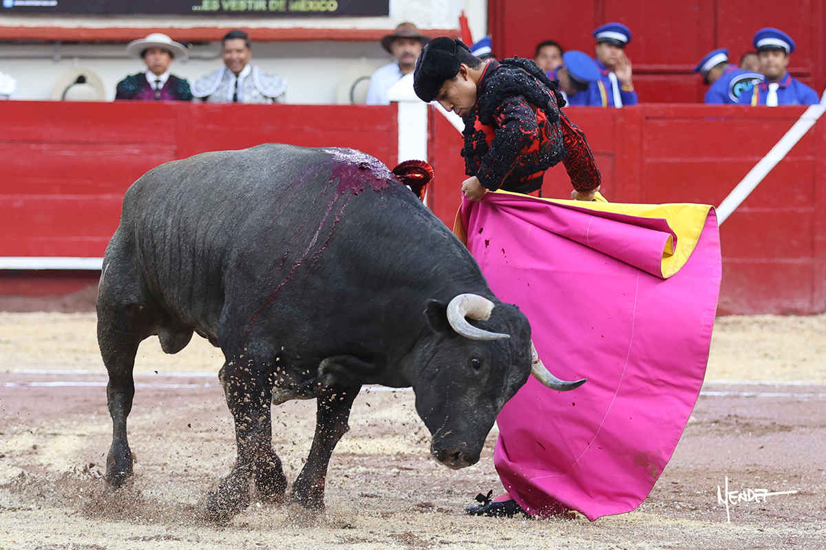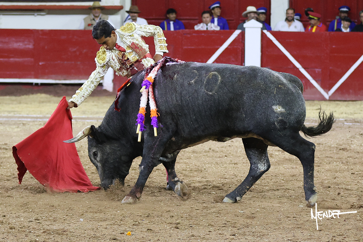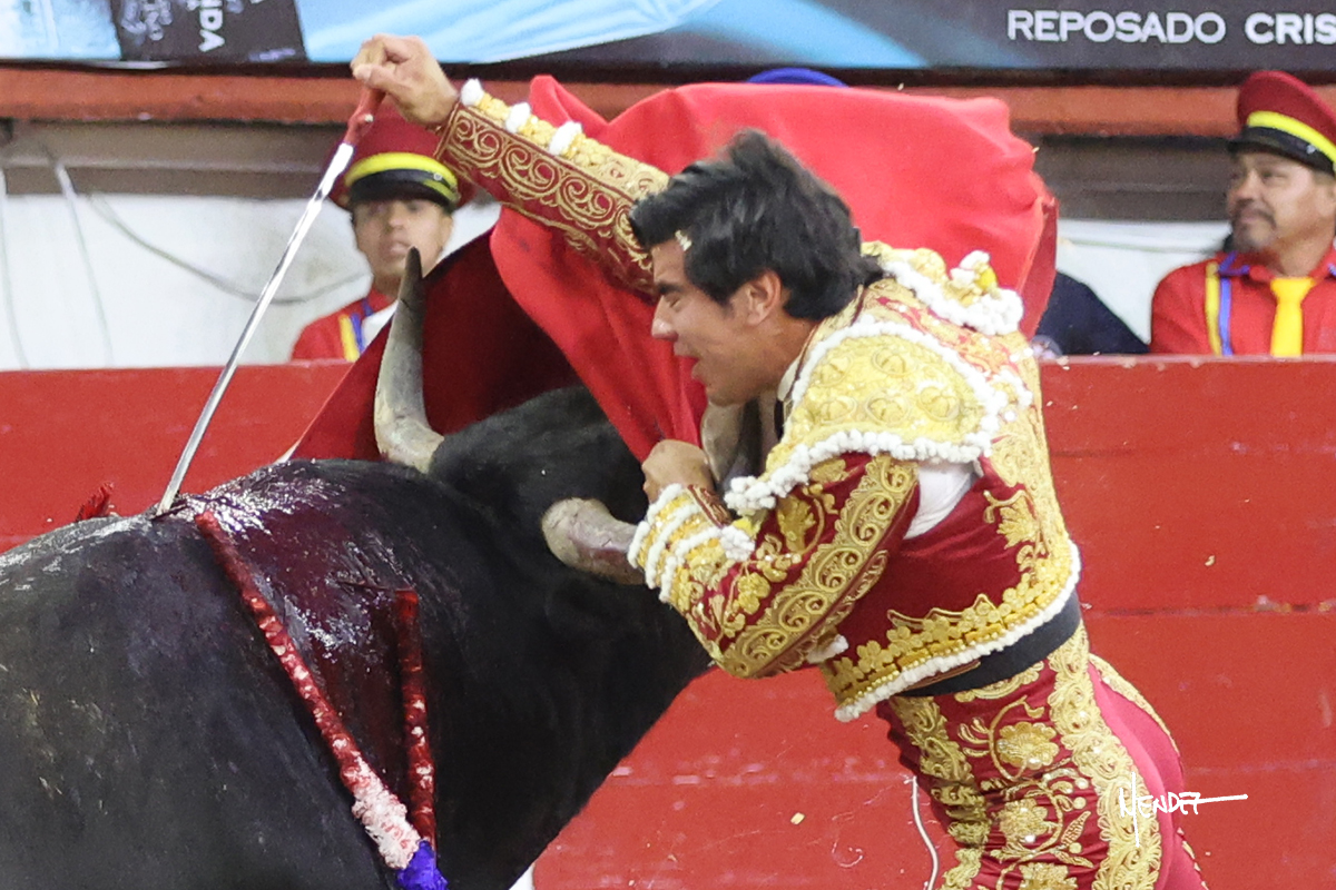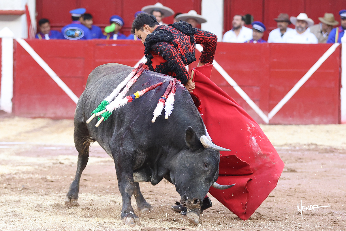 Leo Valadez se fue a los medios para recibir con una larga cambiada de rodillas al primero de la tarde, sin embargo, el animal se estrelló contra el burladero y solo pudieron apuntillarlo. En su lugar, salió “Fundador” un toro de Marco Garfias al que también saludó desde los medios con una larga cambiada. Le arrebató el capote de las manos, pero volvió a repetir su saludo junto a las tablas. Después de su quite por chicuelinas, Leo invitó a sus compañeros de terna a poner las banderillas, completando un tercio variado y lleno de emoción que gustó en los tendidos. Brindó al público y comenzó su faena de rodillas en el tercio, pasándolo por ambos pitones para después ganarle terreno poco a poco. Se definió por el pitón derecho de un toro bronco que soltaba la cara a su salida y se descomponía con facilidad. Cambió al pitón izquierdo para mostrarlo al natural y le avisó, pero aún así Leo decidió continuar y pisar terrenos comprometidos. Lo mantuvo en los medios, con voz firme y fijadora, llevándolo a media altura. Culminó al natural ya en el tercio para pasarlo uno a uno, completando así una labor exigente y muy compleja. Con unas bernadinas dio paso a la suerte suprema con una estocada completa, pero con la que tardó en doblar.
