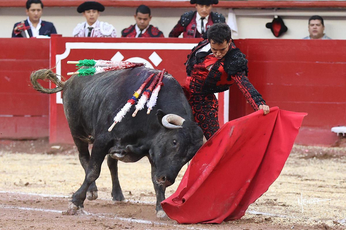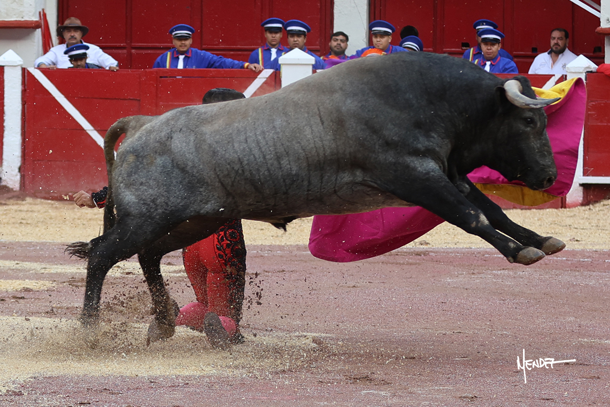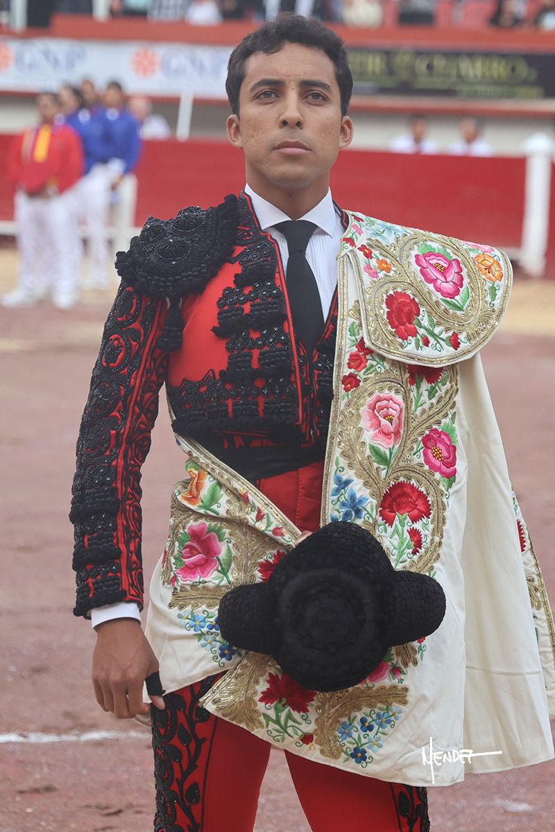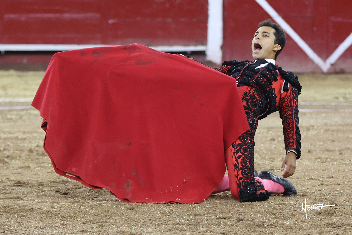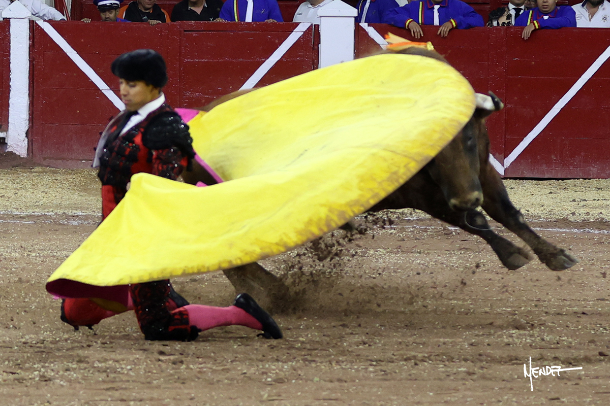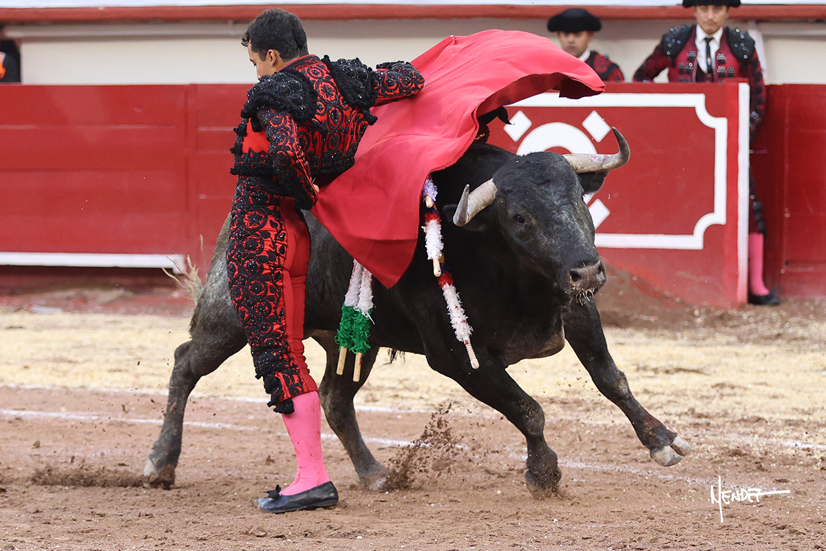 Leo Valadez se fue a los medios para recibir con una larga cambiada de rodillas al primero de la tarde, sin embargo, el animal se estrelló contra el burladero y solo pudieron apuntillarlo. En su lugar, salió “Fundador” un toro de Marco Garfias al que también saludó desde los medios con una larga cambiada. Le arrebató el capote de las manos, pero volvió a repetir su saludo junto a las tablas. Después de su quite por chicuelinas, Leo invitó a sus compañeros de terna a poner las banderillas, completando un tercio variado y lleno de emoción que gustó en los tendidos. Brindó al público y comenzó su faena de rodillas en el tercio, pasándolo por ambos pitones para después ganarle terreno poco a poco. Se definió por el pitón derecho de un toro bronco que soltaba la cara a su salida y se descomponía con facilidad. Cambió al pitón izquierdo para mostrarlo al natural y le avisó, pero aún así Leo decidió continuar y pisar terrenos comprometidos. Lo mantuvo en los medios, con voz firme y fijadora, llevándolo a media altura. Culminó al natural ya en el tercio para pasarlo uno a uno, completando así una labor exigente y muy compleja. Con unas bernadinas dio paso a la suerte suprema con una estocada completa, pero con la que tardó en doblar.