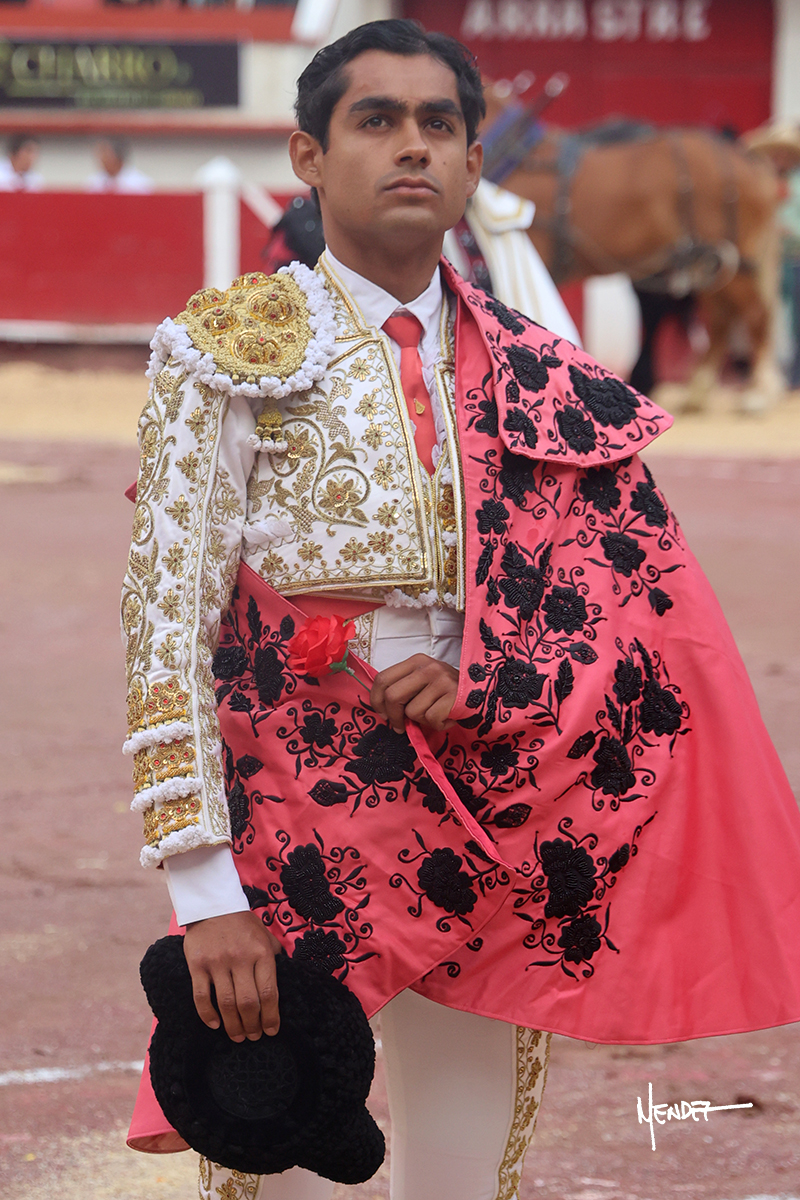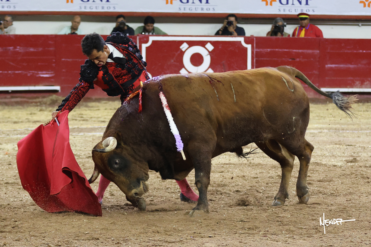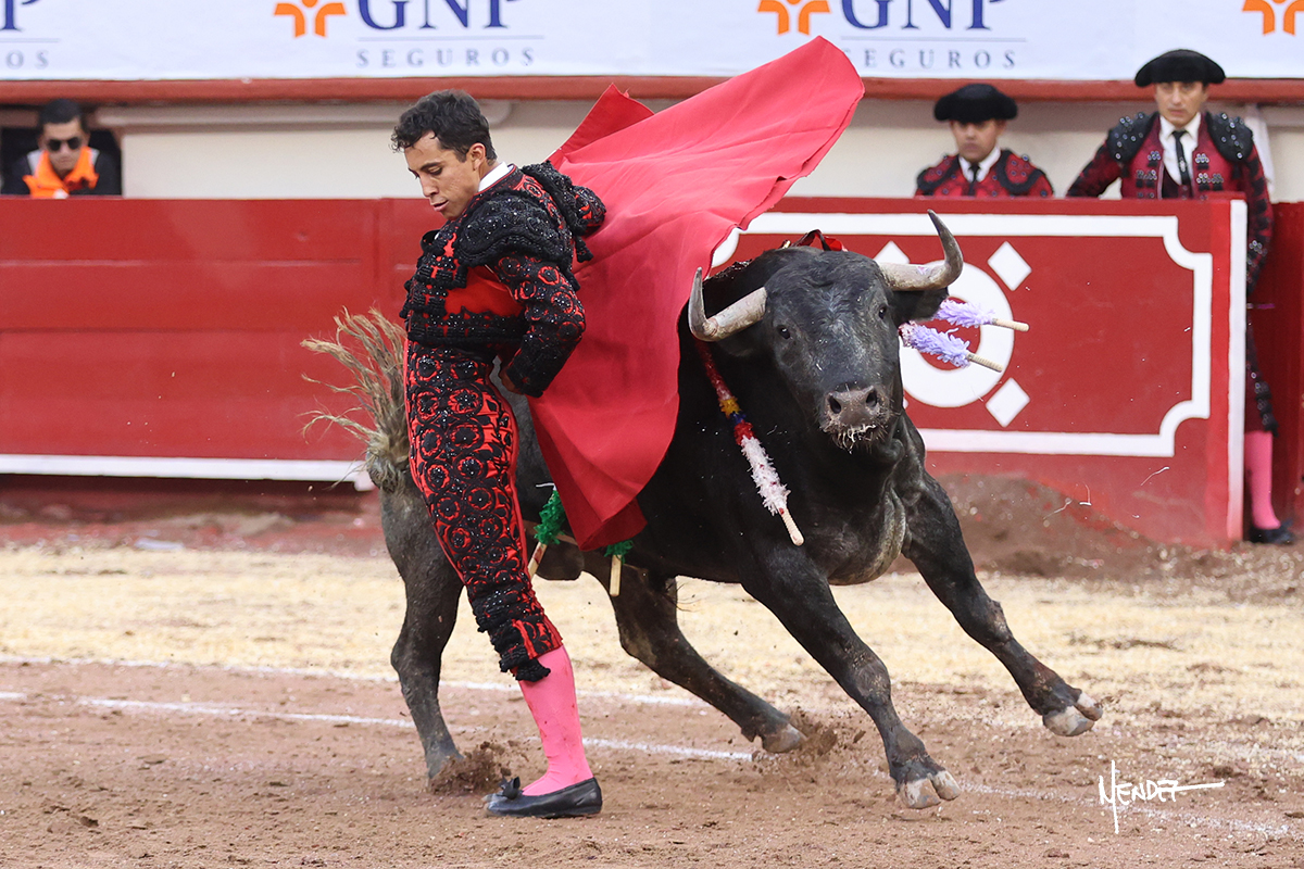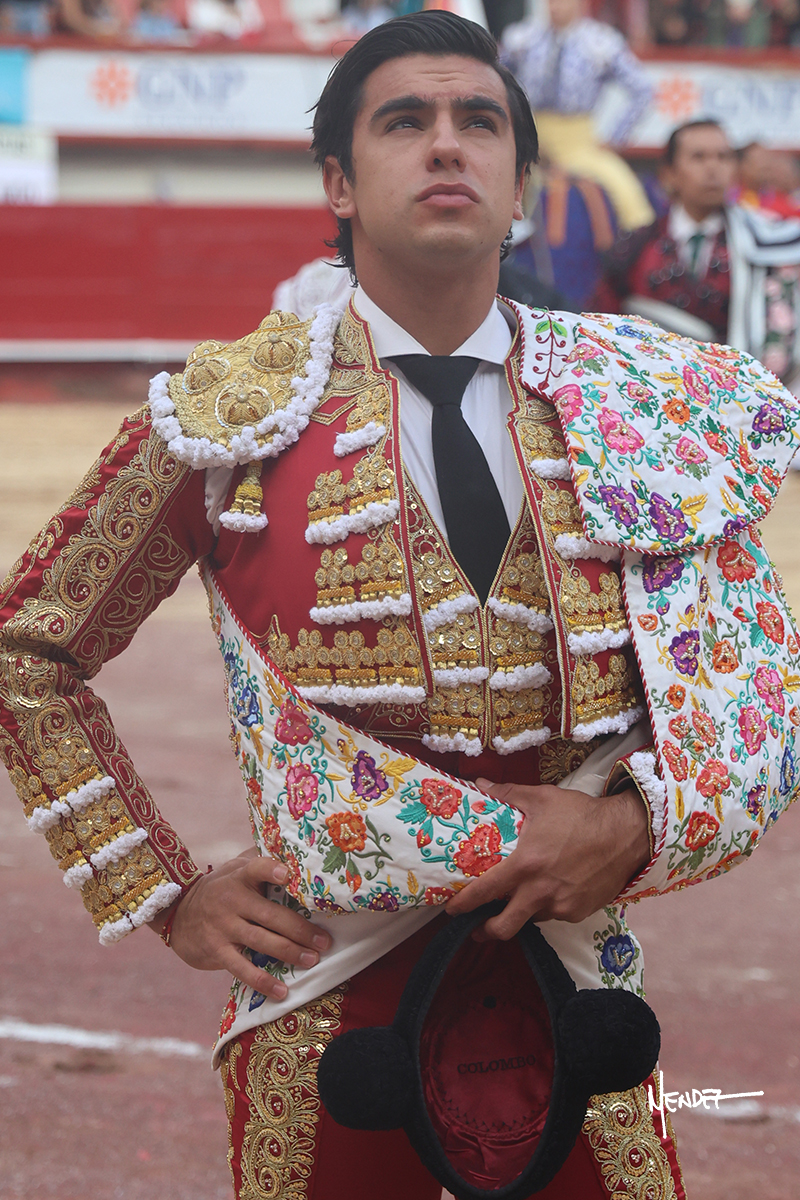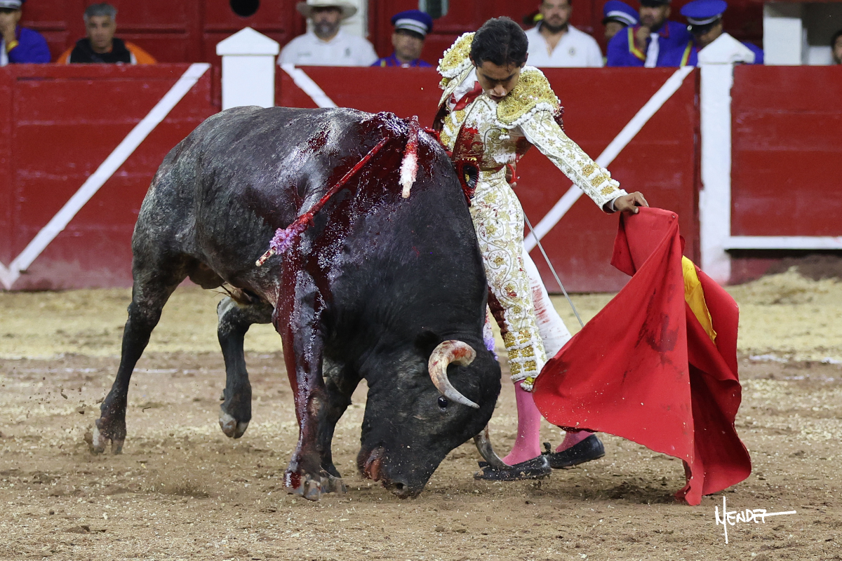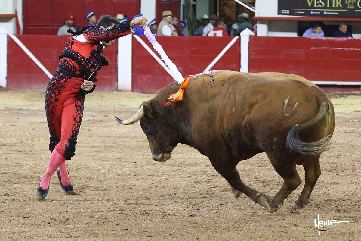 Leo Valadez se fue a los medios para recibir con una larga cambiada de rodillas al primero de la tarde, sin embargo, el animal se estrelló contra el burladero y solo pudieron apuntillarlo. En su lugar, salió “Fundador” un toro de Marco Garfias al que también saludó desde los medios con una larga cambiada. Le arrebató el capote de las manos, pero volvió a repetir su saludo junto a las tablas. Después de su quite por chicuelinas, Leo invitó a sus compañeros de terna a poner las banderillas, completando un tercio variado y lleno de emoción que gustó en los tendidos. Brindó al público y comenzó su faena de rodillas en el tercio, pasándolo por ambos pitones para después ganarle terreno poco a poco. Se definió por el pitón derecho de un toro bronco que soltaba la cara a su salida y se descomponía con facilidad. Cambió al pitón izquierdo para mostrarlo al natural y le avisó, pero aún así Leo decidió continuar y pisar terrenos comprometidos. Lo mantuvo en los medios, con voz firme y fijadora, llevándolo a media altura. Culminó al natural ya en el tercio para pasarlo uno a uno, completando así una labor exigente y muy compleja. Con unas bernadinas dio paso a la suerte suprema con una estocada completa, pero con la que tardó en doblar.