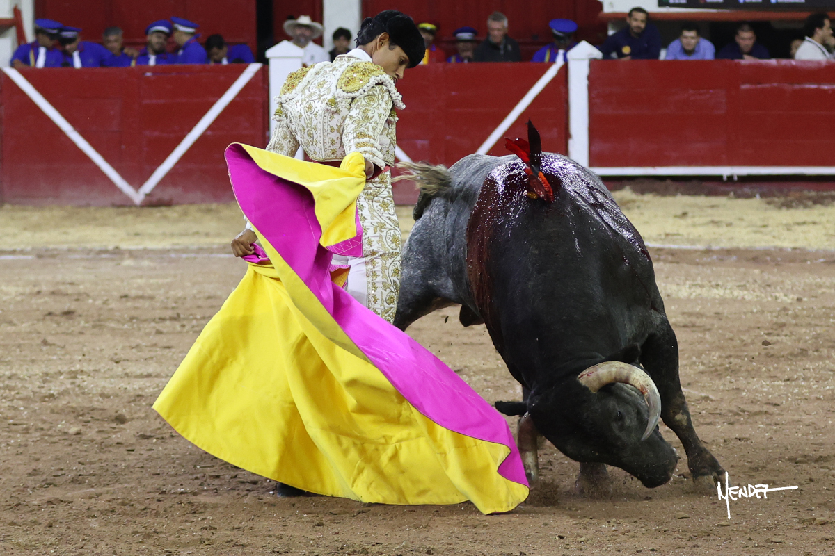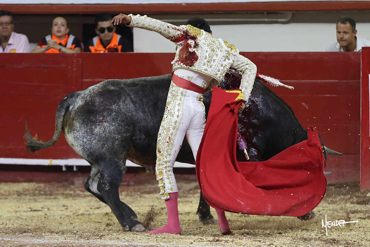 Colombo saludó a su primero con algunos detalles toreros mientras le ganaba terreno. El tercio de banderillas lo volvieron a compartir entre ellos, dando juego y variedad. Brindó a los tendidos para comenzar su labor de muleta junto a las tablas a pies juntos, le fue ganando terreno y se lo llevó al tercio, donde siguió pasándolo a pies juntos para después bajarle la mano y tratar de pasar a un toro que atendía pero siendo tardón. Continuó por el derecho, bajándole la mano y tratando de llevarlo en largo, muy metido. Tuvo que insistirle en los toques para fijarlo y meterlo, siempre con la muleta puesta. Cambió al pitón izquierdo, encontrando mayor ritmo y profundidad, conectando con los tendidos. Encontró el acople, aunque sin poder evitar la brusquedad de sus embestidas. Lo hizo pasar a base de voluntad y raza, pero el toro ya no tenía contenido en sus embestidas. Deslució en el acero.