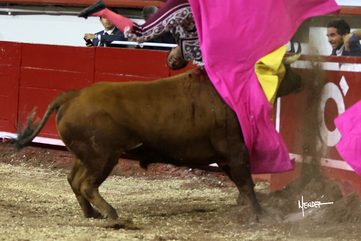 Alejandro Adame trató de estirarse en saludo capotero ante el tercero, pero no le brindó demasiadas opciones. Se lució por saltilleras en su quite para que después v o vieran a banderillear Valadez, Colombo y Adame. Brindó al público y en particular a Elías “La Changuita”. Comenzó su labor de muleta llevándoselo a los medios para definirse por el pitón derecho, a base de paciencia y despaciosidad. El animal bajaba la cara, pero necesitaba para y recomponer para no deslucir en sus series, por lo que encontró la ligazón en el uno a uno. Se vencía por dentro y aunque la música empezó a sonar, Adame pidió que parase. Fue una meritoria faena medida milimétricamente, logrando una tanda completa por el derecho. Cambió al natural para llevarlo en largo, adelantándole el engaño a la cara y tirar de su embestida muy despacio, manteniendo siempre el engaño en la cara. Retomó el pitón derecho para someterlo y hacerse con aquella teclosa embestida con la que logró el reconocimiento de los tendidos. Se adornó mientras le daba tiempo al toro, continuando con un molinete y una serie sobre el derecho en la que se lo envolvió. Se vació toreando a un toro que se mantuvo fijo en la tela. Culminaba por manoletinas mientras le sonaba el primer aviso.