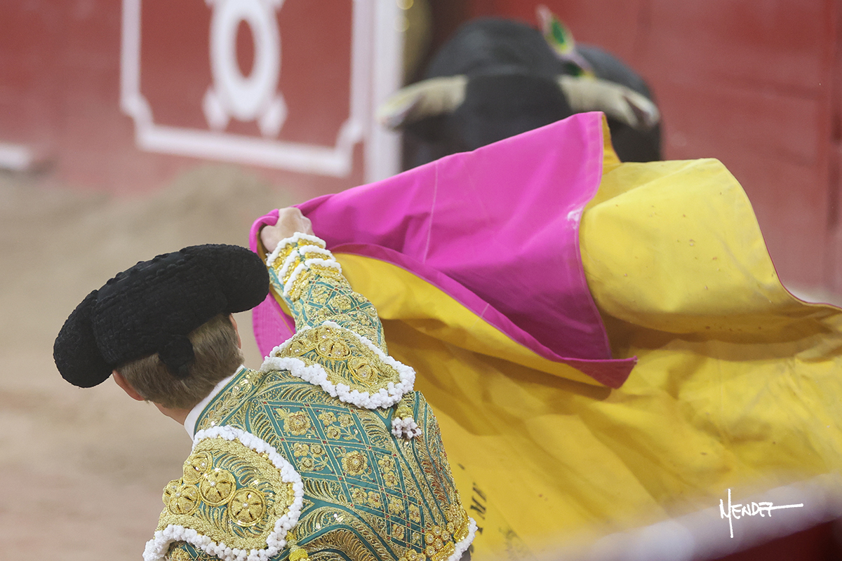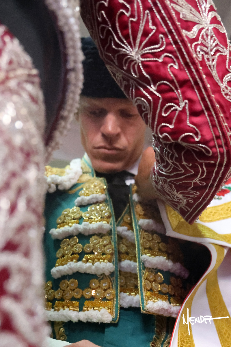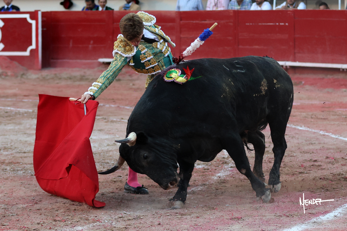 Borja Jiménez se dispuso de rodillas junto a las tablas para recibir con una larga cambiada al segundo de la tarde. Después se estiró con lucimiento. Borja tomó la muleta y desde los medios brindó al público para después pasarlo por ambos pitones muy despacio, ganándole terreno, doblándose con él para que poco a poco se levantar y se lo envolviera con un toreo en redondo. Continuó sobre el derecho, dándole tiempo y sitio para adelantarle el engaño, tocarlo y deslizarlo en la muleta. Encontró la continuidad en el uno a uno ante un animal algo corto y reservón, pero pasan. Continuó, bajándole la mano, tratando de envolvérselo al compás de los “olé” del respetable. Arrastró la muleta por el albero, llevándolo humillado y totalmente metido. Desarrolló su faena en el tercio, cambió al natural, marcándole el trazo con la ayuda en los primeros pases. Logró pasarlo, aunque poco a poco le fue levantando la mano hasta llevarlo a media altura. No dudó en recuperar el pitón derecho después de aquella tanda al natural. Sin embargo, al anima cada vez le costaba más pasar, teniendo que insistirle con firmeza en la cara para fijarlo y meterlo. Se lo intentó envolver, pero ya no pasaba, así que culminó con un desplante y una estocada certera.