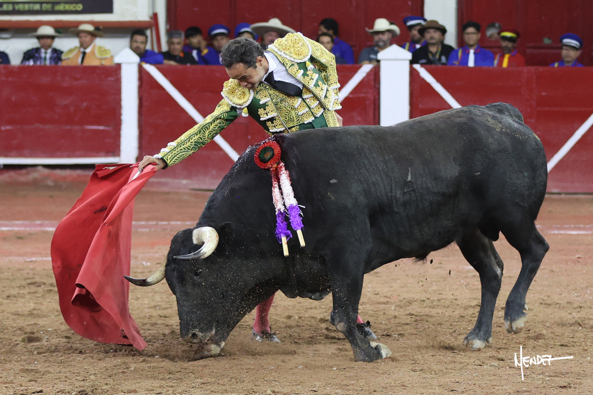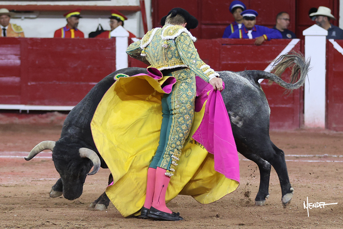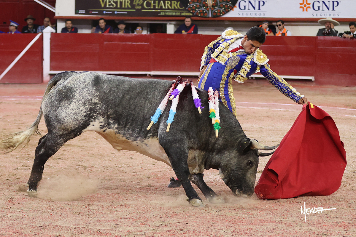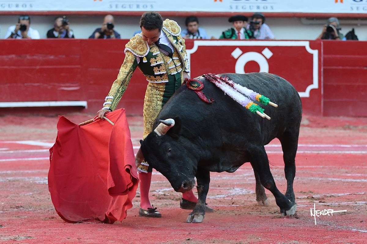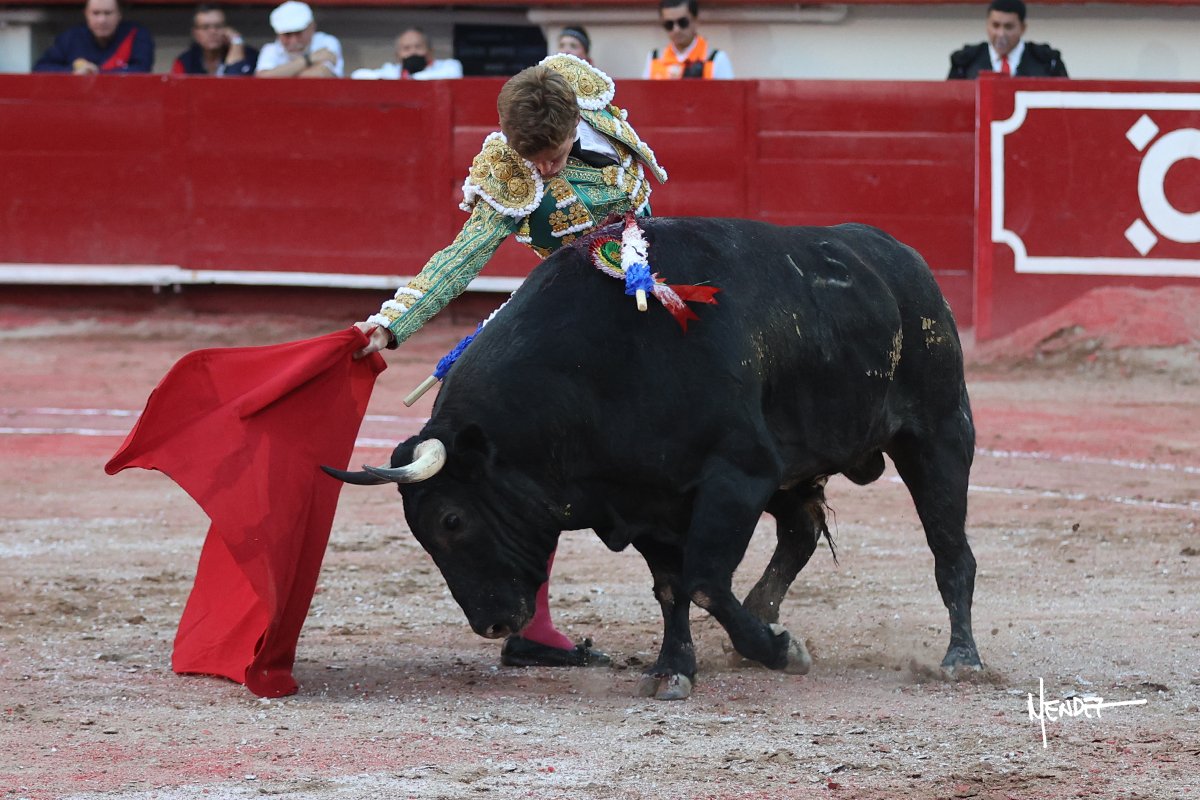 Héctor Gutiérrez saludó a pies juntos al tercero de la tarde, con torería y cadencia. Se fue a los medios y allá se estiró a la verónica. Se alcanzó la faena de muleta y se lo llevó a los medios para iniciar su labor. Lo hizo sobre el pitón derecho, teniendo que tocarlo con firmeza e insistencia en la cara. El animal tenía sus teclas y llevaba un peligro sordo que no facilitaba a Héctor su labor. Cambió al natural y totalmente encajado, se abandonó para darle largura y profundidad a unos pases en los que se gustó y gustó. Continuó por el izquierdo, envolviéndoselo, encontrando ligazón y mucha transmisión, aunque sin poder pasarlo por el derecho, ya que se metía por dentro y lo buscaba. Le dio tiempo y sitio, dosificando las embestidas que volvió a llevar al natural, con firmeza y rotundidad. La capacidad de Héctor se sobrepuso y brilló en una faena que no era nada fácil. A pesar de saber que por el derecho pasaba, lo mostró, jugándosela. Culminó con unos invertidos, pero pinchazo hondo con el que mató al toro.