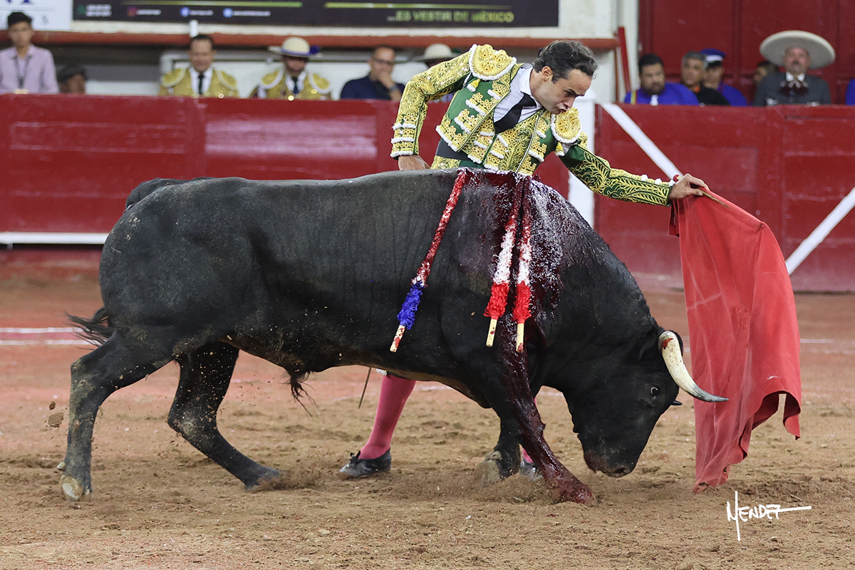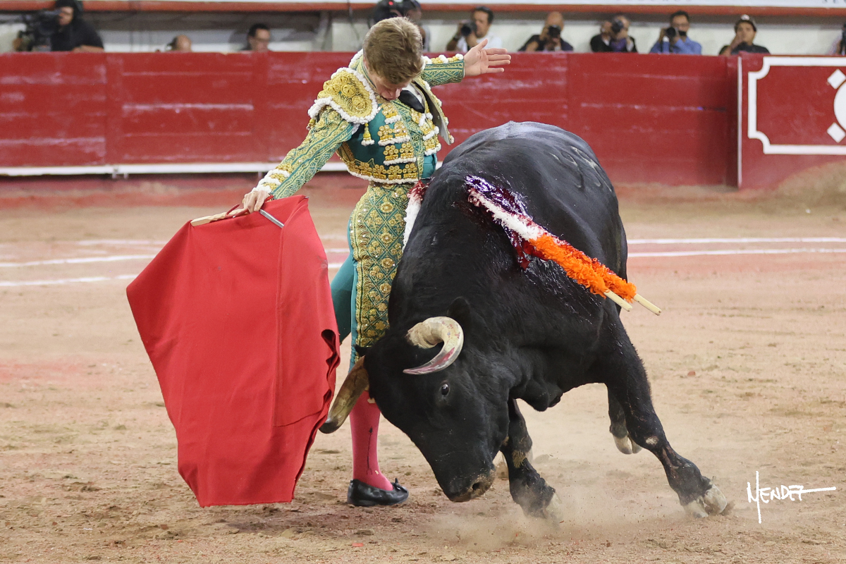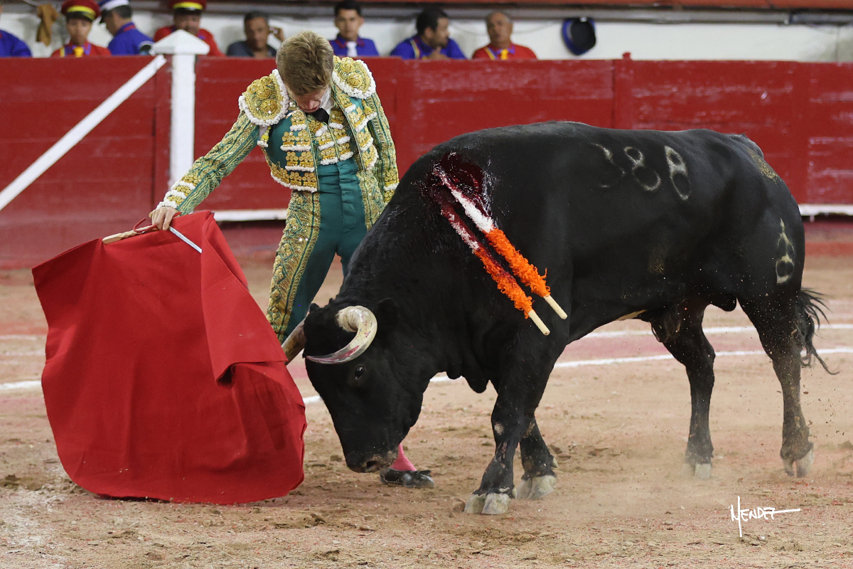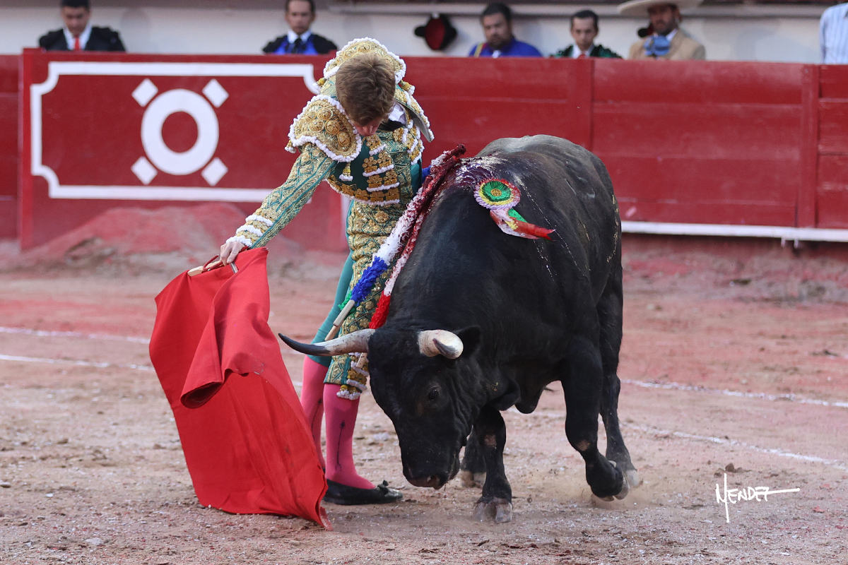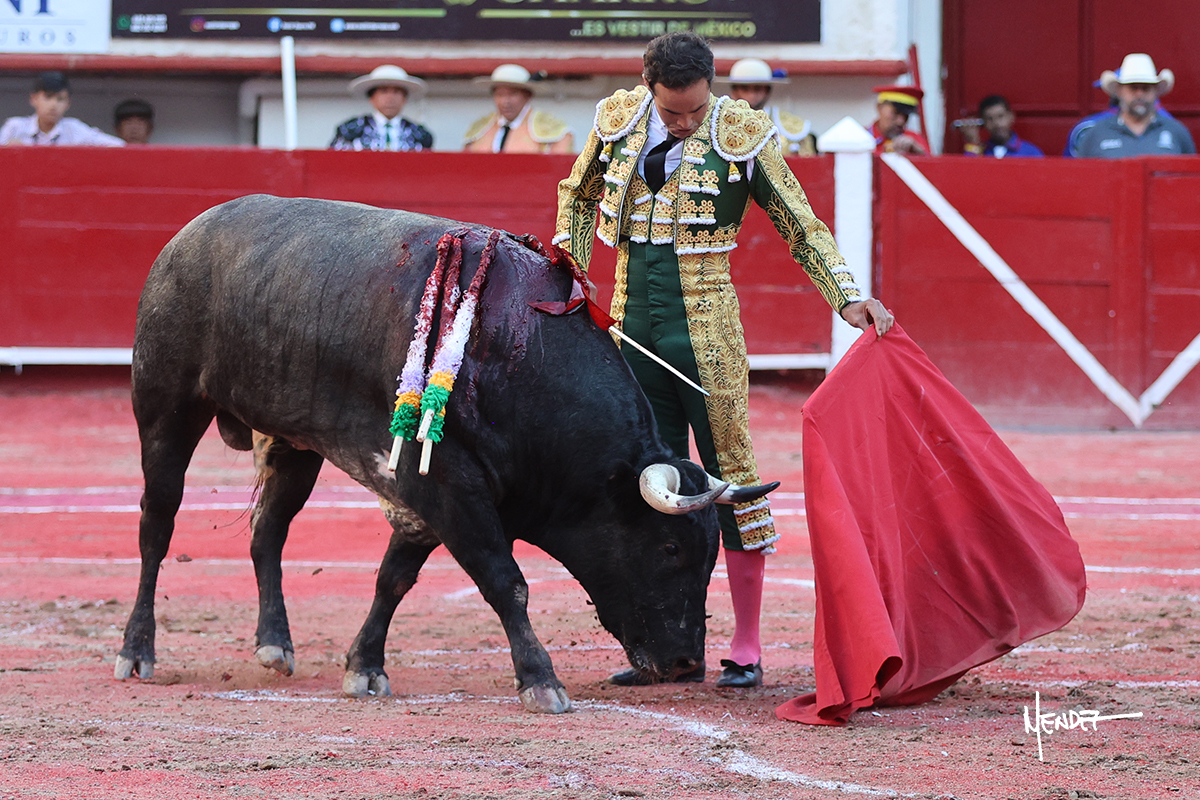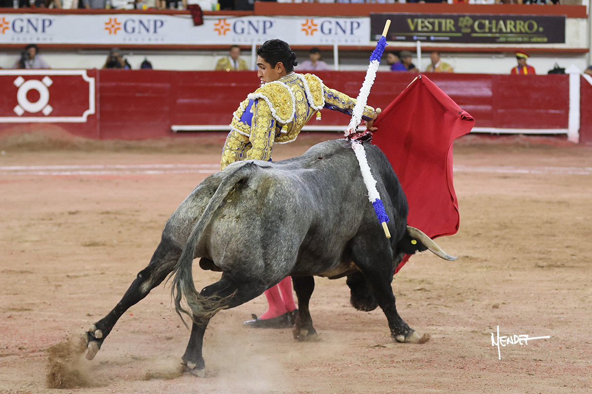 Héctor Gutiérrez saludó a pies juntos al tercero de la tarde, con torería y cadencia. Se fue a los medios y allá se estiró a la verónica. Se alcanzó la faena de muleta y se lo llevó a los medios para iniciar su labor. Lo hizo sobre el pitón derecho, teniendo que tocarlo con firmeza e insistencia en la cara. El animal tenía sus teclas y llevaba un peligro sordo que no facilitaba a Héctor su labor. Cambió al natural y totalmente encajado, se abandonó para darle largura y profundidad a unos pases en los que se gustó y gustó. Continuó por el izquierdo, envolviéndoselo, encontrando ligazón y mucha transmisión, aunque sin poder pasarlo por el derecho, ya que se metía por dentro y lo buscaba. Le dio tiempo y sitio, dosificando las embestidas que volvió a llevar al natural, con firmeza y rotundidad. La capacidad de Héctor se sobrepuso y brilló en una faena que no era nada fácil. A pesar de saber que por el derecho pasaba, lo mostró, jugándosela. Culminó con unos invertidos, pero pinchazo hondo con el que mató al toro.