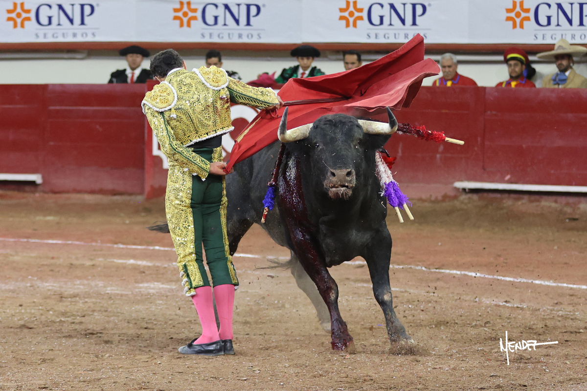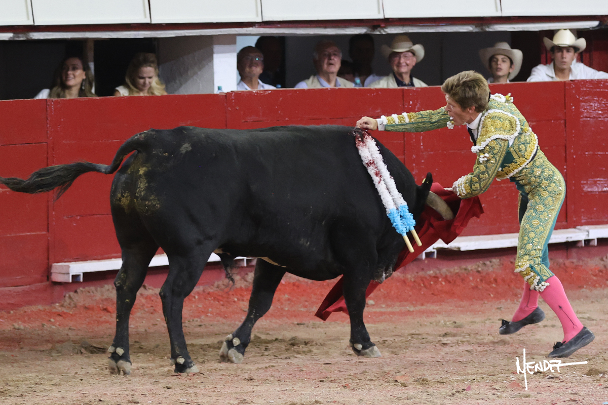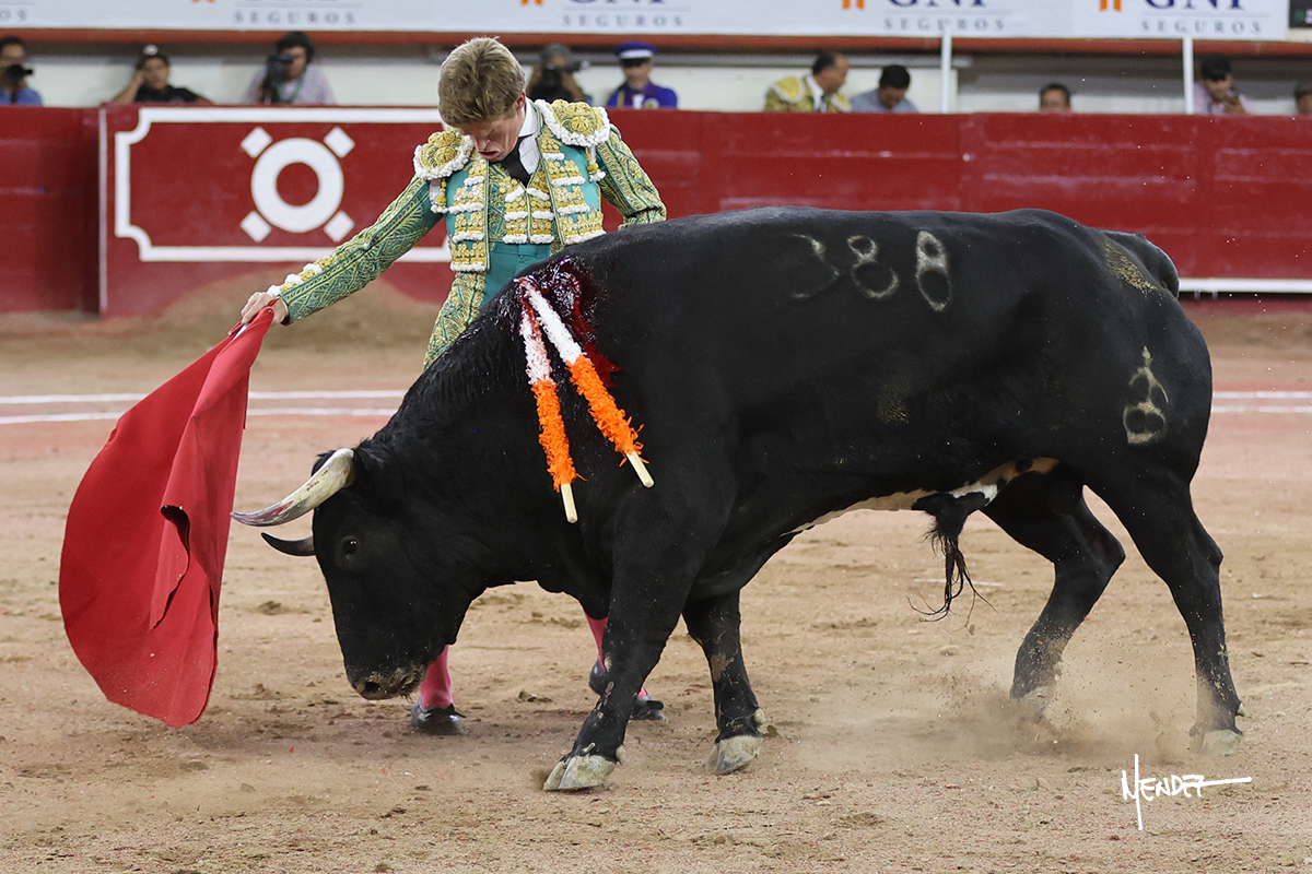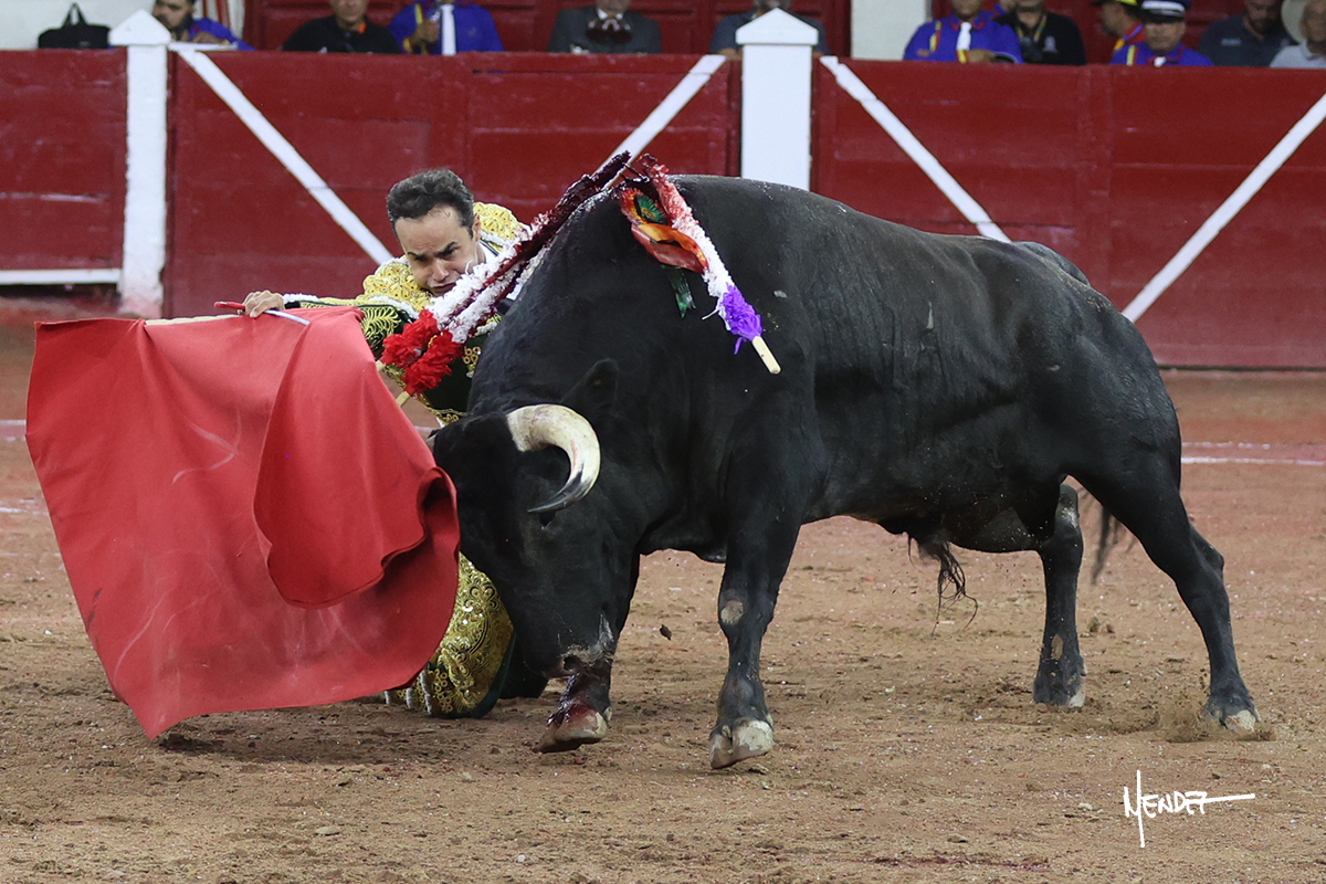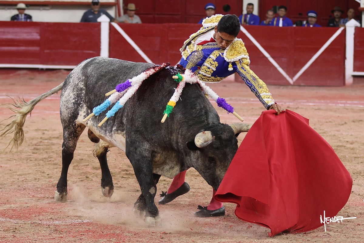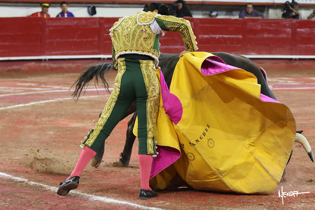 Juan Pablo Sánchez lo bregó y llevó hasta los medios, luciéndose en su remate con una media. Al igual que se pudo lucir en el quite. Se cambió el tercio y comenzó la faena de muleta, después de que el diestro brindara ante los micrófonos de Unicable. Después, se dirigió a los medios y de rodillas empezó a torearlo, envolviéndoselo, aprovechando la inercia para darle ritmo a su inicio. Se mantuvo en aquellos terrenos para continuar sobre el derecho de un toro algo incierto, pero que seguía el engaño y con el que pudo completar aquella serie. Le dio tiempo y sitio antes de retomar el mismo pitón, adornándose con variedad. Se la dejó puesto y esperó la embestida para correrle mano con temple, despaciosidad y abandono. Juan Pablo siguió dosificando, pero una vez que tomó la muleta con la izquierda, lo pasó a media altura en largo, mientras que sonaba la “Pelea de Gallos”. Cambió a la derecha para pasarlo a su antojo, ayudándolo, pero también sometiéndolo para cuajar su faena. Se impuso y supo qué teclas tocar para llevarlo cosido. El animal ya se había venido a menos, a pesar de mantenerlo en los medios. Culminó con unas manoletinas, pero pinchó su faena.