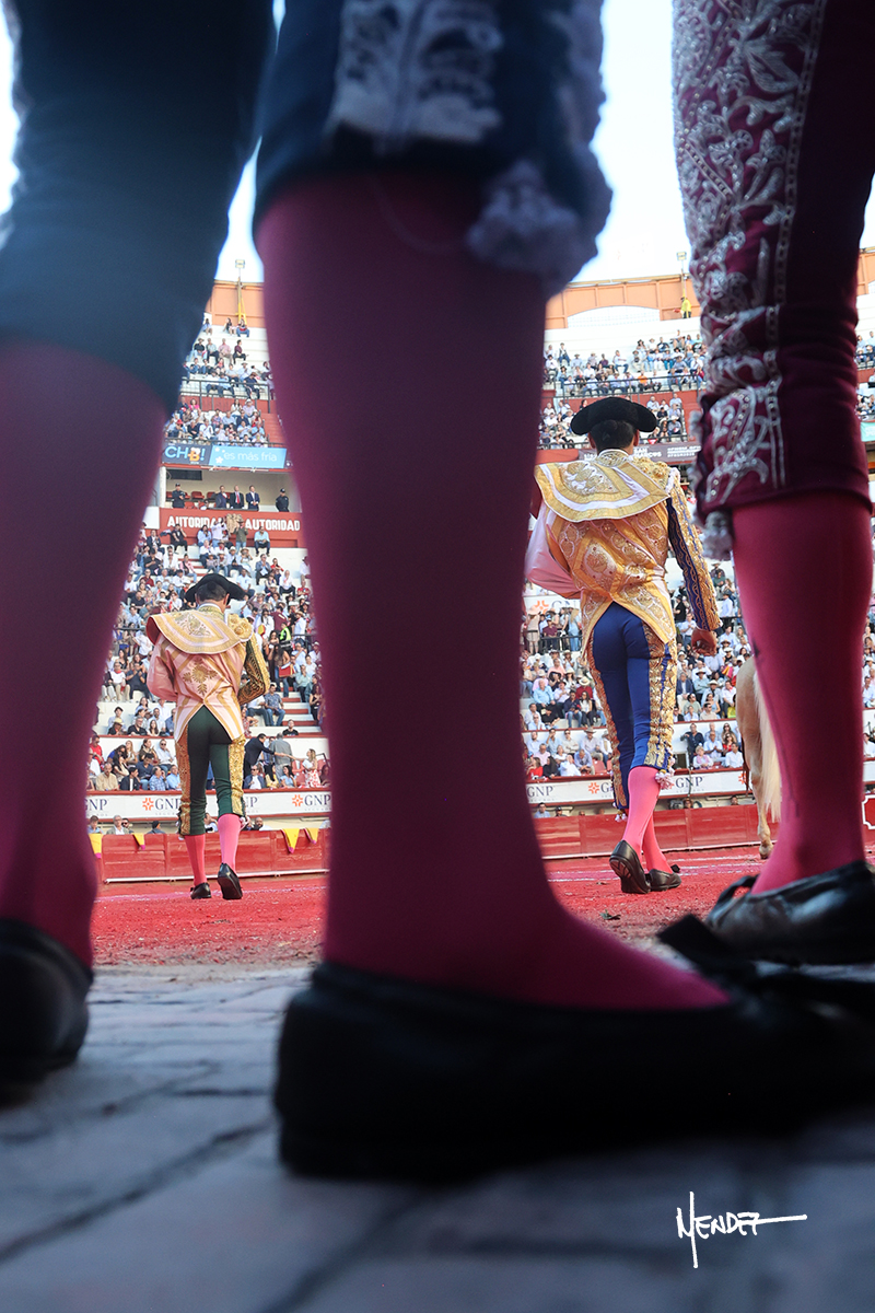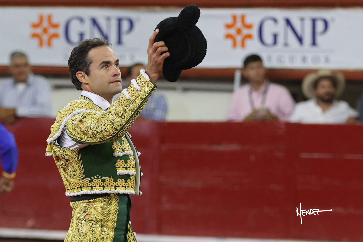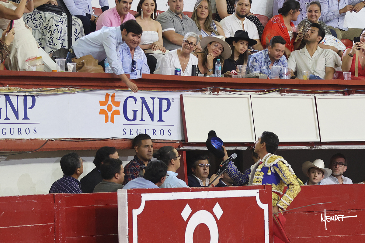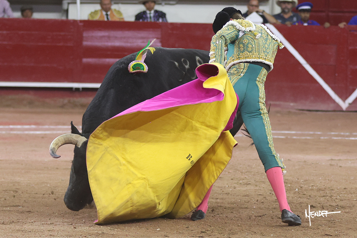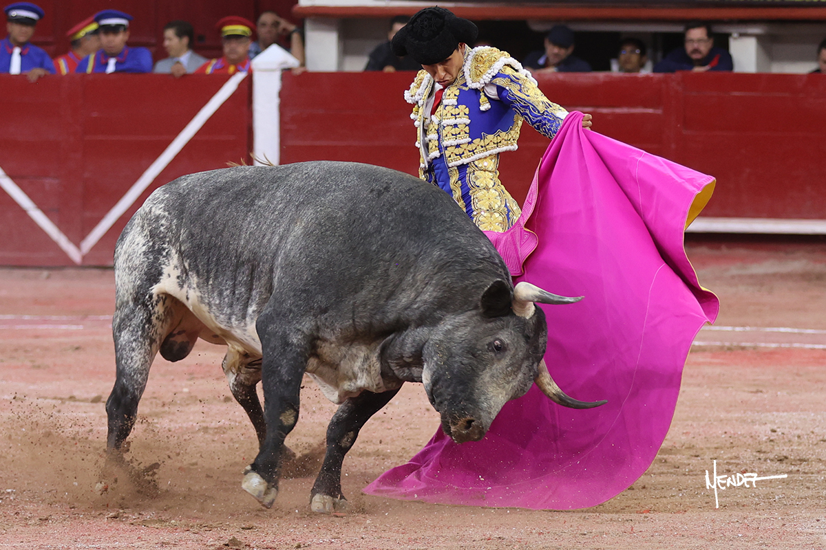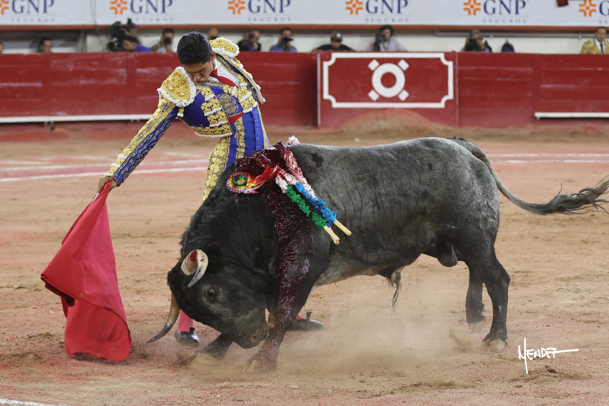 Juan Pablo Sánchez lo bregó y llevó hasta los medios, luciéndose en su remate con una media. Al igual que se pudo lucir en el quite. Se cambió el tercio y comenzó la faena de muleta, después de que el diestro brindara ante los micrófonos de Unicable. Después, se dirigió a los medios y de rodillas empezó a torearlo, envolviéndoselo, aprovechando la inercia para darle ritmo a su inicio. Se mantuvo en aquellos terrenos para continuar sobre el derecho de un toro algo incierto, pero que seguía el engaño y con el que pudo completar aquella serie. Le dio tiempo y sitio antes de retomar el mismo pitón, adornándose con variedad. Se la dejó puesto y esperó la embestida para correrle mano con temple, despaciosidad y abandono. Juan Pablo siguió dosificando, pero una vez que tomó la muleta con la izquierda, lo pasó a media altura en largo, mientras que sonaba la “Pelea de Gallos”. Cambió a la derecha para pasarlo a su antojo, ayudándolo, pero también sometiéndolo para cuajar su faena. Se impuso y supo qué teclas tocar para llevarlo cosido. El animal ya se había venido a menos, a pesar de mantenerlo en los medios. Culminó con unas manoletinas, pero pinchó su faena.