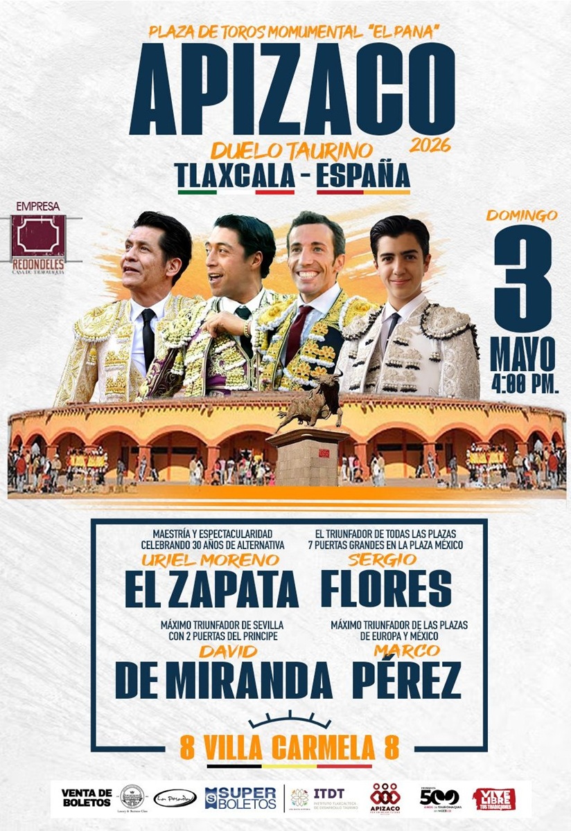 De esta manera, el cartel completo queda conformado de la siguiente forma: Domingo 3 de mayo, a las 16:00 horas. Duelo taurino Tlaxcala-España con los locales Uriel Moreno ‘El Zapata’ y Sergio Flores, así como los ibéricos David de Mirando y Marco Pérez, con ocho toros de Villa Carmela.