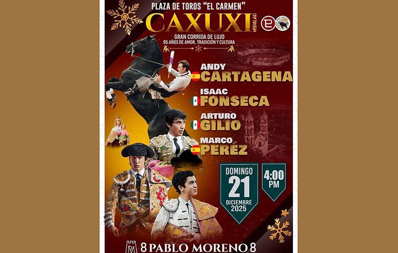 23 de octubre de 2025/Suertematador.com El Comité Taurino de la localidad Hidalguense de Caxuxi, ha dado a conocer el cartel con el que se celebrarán 95 años de Amor, Tradición y Cultura Taurina en esta localidad programado para el domingo 21 de diciembre, en la plaza "El Carmen" en la que harán el paseíllo, el rejoneador Andy Cartagena, Isaac Fonseca, Arturo Gilio y Marco Pérez, para enfrentarse a un encierro de la ganadería de Pablo Moreno. Los boletos en pre-venta constarán mil 300 pesos por persona y mil 600 en las taquillas de la plaza. La venta estará disponible en las oficinas del Comité y en las taquillas de la plaza, así como en los teléfonos vía WhatsApp 772 139 5841 y 771 691