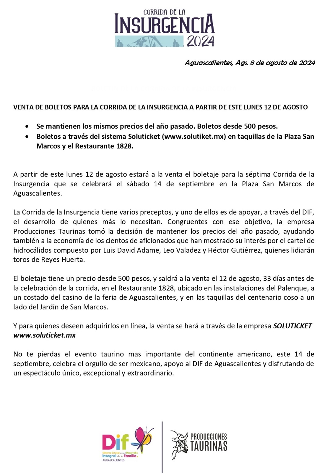 La empresa «Producciones Taurinas», en coordinación con el DIF del estado de Aguascalientes, a través de un comunicado, dio a conocer los detalles de lo que será la venta del boletaje para la II, VII en general, Corrida de la Insurgencia, a celebrarse el próximo sábado 14 de septiembre de 2024, en punto de las 18:30 horas, en el emblemático coso «San Marcos» de la ciudad de Aguascalientes. Este es el documento. ADARBO