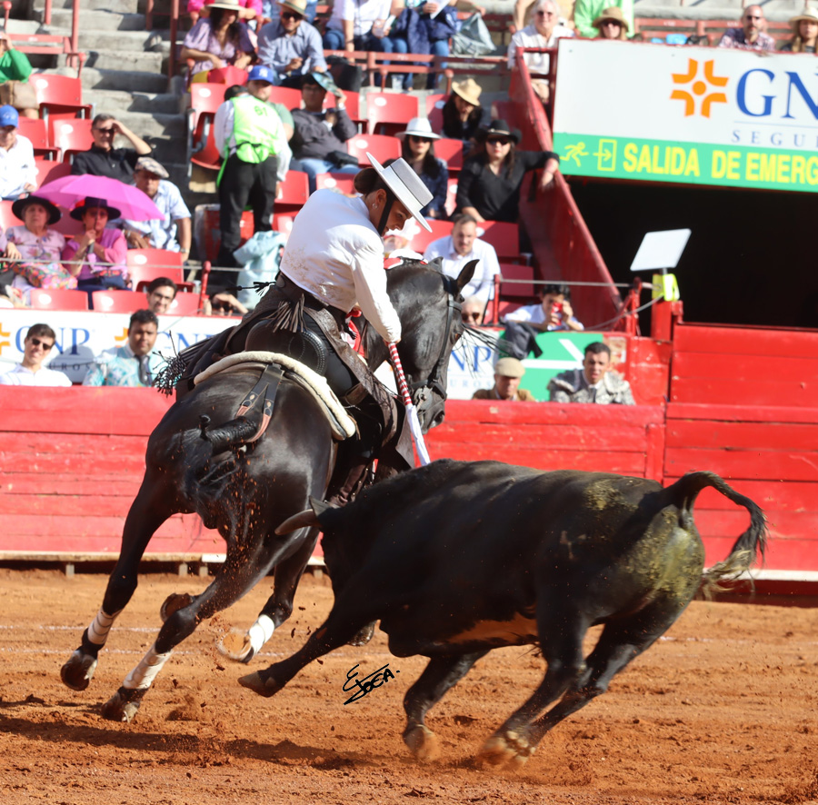 La rejoneadora capitalina con el cuarto de la tarde, «Libertad» de Marrón, número 59, cárdeno obscuro bragado meano y cornidelantero con 472 kilogramos y nacencia en agosto de 2021, montando a»Bocelli «, lo llevó toreado dejándole un rejón de castigo, con «Hebreo «, cuatro banderillas llevándolo toreado de costado, conectando con el tendido, con «Mozart «, una banderilla corta y dos rejones de muerte, como no dobló el sobresaliente Gilberto Aragón lo pasaportó de una estocada, para escuchar palmas con un entreverado aviso que le envió el Juez de Plaza don Enrique Braun y su Asesor don Miguel Angel Arroyo, palmas al burel en el arrastre.