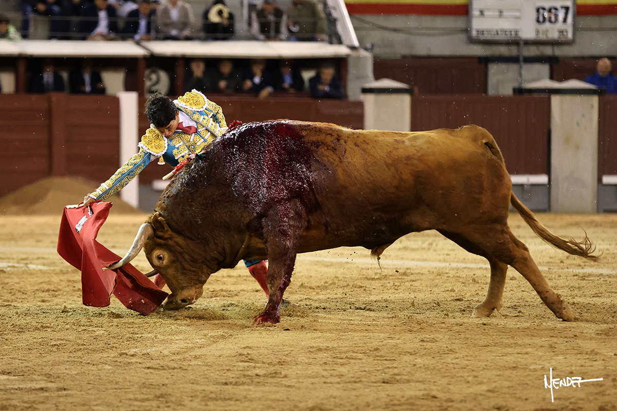 Isaac Fonseca saludó al primero de su lote y tercero de la tarde, llevándolo en una brega de avisos. El inicio de faena fue de muchas teclas, tratando de buscar los terrenos, la altura y distancias de aquel comienzo pasado por agua. Le dio tiempo y sitio para seguir sobre el pitón derecho, muy despacio, uno a uno, pasando a un toro sin opciones. Decidió insistir y seguir pasando a un ejemplar imponente pero vacío. Andaba detrás de la tela, pero Fonseca quiso alargar, alternando pitones, un pase tras otro, tratando de sacar lo poco que tuviera.