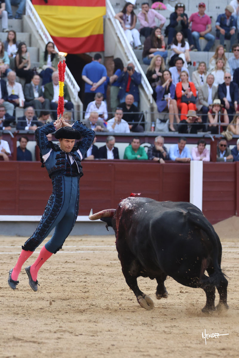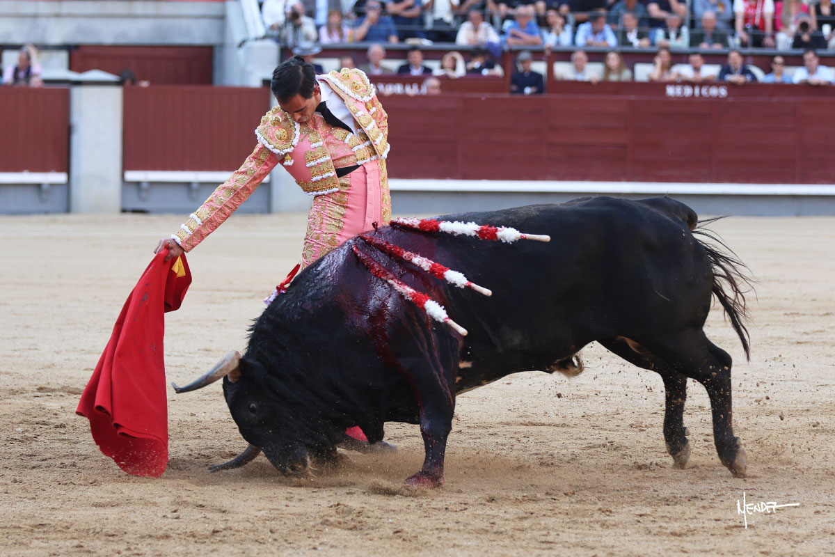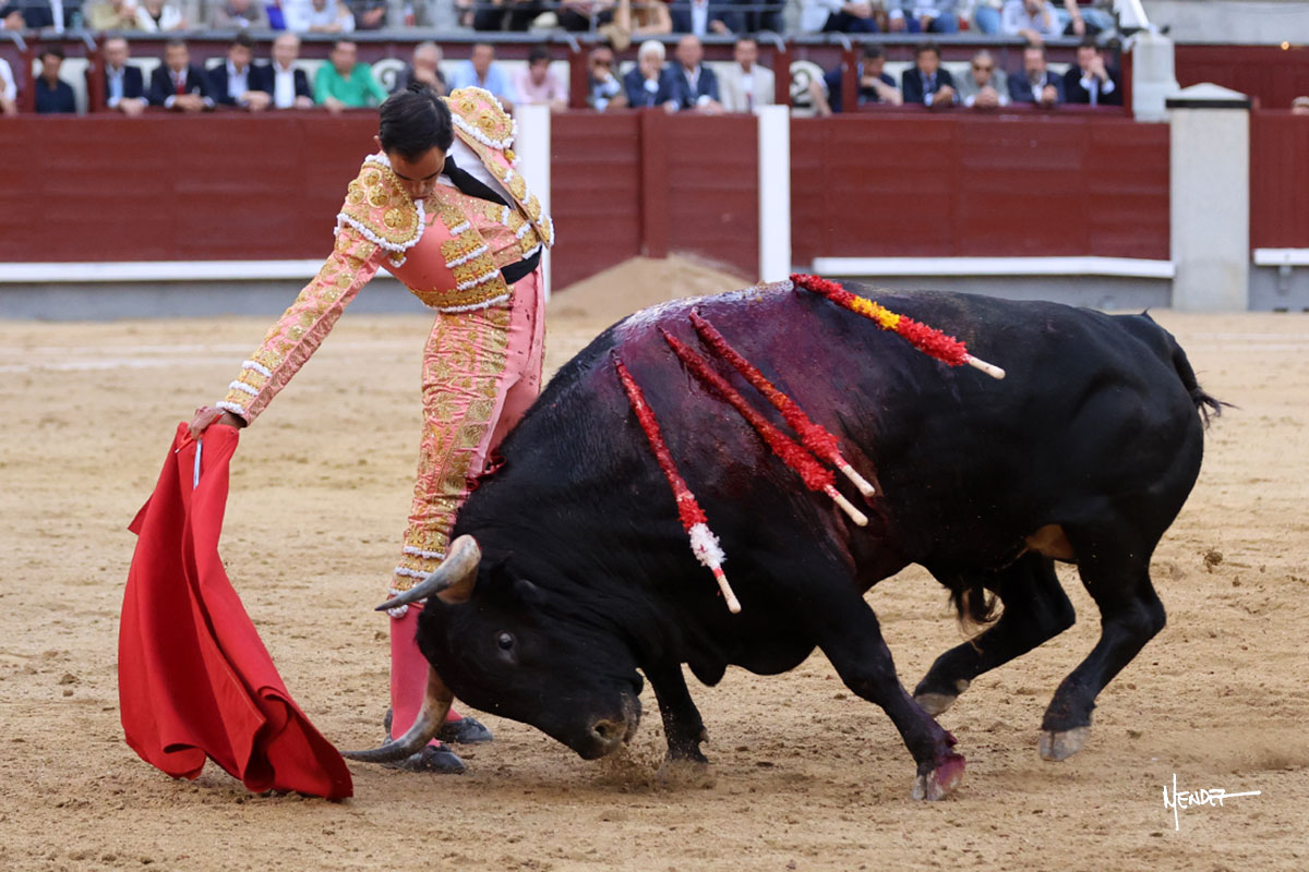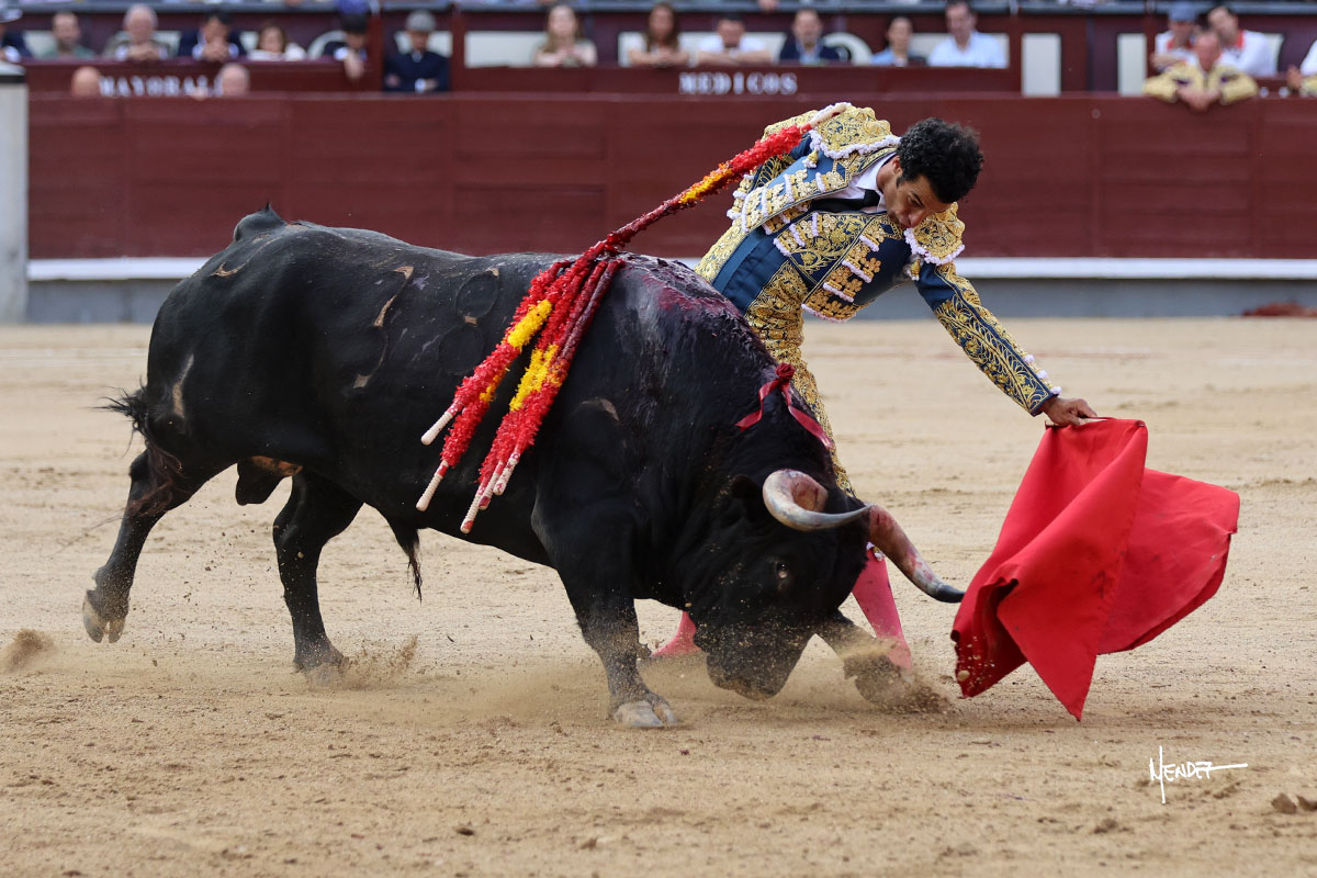 Fortes se estiró con gusto y torería ante el segundo de su lote. Inició la faena pasándolo por ambos pitones, bajándole la mano mientras le iba ganando terreno con temple y despaciosidad. Siguió sobre el derecho, asentado, totalmente encajado, pasándoselo alrededor de la cintura, con cadencia, como si fuera a cámara lenta. El animal siguió el engaño humillando y colocando la cara, logrando completar una tanda con ritmo y ligazón. Se la dejó puesta y arrastró por abajo, envolviéndoselo, llevándoselo a la cintura. También tuvo que aguantar parones y cambios de ritmo, sobre todo en las tandas por el izquierdo, teniendo que tragar en aquel toreo largo y profundo en el que uno a uno cuajó una tanda de naturales a base de verdad y verticalidad con la que puso de acuerdo a los tendidos. Quiso alargar con una tanda más por el derecho, apurando las distancias, cruzándose, tocándolo en el hocico y tirando del animal. Deslució su exquisita labor con los aceros.