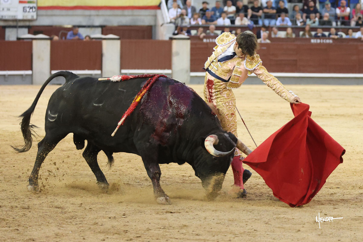 Morenito de Aranda salió al tercio para saludar al cuarto de la tarde, con el que se estiró cerca de los medios a la verónica. Tomó la muleta, le cambió los terrenos, lo metió en la tela y pudo desarrollar un inicio ligado y con emoción con el que la plaza empezó a gritar sus «olé». Le dio tiempo y sitio, para después seguir sobre el derecho, viéndose sorprendido en un derrote seco al meterse por dentro. Cambió al natural, tocándolo con firmeza y mucha voz, reestructurando, para poder llevarlo en una serie por el izquierdo de cierta transmisión. Los primeros pases eran más rectilíneos, después les daba mayor profundidad y largura. Se vio prendido al desarmarlo el de Arauz de Robles, quedando a merced de un ejemplar del que salió ileso. Cambió al pitón derecho, jugándosela, pisando terrenos comprometidos, sabiendo que el animal lo buscaba. Se acabó haciendo con el, imponiéndose aquella incertidumbre a la que remató por abajo. Falló con el acero.