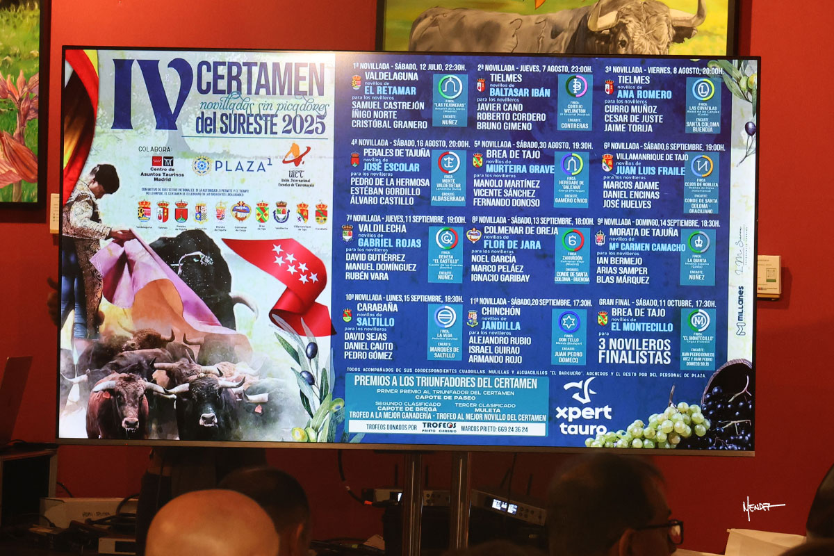 La Sala Antonio Bienvenida de la plaza de toros de Las Ventas ha acogido este viernes 23 de mayo la presentación de una nueva edición del Certamen de Novilladas sin picadores del Sureste. Esta es una versión ampliada y mejorada de lo que antiguamente era el certamen de la Ribera del Tajuña, cuyo alma mater sigue siendo José Andrés González. El acto estuvo presentado y dirigido por los periodistas Natalia Pescador y Gonzalo Bienvenida. Ambos explicaron la relevancia de un certamen como este, puesto que supone una auténtica oportunidad para los novilleros que empiezan su camino. En esta ocasión, se desarrollarán un total de 12 novilladas en 10 municipios desde el mes de julio hasta octubre. Además, contará con la participación de 33 novilleros, que representarán a 22 escuelas y que se medirán a los ejemplares de 12 hierros diferentes.