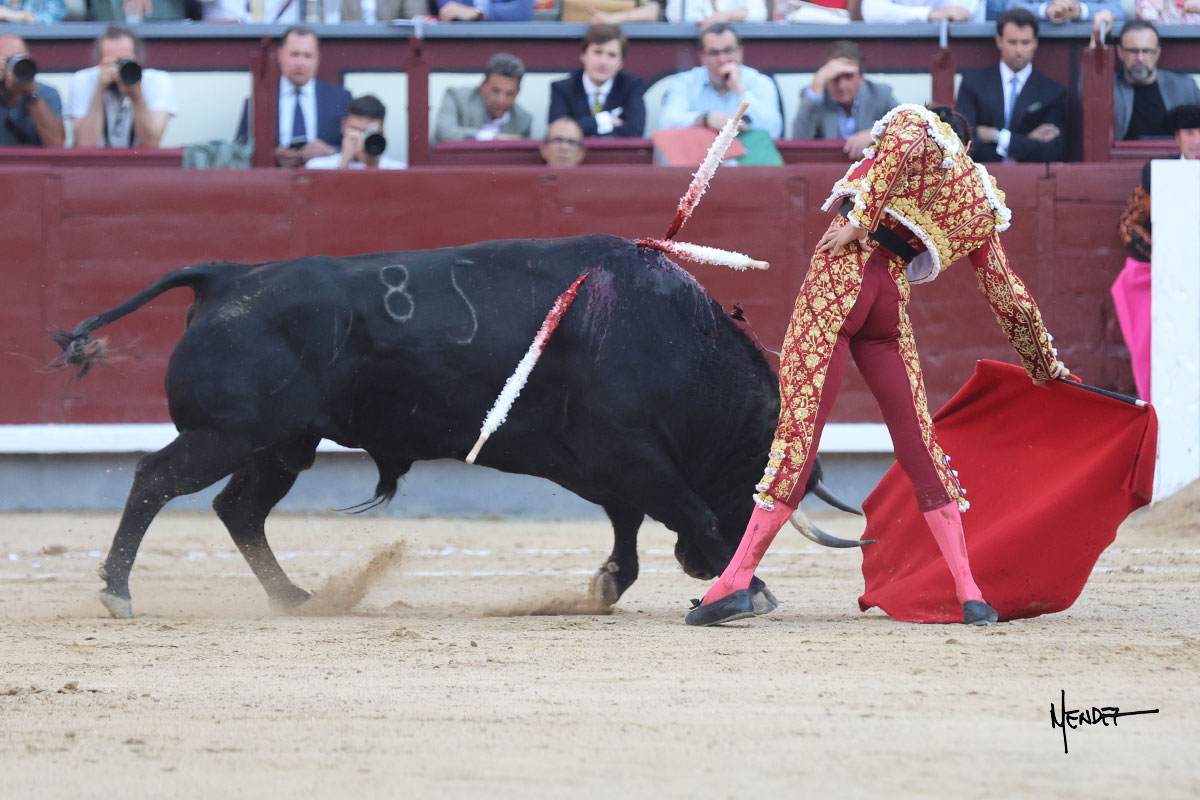 Urdiales se estiró despacio con el segundo de su lote. Lo sacó el riojano de tablas con habilidad y se lo llevó más allá del tercio en su comienzo de faena. Siguió sobre el pitón derecho, echándole los vuelos a la cara y tirando del animal en tandas cortas en las que pudo aprovechar la movilidad del de El Torero. Le dio sitio y con paso largo empezó a llevarlo, envolviéndoselo a la cadera, teniendo que pulir aquellas salidas por alto con las que soltaba la cara. Le bajó la mano, aunque sin excederse. Cambió al natural, con pases a media altura, sin que el ejemplar se entregara. No hubo acople entre ambos, produciéndose un pase tras otro carente de emoción y contenido. Mató al quinto.