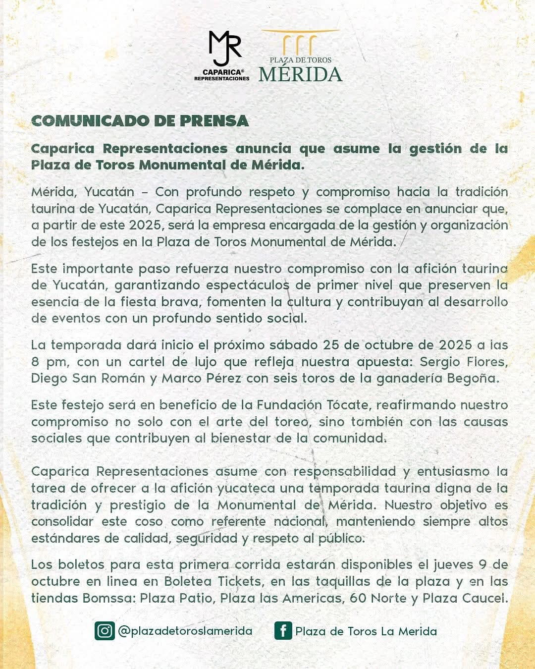 A partir de este mes de octubre la empresa Caparica Representaciones será la empresa encargada de gestionar los festejos taurinos en la Monumental de Mérida, Yucatán, reafirmando su compromiso y tradición con la afición yucateca.
