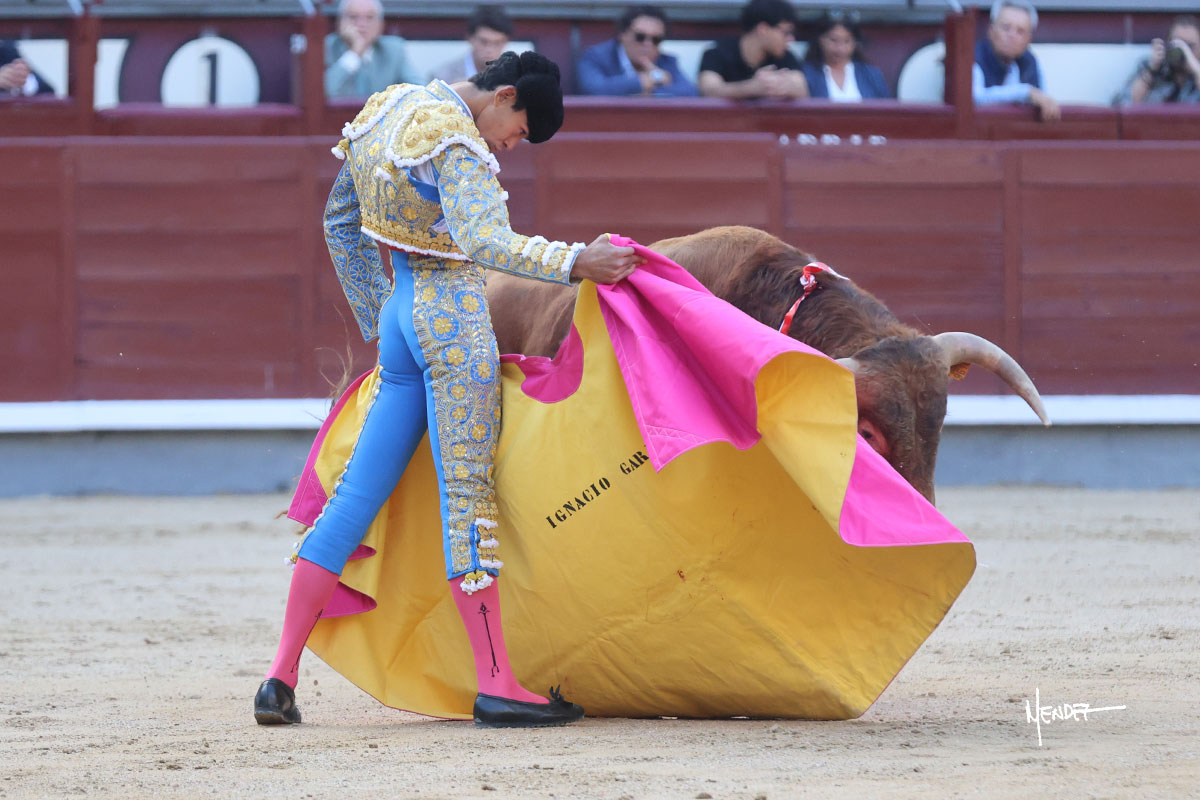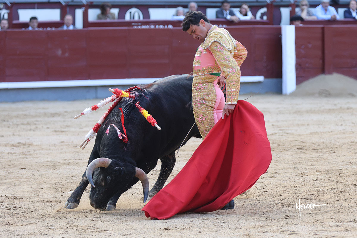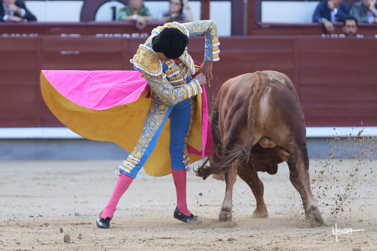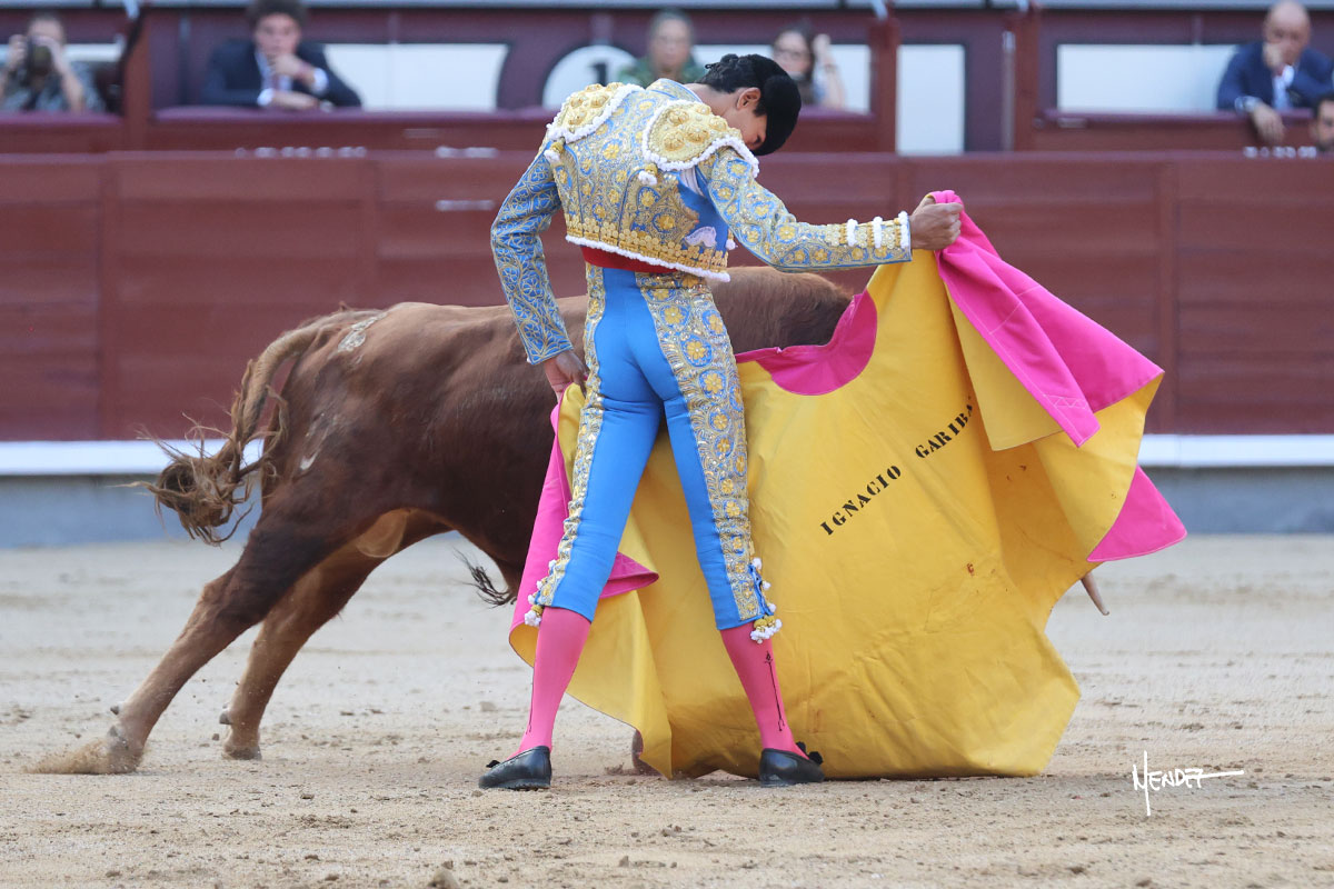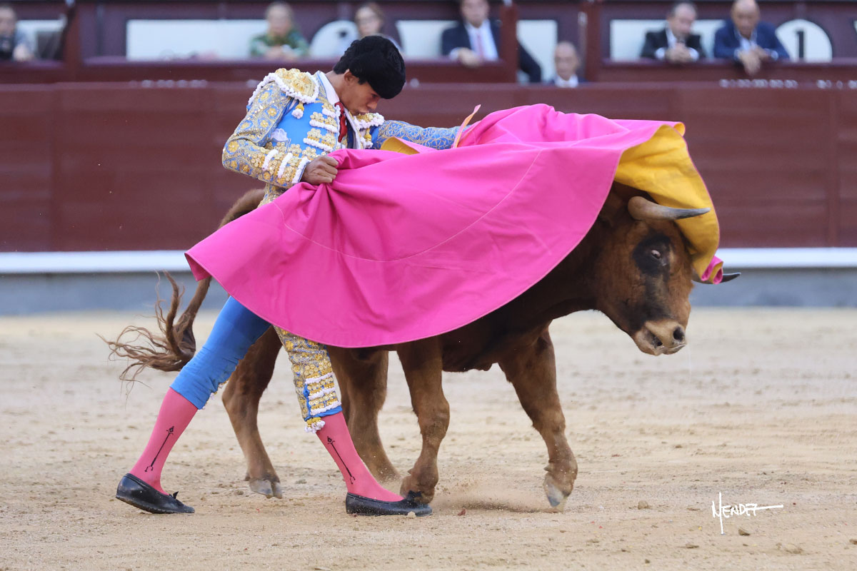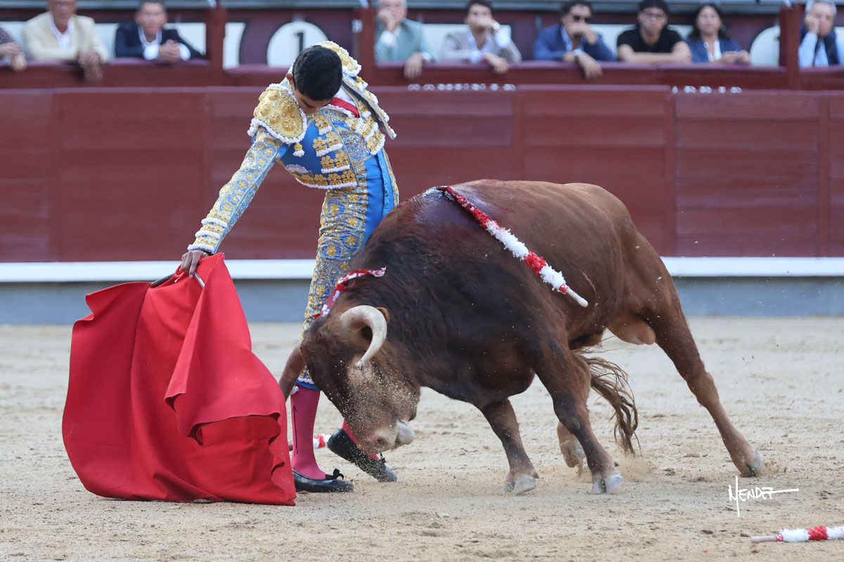 Ignacio Garibay saludó al primero de su lote y tercero de la tarde genuflexo. El animal salió suelto, pero sin deslucir, logró encelarlo en su capote y llevarlo con variedad, pudiendo estirarse con gusto y elegancia. Después de brindar al respetable, lo recibió desde los medios, a pies juntos, citándolo en la larga distancia. Lo pasó sin rectificar ni un solo centímetro, desarrollando un inicio explosivo. Continuó en aquellos terrenos, midiendo las embestidas, buscando el acople sobre el pitón derecho, corriéndole la mano con gusto y mucha suavidad. Sin embargo, el animal cabeceaba, mostrando una embestida incómoda y con la que además lo desarmó. Garibay continuó con firmeza y seguridad, encajándose para envolvérselo al natural, pasándoselo muy cerca. Volvió a armar la muleta, teniendo que tocar con poder y mando a un novillo que cada vez miraba más y se quedaba más parado. No fue el mejor novillo, pero el mexicano se puso como si fuera bueno, pisando terrenos comprometidos.