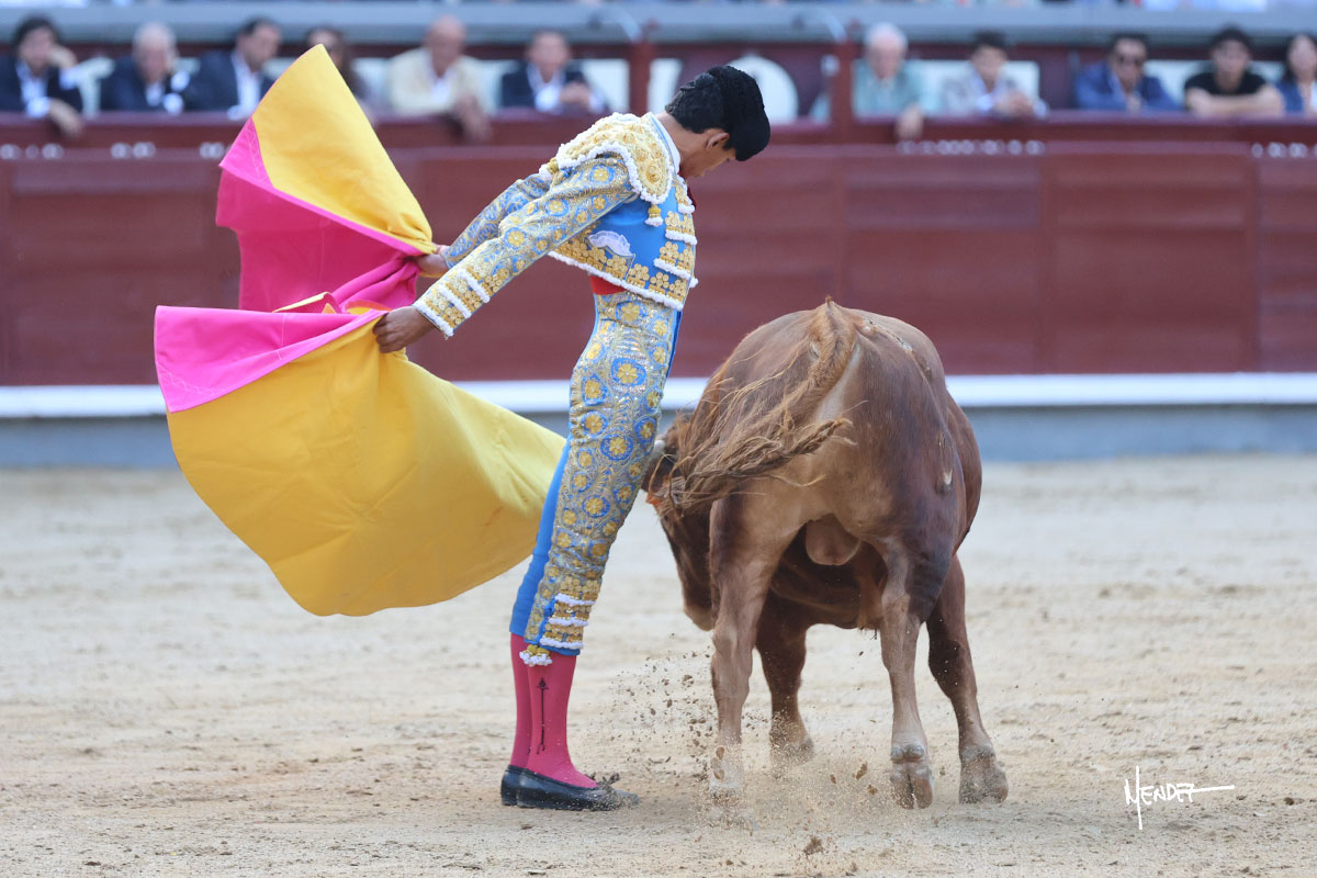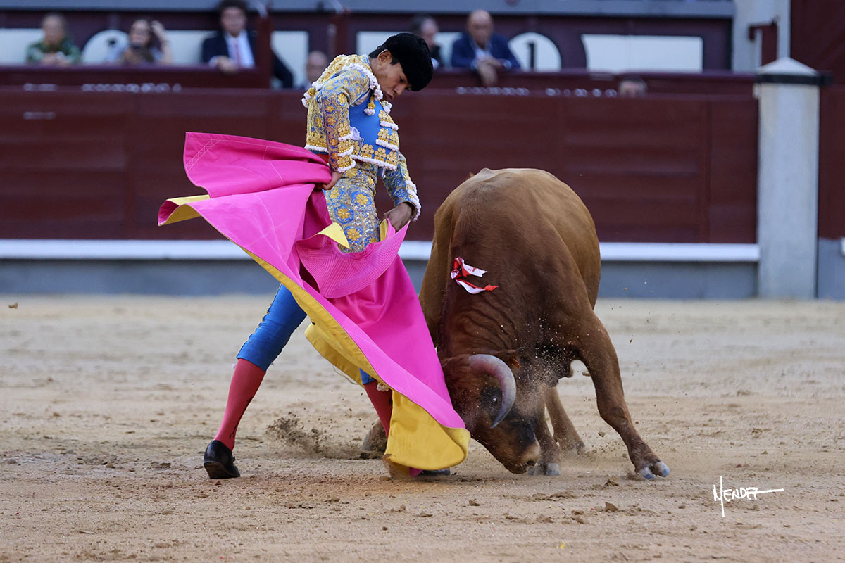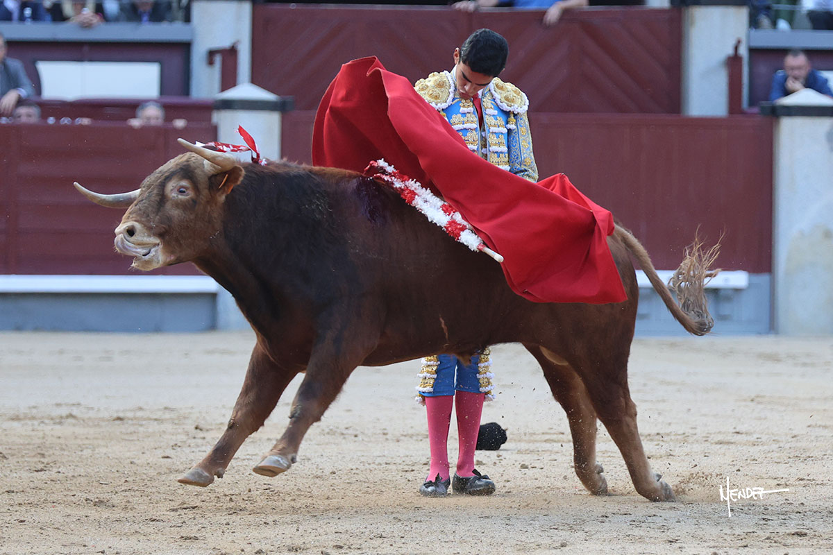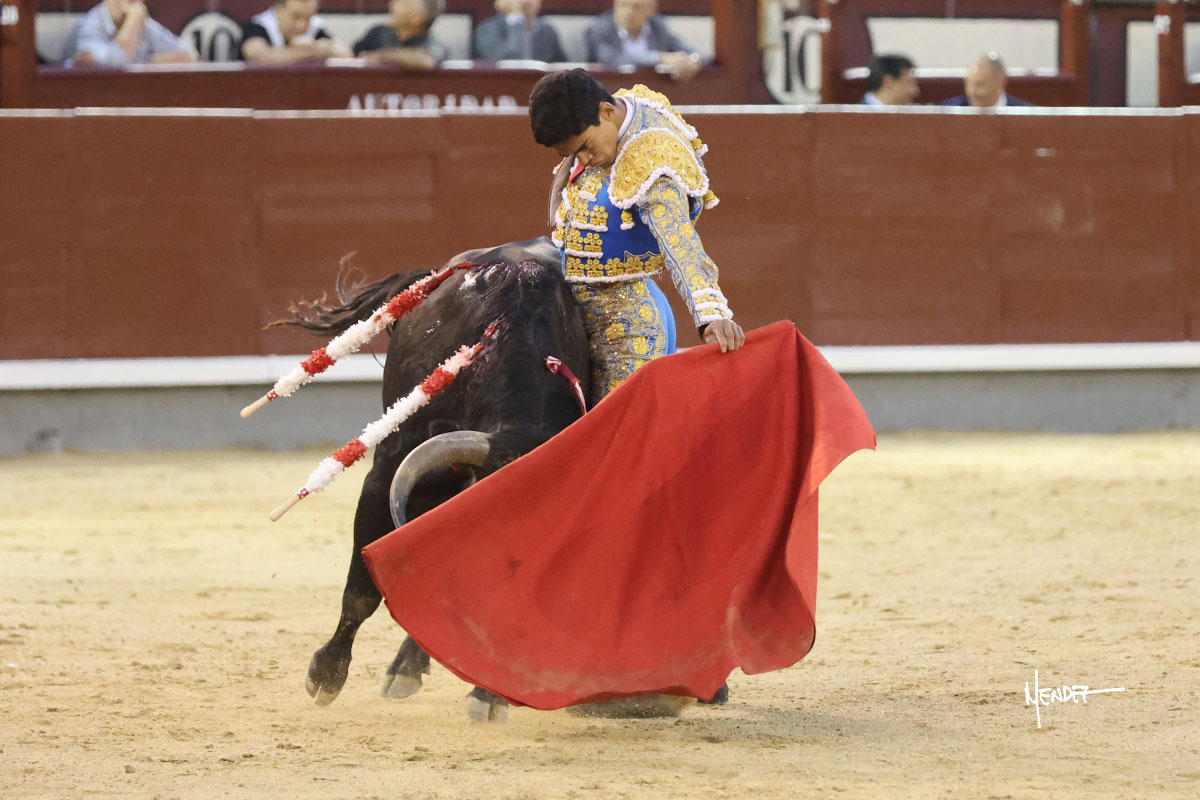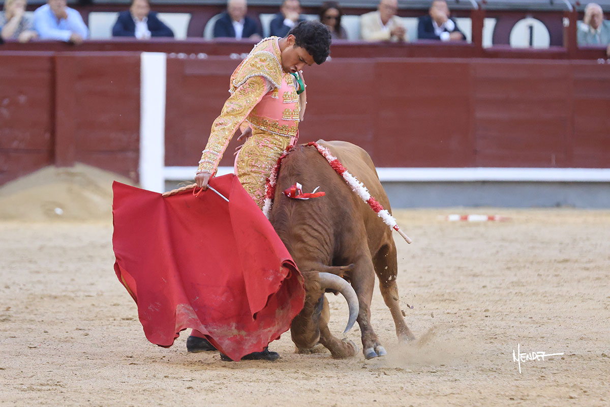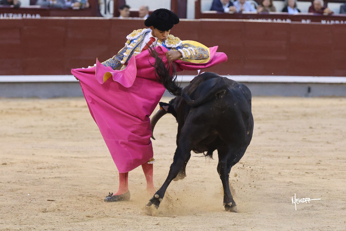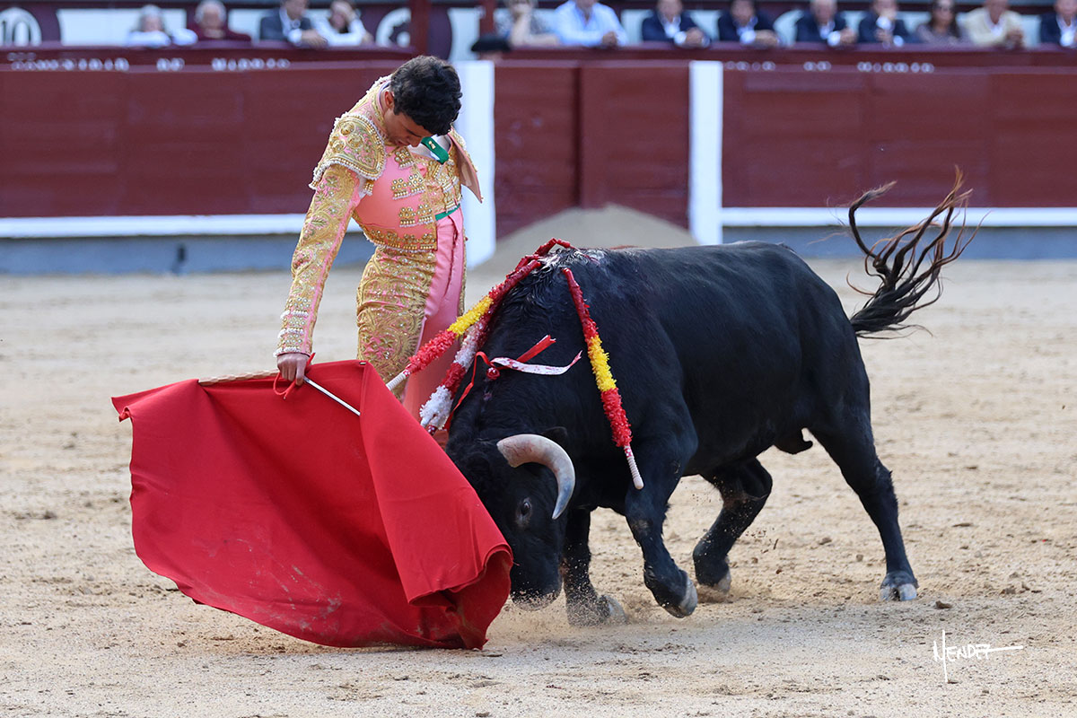 Ignacio Garibay saludó al primero de su lote y tercero de la tarde genuflexo. El animal salió suelto, pero sin deslucir, logró encelarlo en su capote y llevarlo con variedad, pudiendo estirarse con gusto y elegancia. Después de brindar al respetable, lo recibió desde los medios, a pies juntos, citándolo en la larga distancia. Lo pasó sin rectificar ni un solo centímetro, desarrollando un inicio explosivo. Continuó en aquellos terrenos, midiendo las embestidas, buscando el acople sobre el pitón derecho, corriéndole la mano con gusto y mucha suavidad. Sin embargo, el animal cabeceaba, mostrando una embestida incómoda y con la que además lo desarmó. Garibay continuó con firmeza y seguridad, encajándose para envolvérselo al natural, pasándoselo muy cerca. Volvió a armar la muleta, teniendo que tocar con poder y mando a un novillo que cada vez miraba más y se quedaba más parado. No fue el mejor novillo, pero el mexicano se puso como si fuera bueno, pisando terrenos comprometidos.