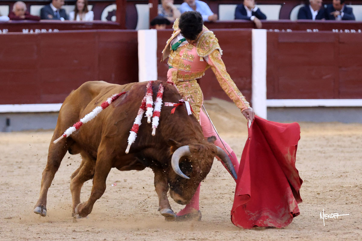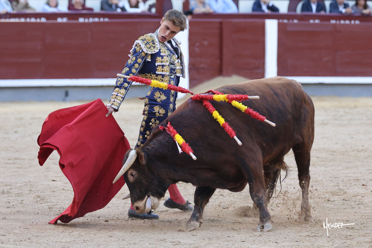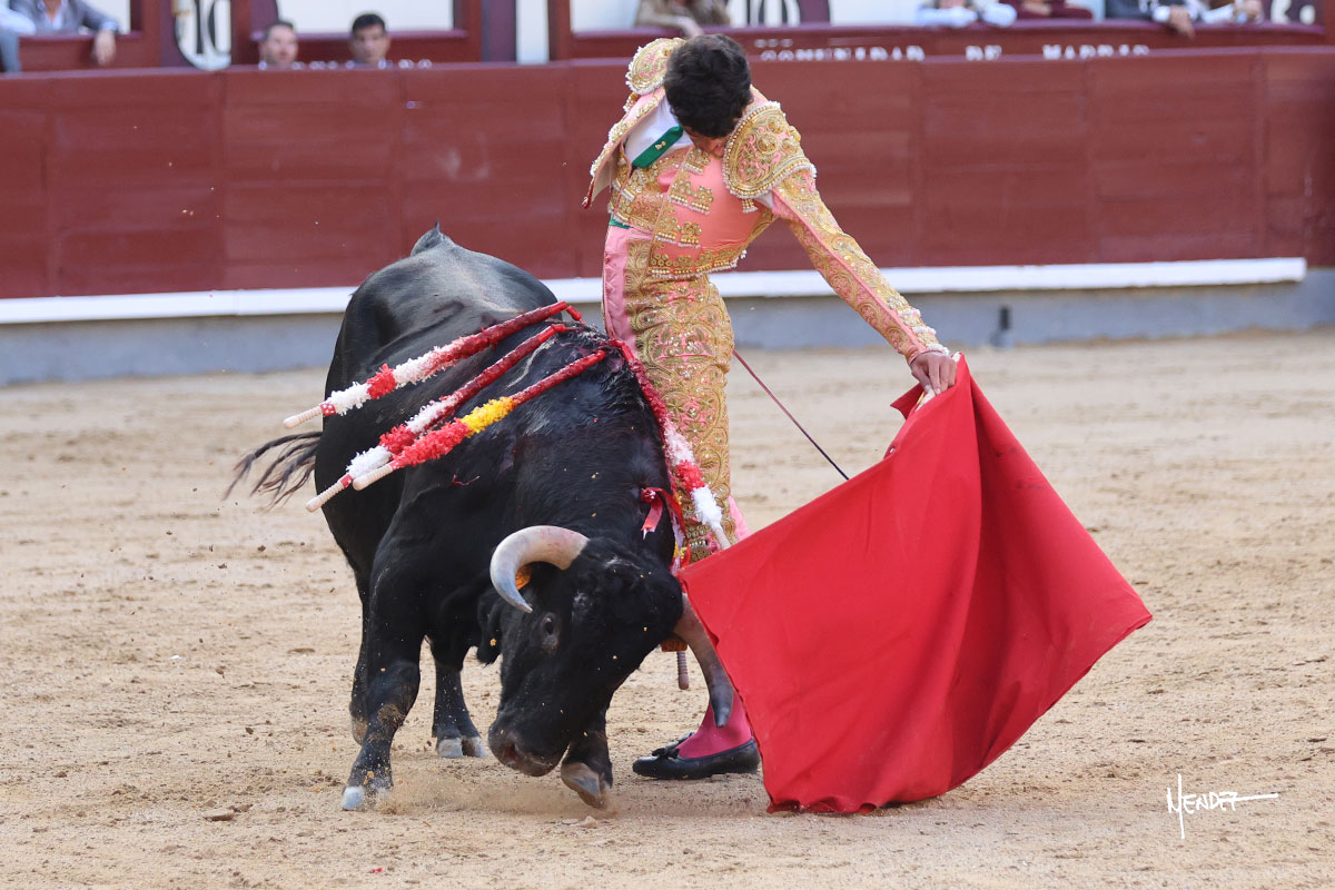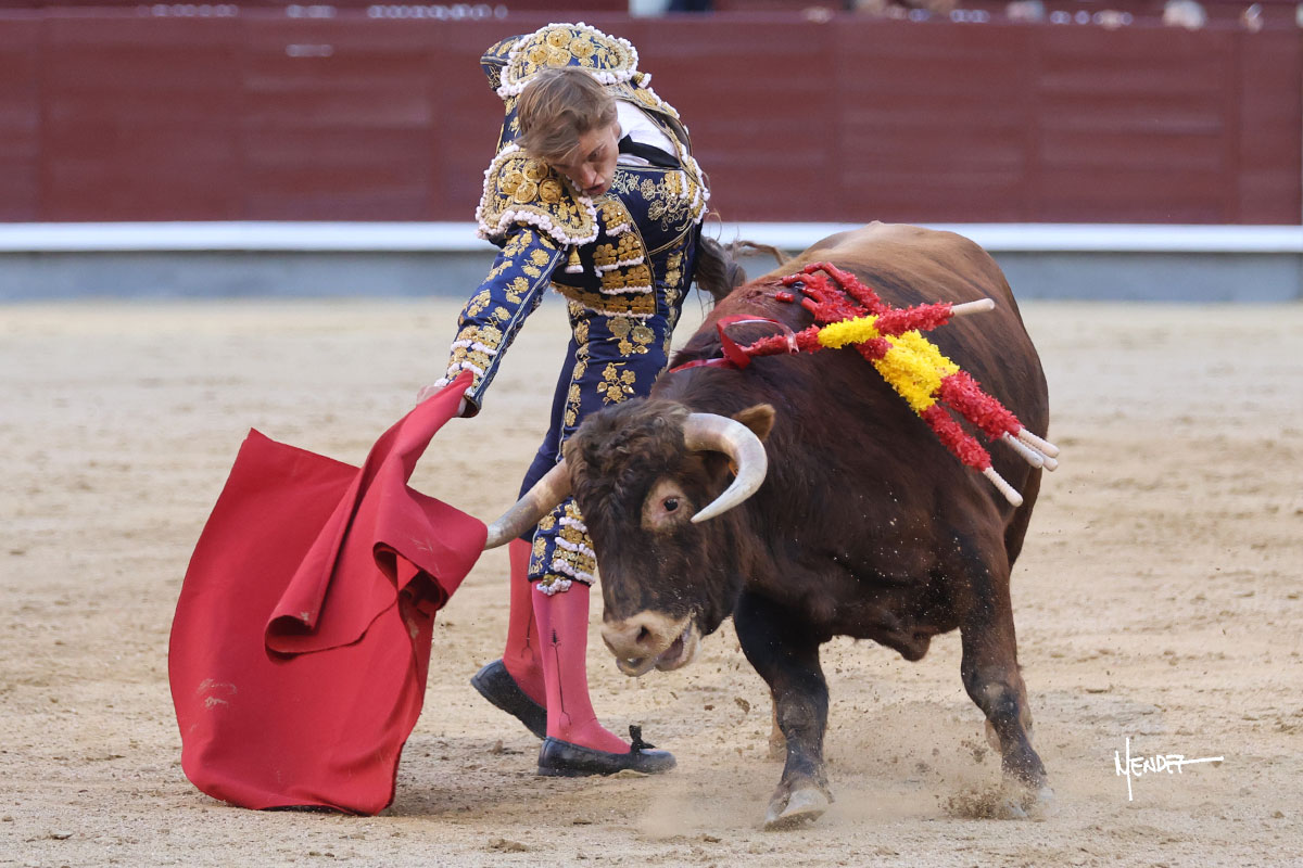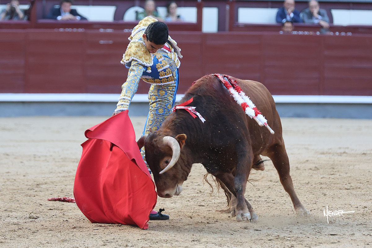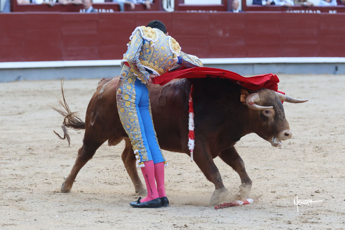 Ignacio Garibay saludó al primero de su lote y tercero de la tarde genuflexo. El animal salió suelto, pero sin deslucir, logró encelarlo en su capote y llevarlo con variedad, pudiendo estirarse con gusto y elegancia. Después de brindar al respetable, lo recibió desde los medios, a pies juntos, citándolo en la larga distancia. Lo pasó sin rectificar ni un solo centímetro, desarrollando un inicio explosivo. Continuó en aquellos terrenos, midiendo las embestidas, buscando el acople sobre el pitón derecho, corriéndole la mano con gusto y mucha suavidad. Sin embargo, el animal cabeceaba, mostrando una embestida incómoda y con la que además lo desarmó. Garibay continuó con firmeza y seguridad, encajándose para envolvérselo al natural, pasándoselo muy cerca. Volvió a armar la muleta, teniendo que tocar con poder y mando a un novillo que cada vez miraba más y se quedaba más parado. No fue el mejor novillo, pero el mexicano se puso como si fuera bueno, pisando terrenos comprometidos.