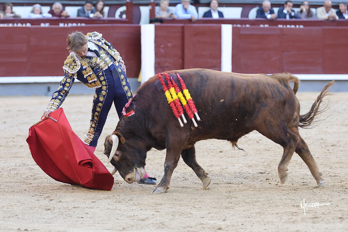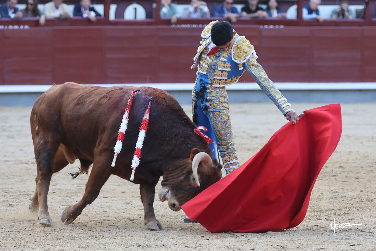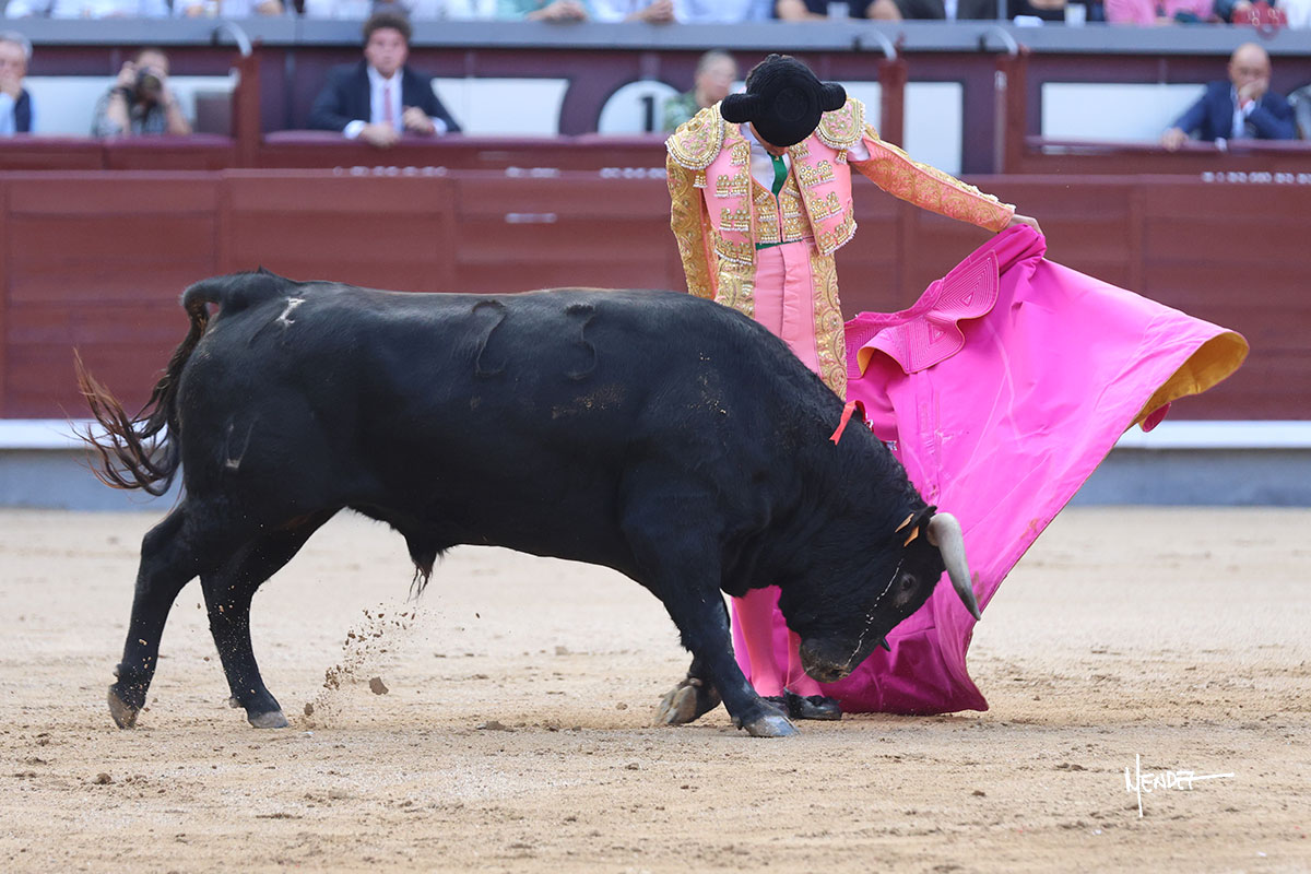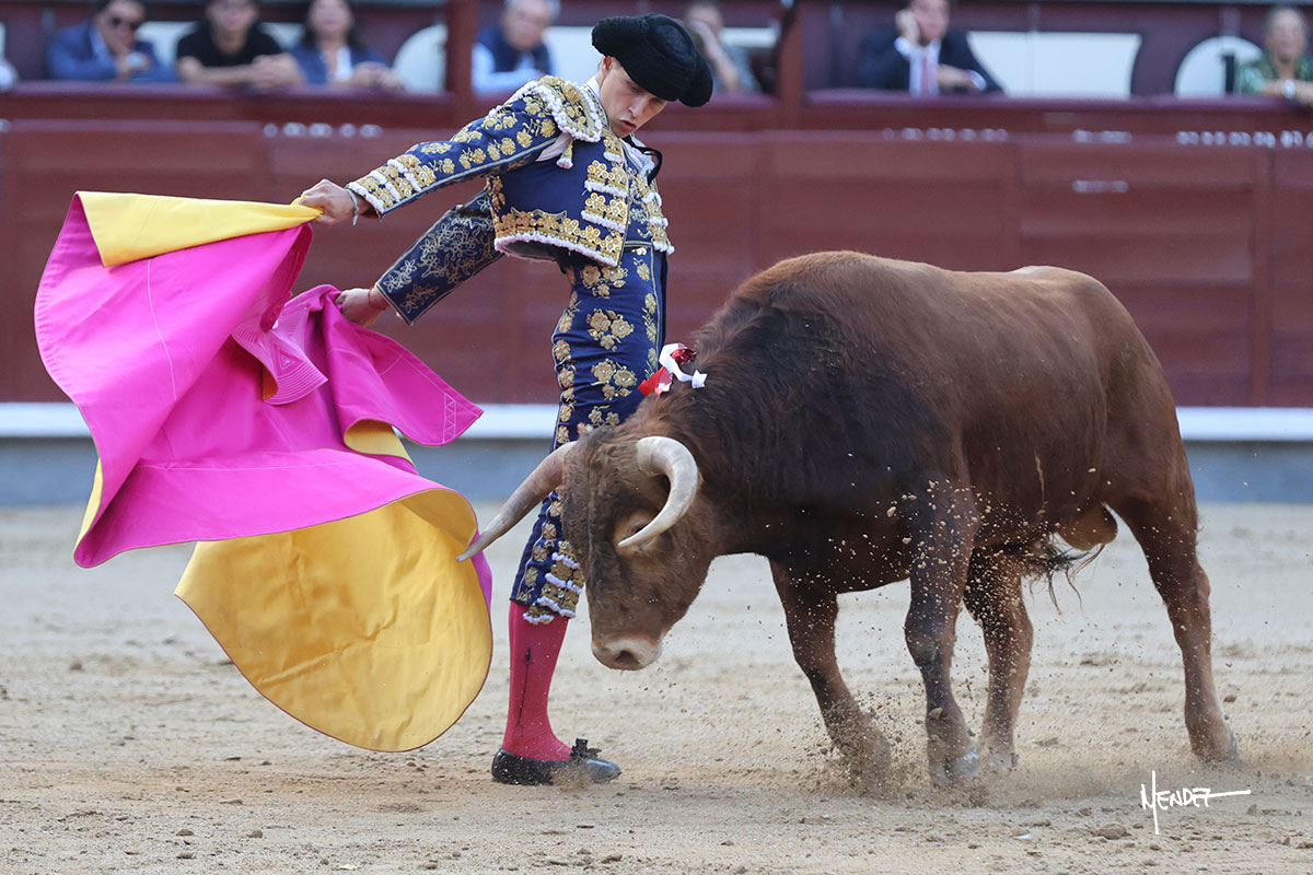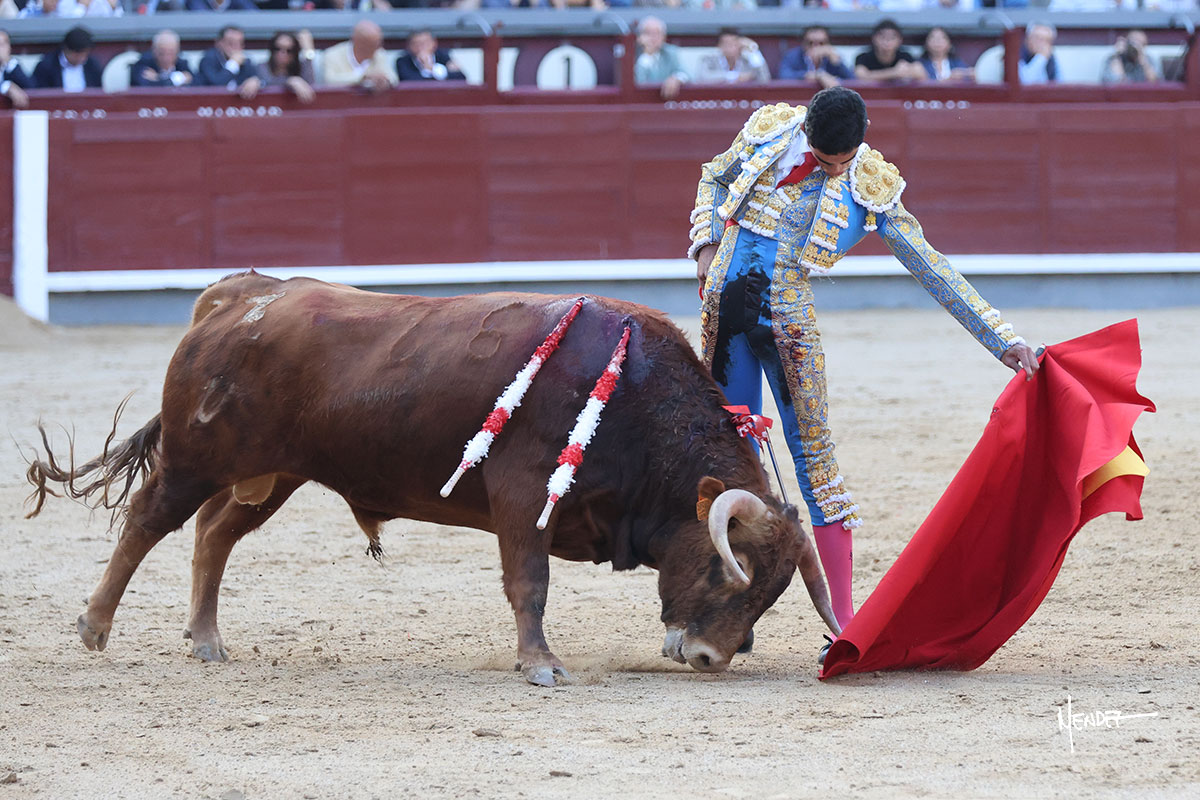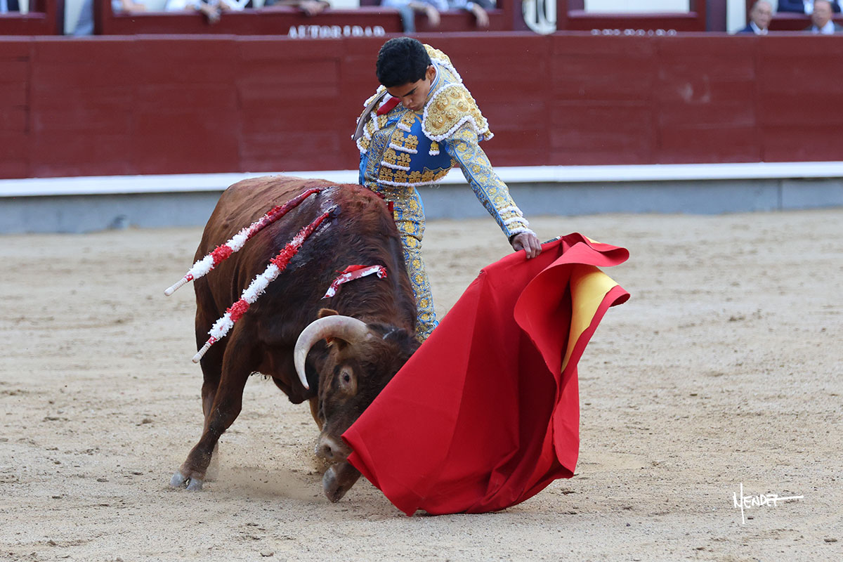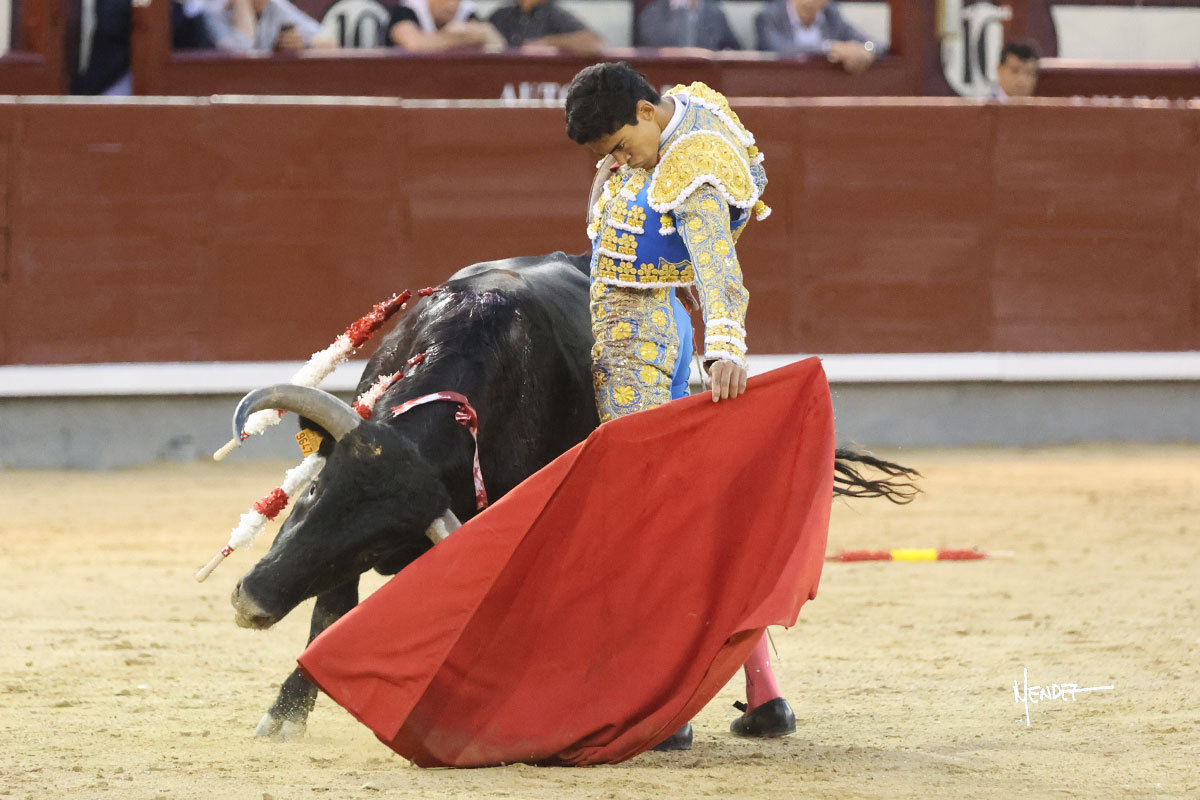 Ignacio Garibay saludó al primero de su lote y tercero de la tarde genuflexo. El animal salió suelto, pero sin deslucir, logró encelarlo en su capote y llevarlo con variedad, pudiendo estirarse con gusto y elegancia. Después de brindar al respetable, lo recibió desde los medios, a pies juntos, citándolo en la larga distancia. Lo pasó sin rectificar ni un solo centímetro, desarrollando un inicio explosivo. Continuó en aquellos terrenos, midiendo las embestidas, buscando el acople sobre el pitón derecho, corriéndole la mano con gusto y mucha suavidad. Sin embargo, el animal cabeceaba, mostrando una embestida incómoda y con la que además lo desarmó. Garibay continuó con firmeza y seguridad, encajándose para envolvérselo al natural, pasándoselo muy cerca. Volvió a armar la muleta, teniendo que tocar con poder y mando a un novillo que cada vez miraba más y se quedaba más parado. No fue el mejor novillo, pero el mexicano se puso como si fuera bueno, pisando terrenos comprometidos.