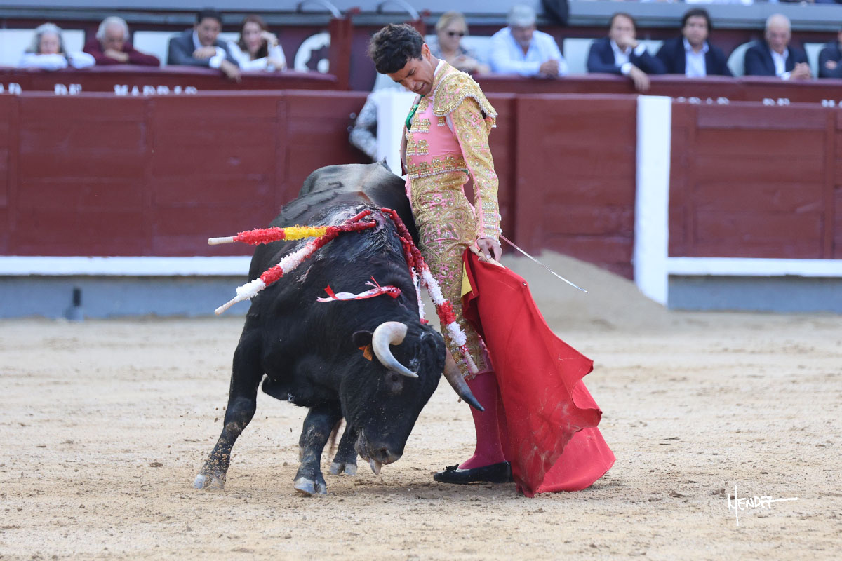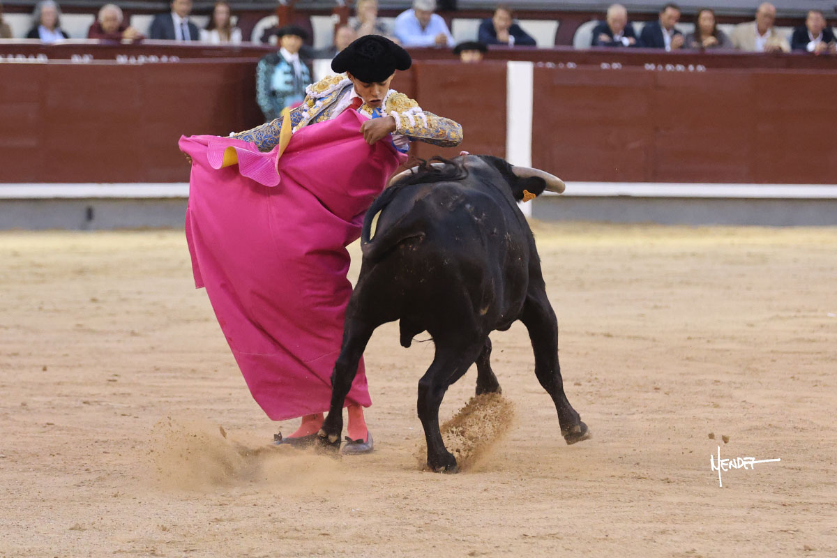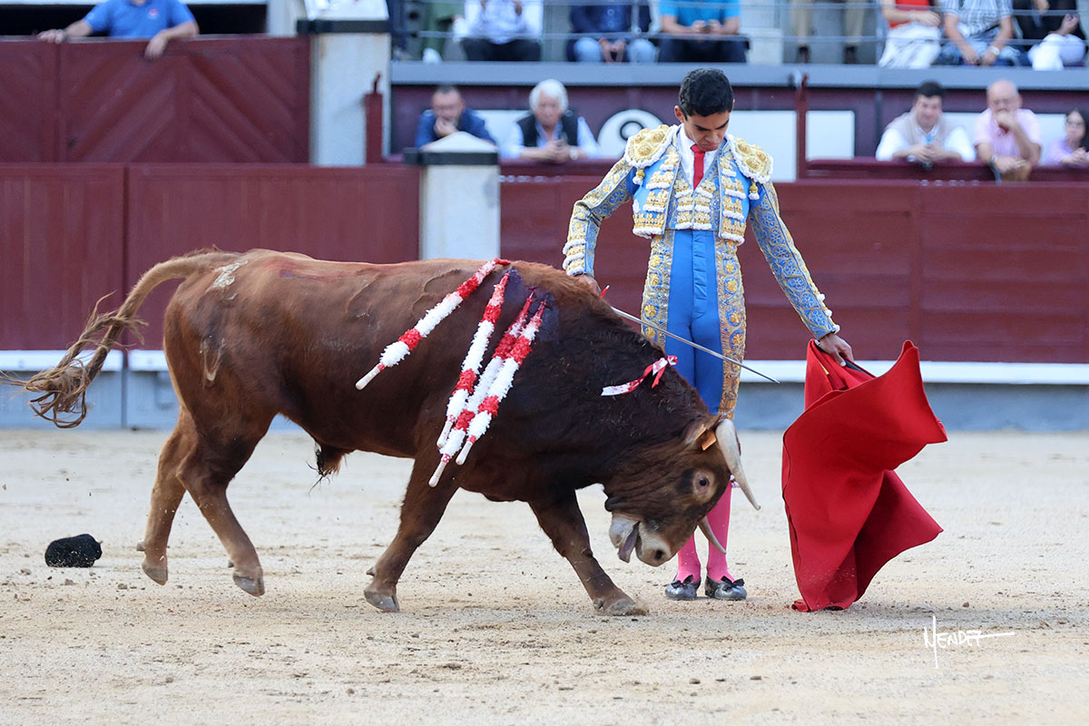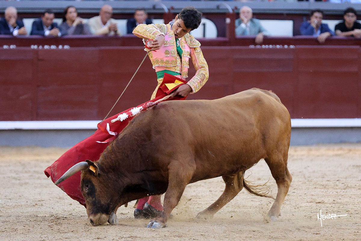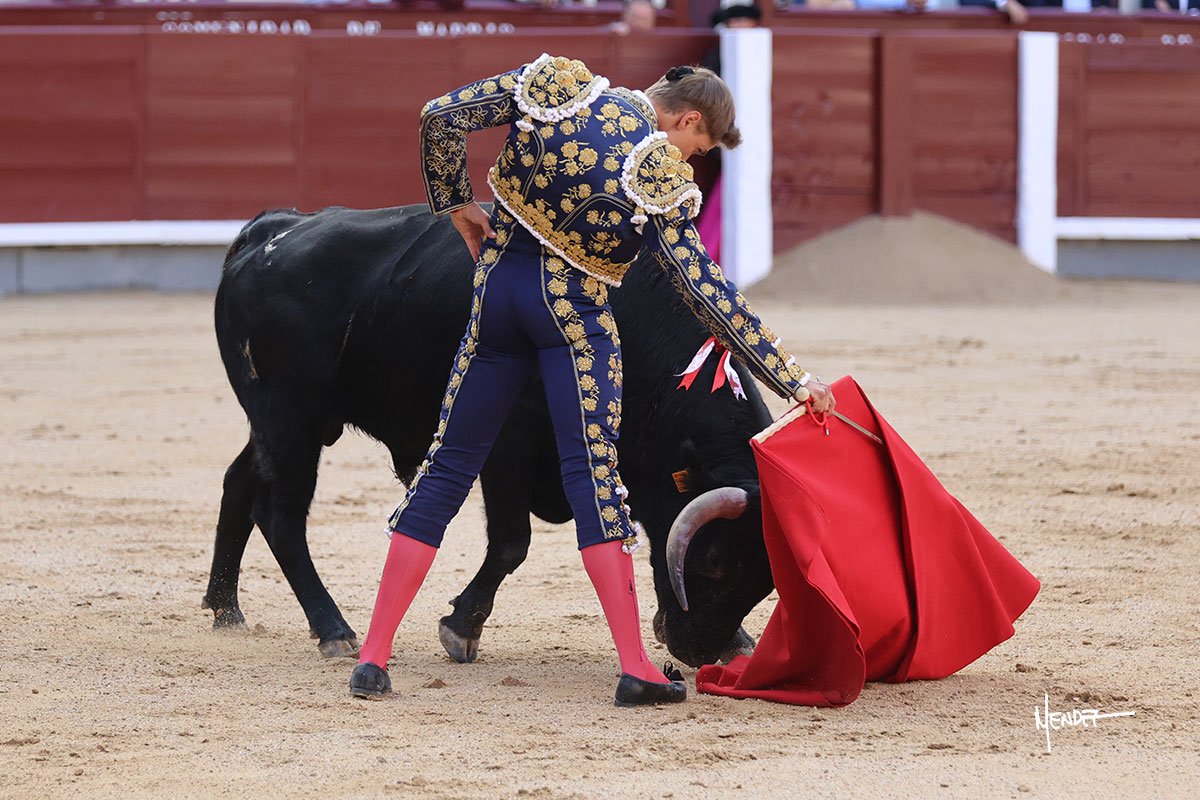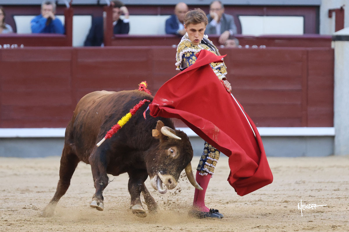 Ignacio Garibay saludó al primero de su lote y tercero de la tarde genuflexo. El animal salió suelto, pero sin deslucir, logró encelarlo en su capote y llevarlo con variedad, pudiendo estirarse con gusto y elegancia. Después de brindar al respetable, lo recibió desde los medios, a pies juntos, citándolo en la larga distancia. Lo pasó sin rectificar ni un solo centímetro, desarrollando un inicio explosivo. Continuó en aquellos terrenos, midiendo las embestidas, buscando el acople sobre el pitón derecho, corriéndole la mano con gusto y mucha suavidad. Sin embargo, el animal cabeceaba, mostrando una embestida incómoda y con la que además lo desarmó. Garibay continuó con firmeza y seguridad, encajándose para envolvérselo al natural, pasándoselo muy cerca. Volvió a armar la muleta, teniendo que tocar con poder y mando a un novillo que cada vez miraba más y se quedaba más parado. No fue el mejor novillo, pero el mexicano se puso como si fuera bueno, pisando terrenos comprometidos.